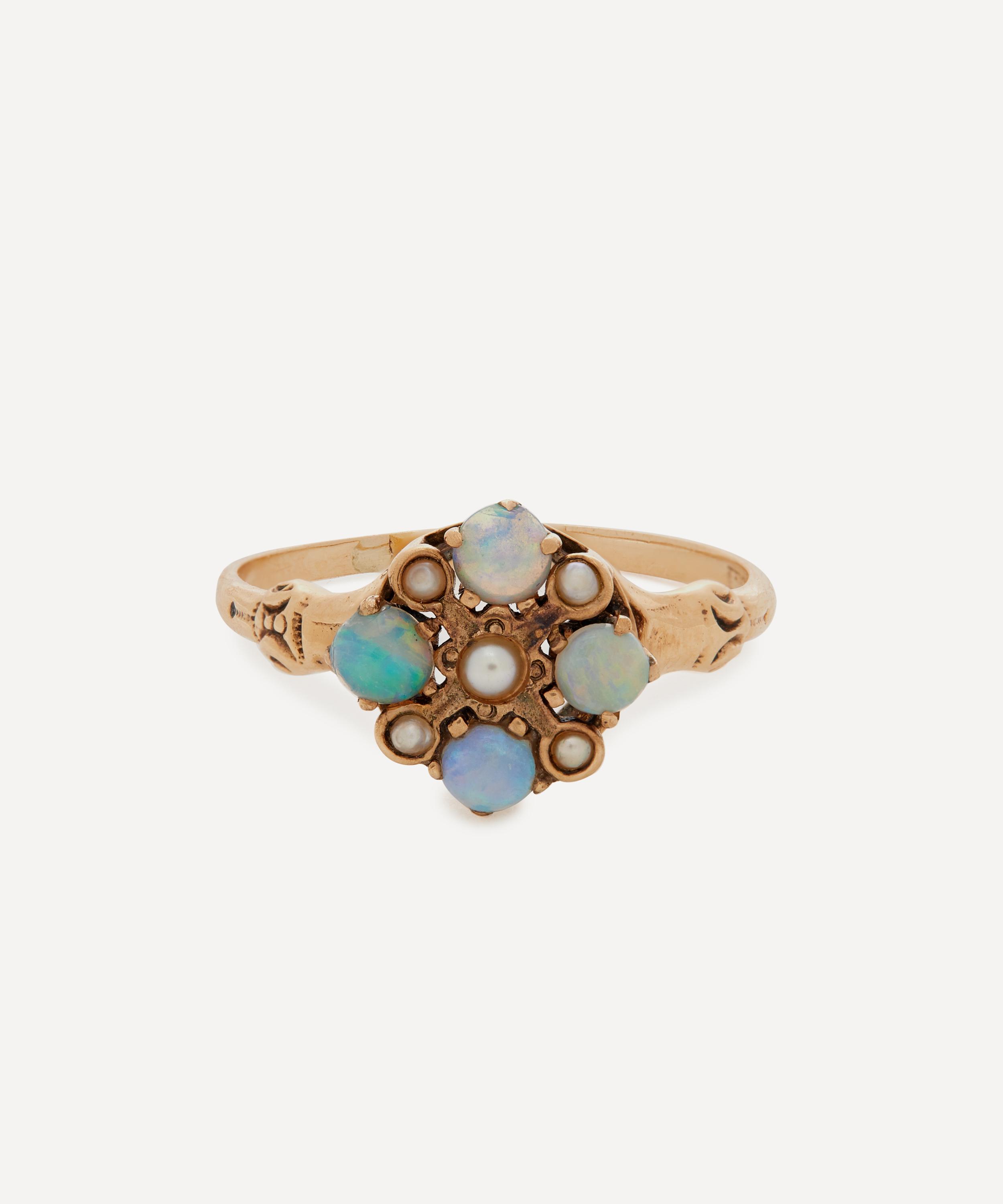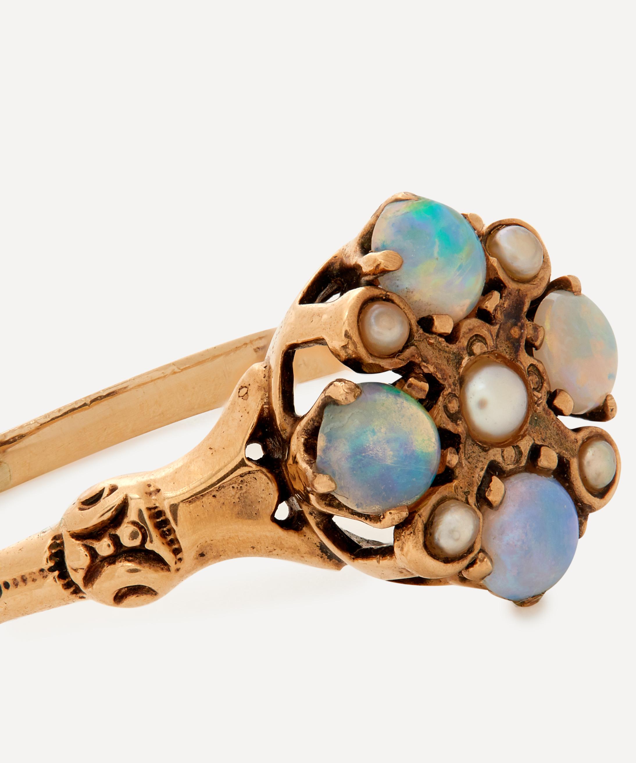 Dating back to the Victorian era, this antique ring from Kojis is a one-of-a-kind statement piece, set with lustrous opals and pearls.
