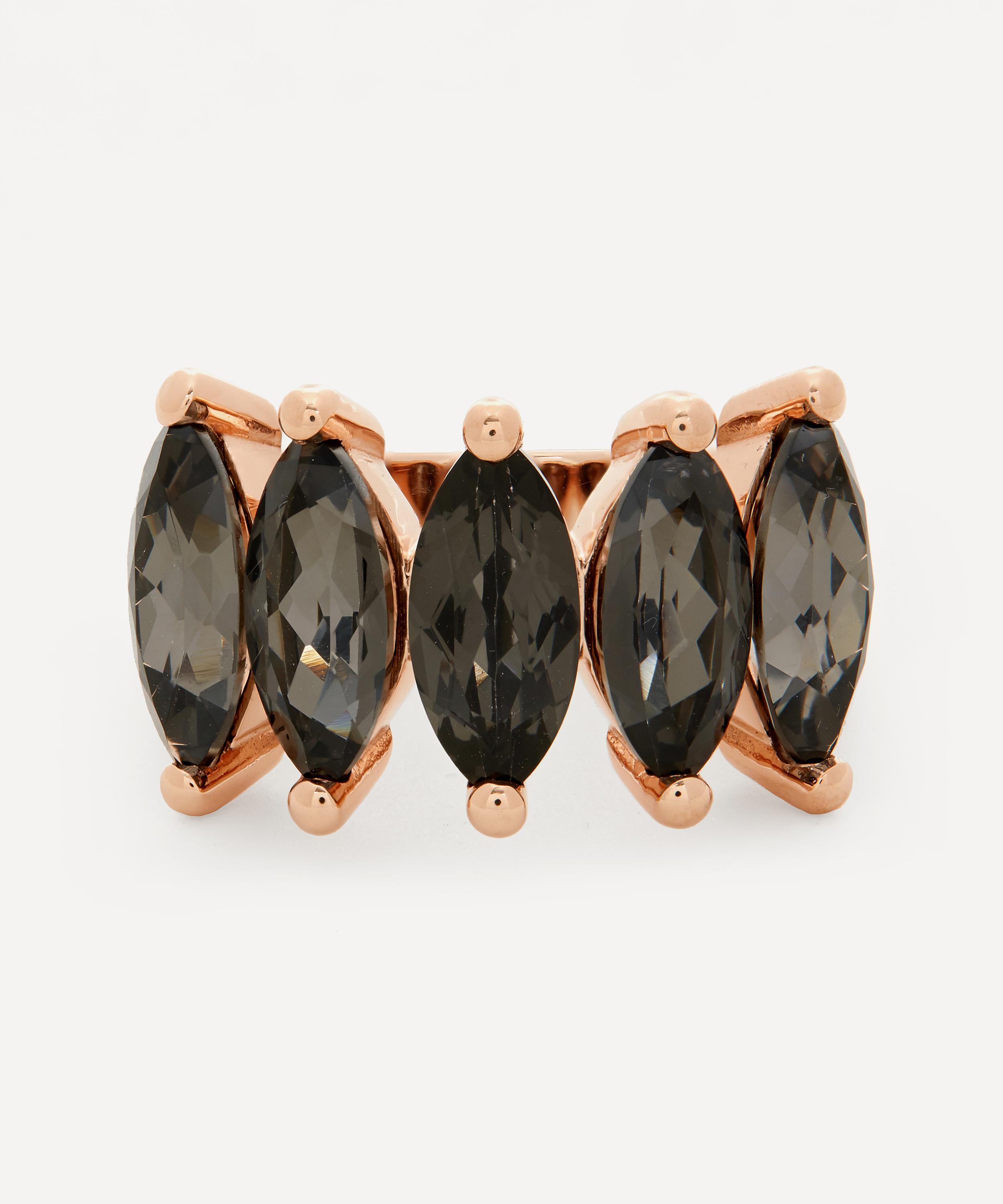 Crafted from solid 14 carat rose gold, this ring features a row of five marquise cut black night quartz stones on a slim, polished band. Style it solo for a touch of sparkle day-to-day, or stack it with several of the designer's other glittering gemstone rings for a dazzling, evening-ready approach.