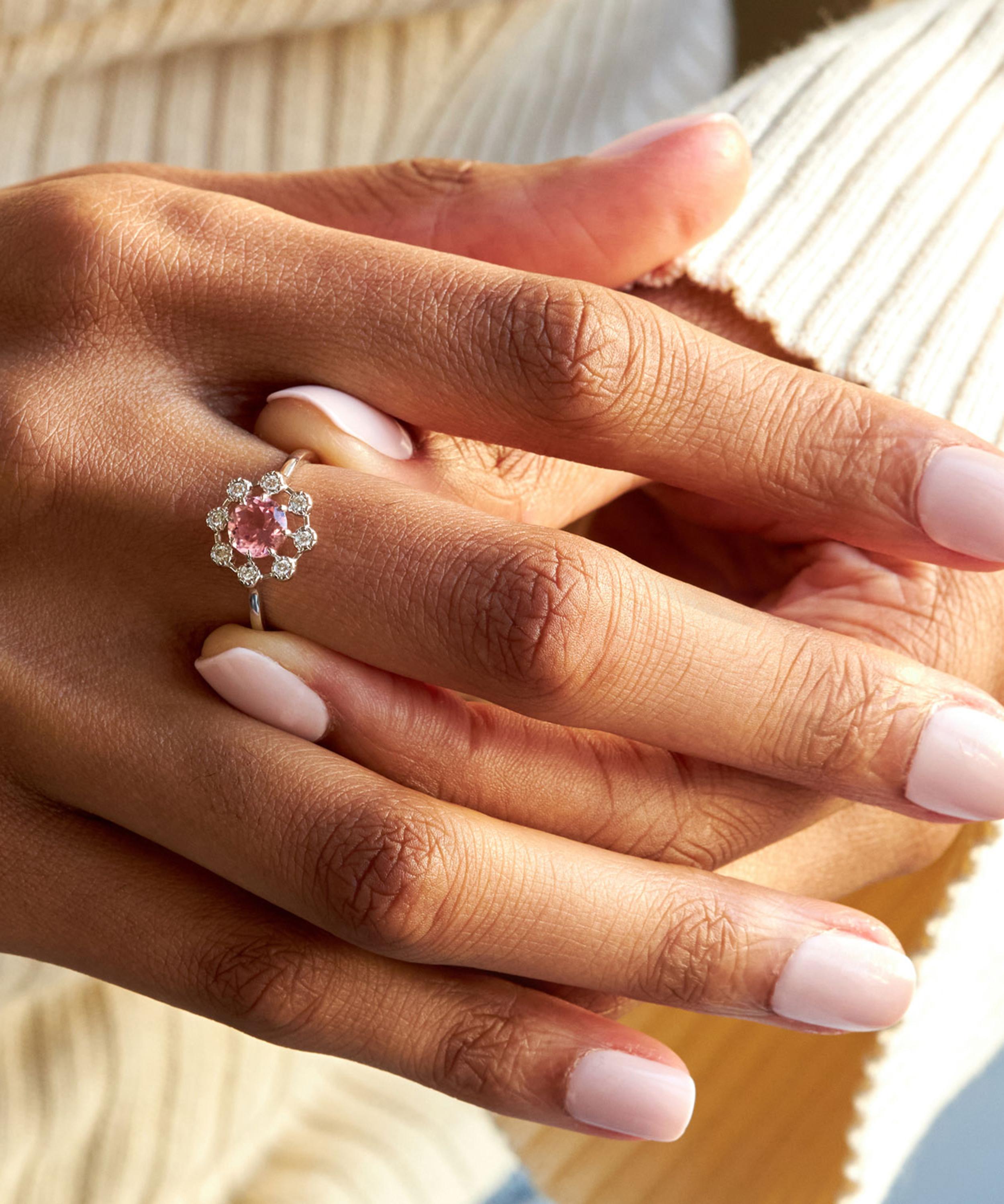 Heighten the impact of your ring curation with Dinny Hall’s unique Celandine ring – inspired by the British flower meadow. Crafted from 14ct white gold, its beautiful design takes the shape of a delicate flower composed of a claw-set pink tourmaline surrounded by eight sparkling diamonds.