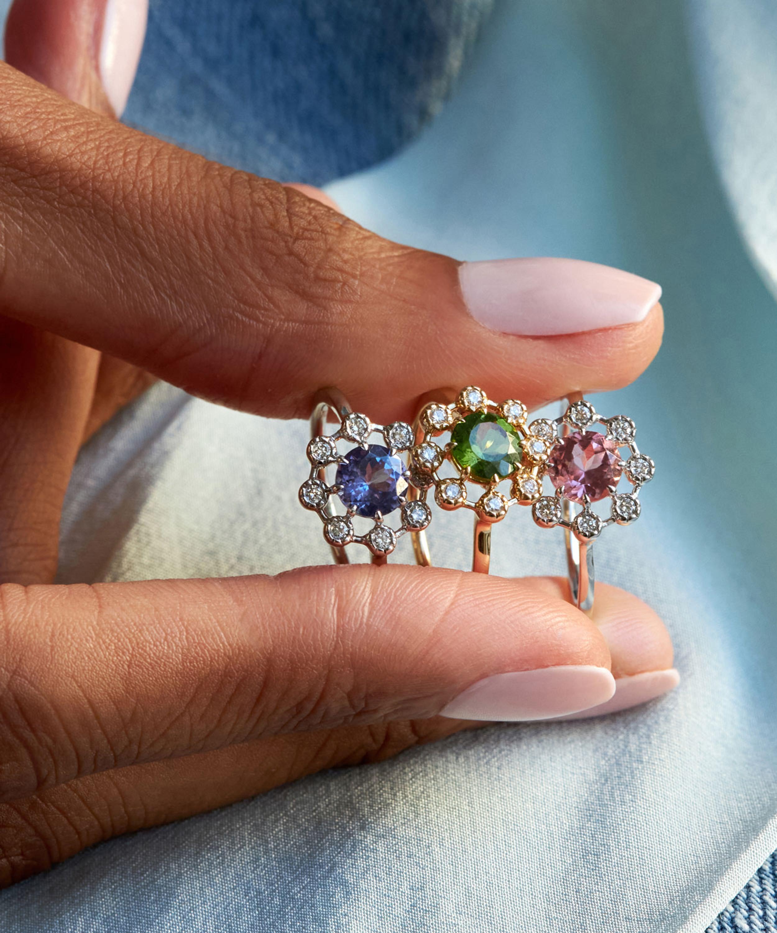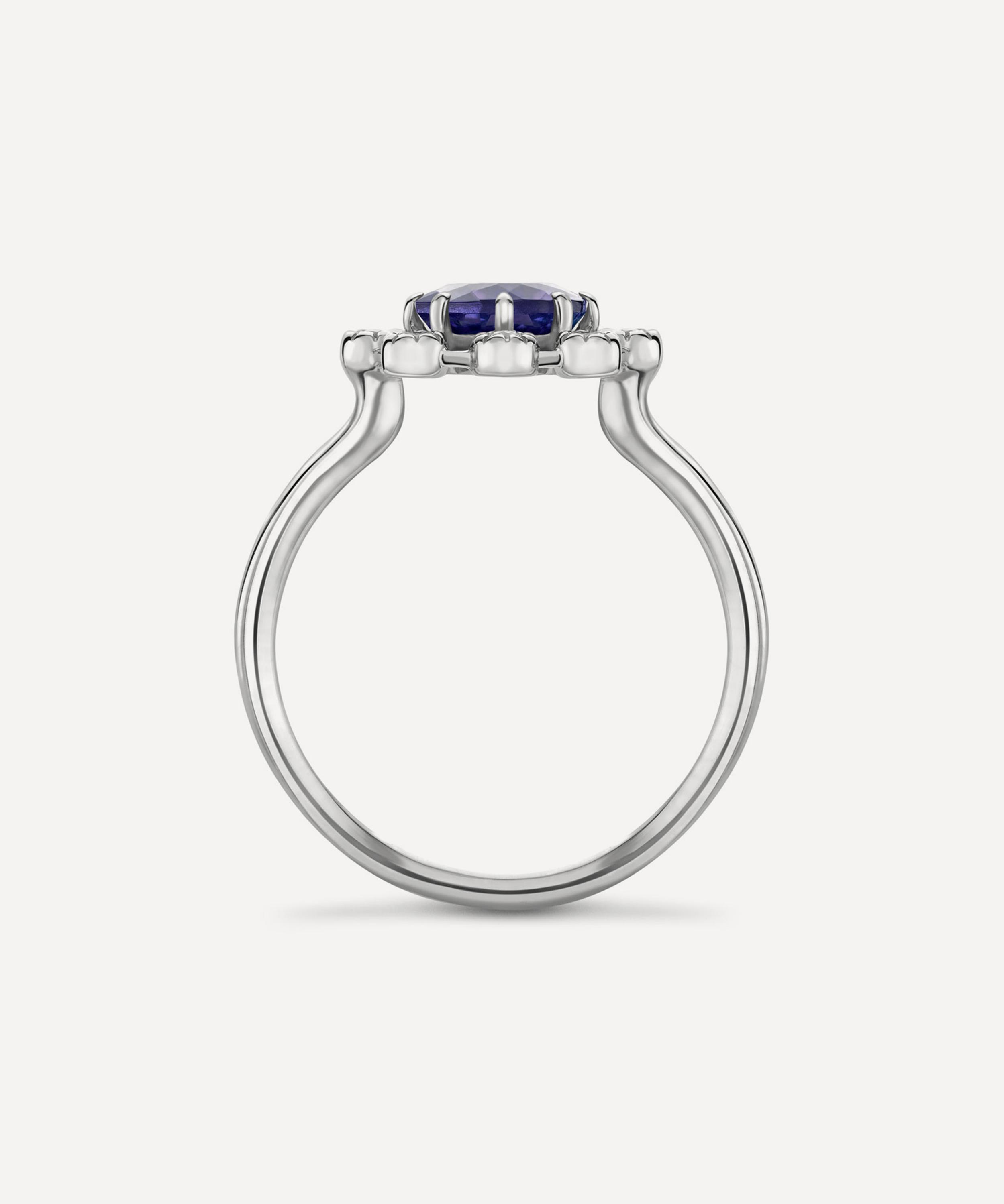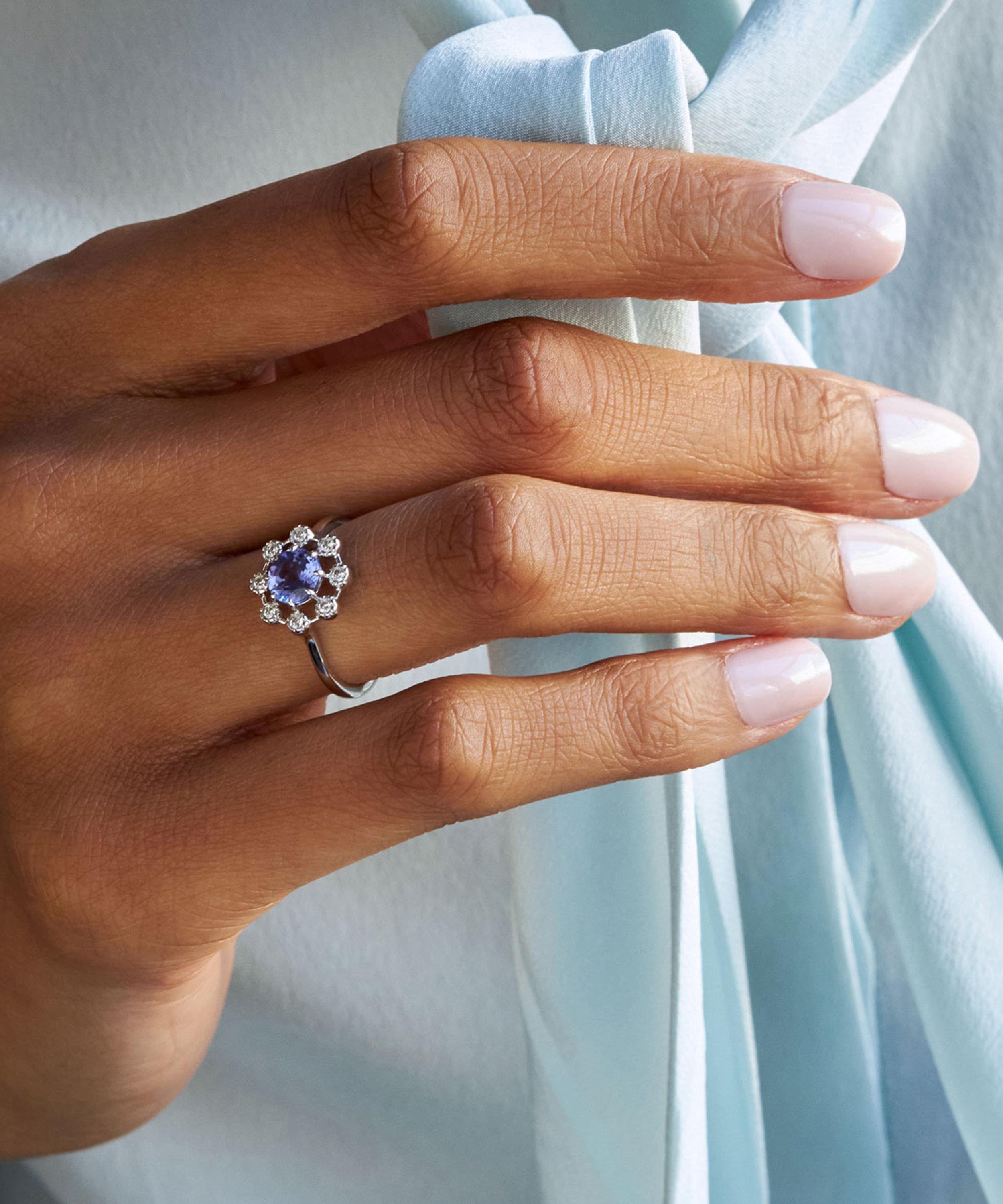 Heighten the impact of your ring curation with Dinny Hall’s unique Celandine ring – inspired by the British flower meadow. Crafted from 14ct white gold, its beautiful design takes the shape of a delicate flower composed of a claw-set tanzanite surrounded by eight sparkling diamonds.
