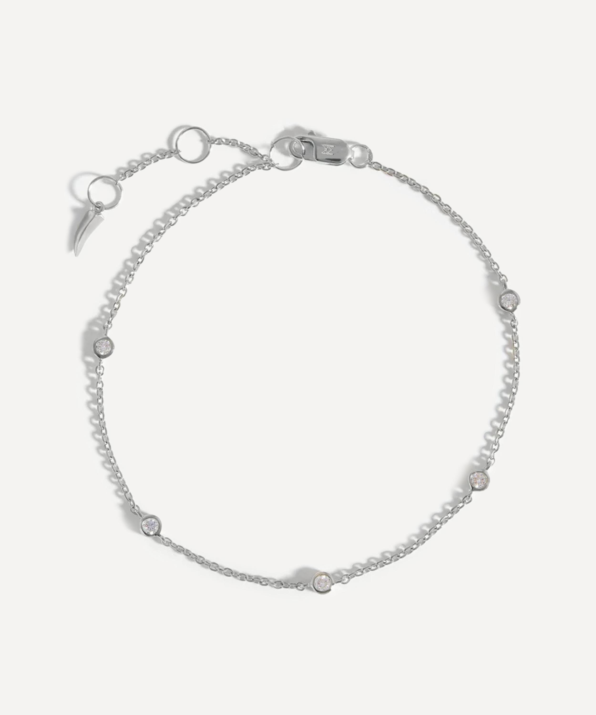 Make every day dressing feel effortless with this subtly diamond bracelet from Missoma. Handcrafted from solid 14ct white gold, it features a fine cable chain adorned with five round cut diamonds, floating on the wrist. Perfect for any kind of stack curation, style it with other gold bracelets, or wear solo for a minimal look.