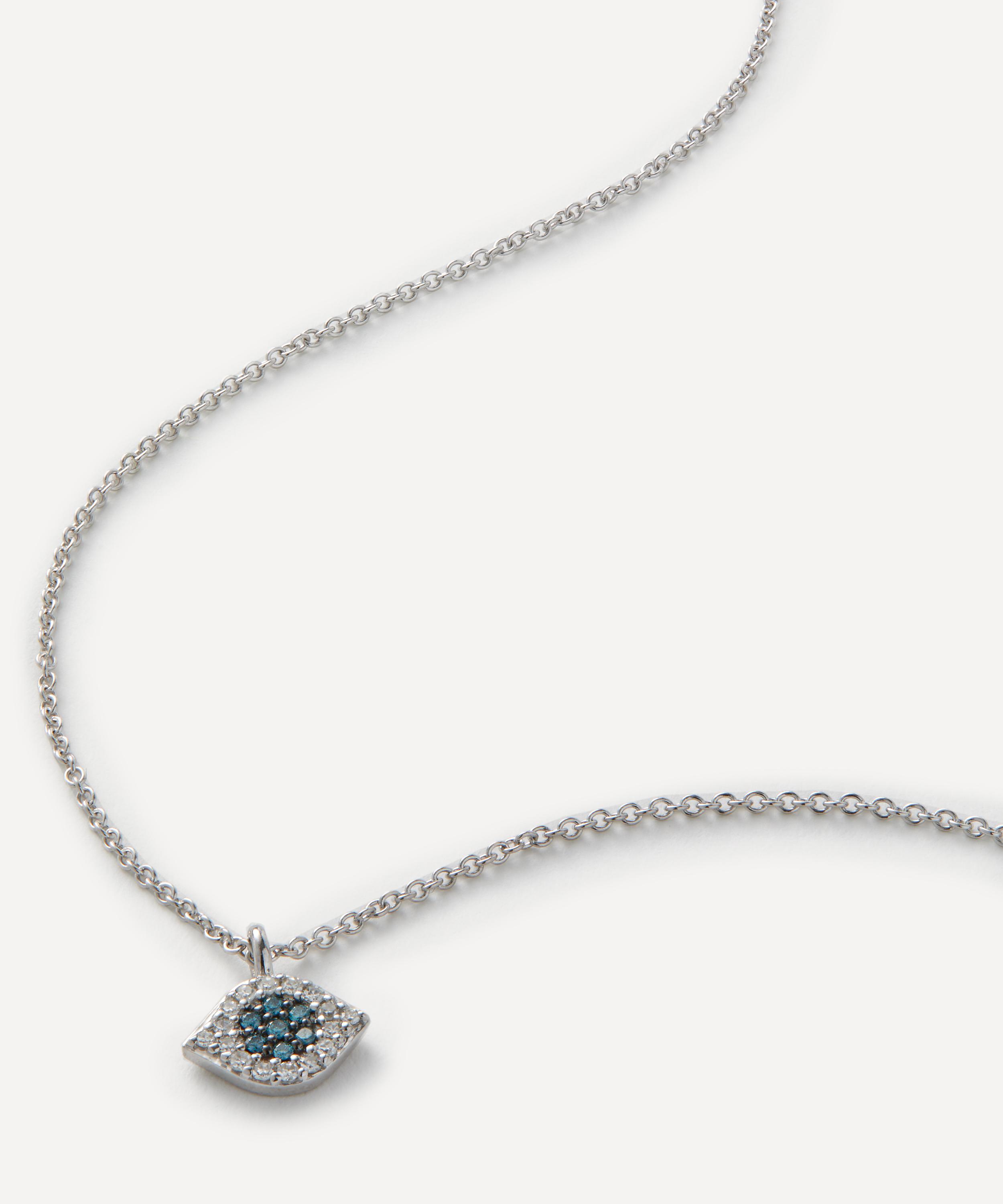 Take a playful approach to everyday dressing with the Mini Diamond Evil Eye pendant necklace from Roxanne First. Crafted from 14ct white gold, it features a fine trace chain and evil eye pendant composed of a trio of precious diamonds, including white and blue diamonds, and a black diamond at the centre. Style solo, or layered.