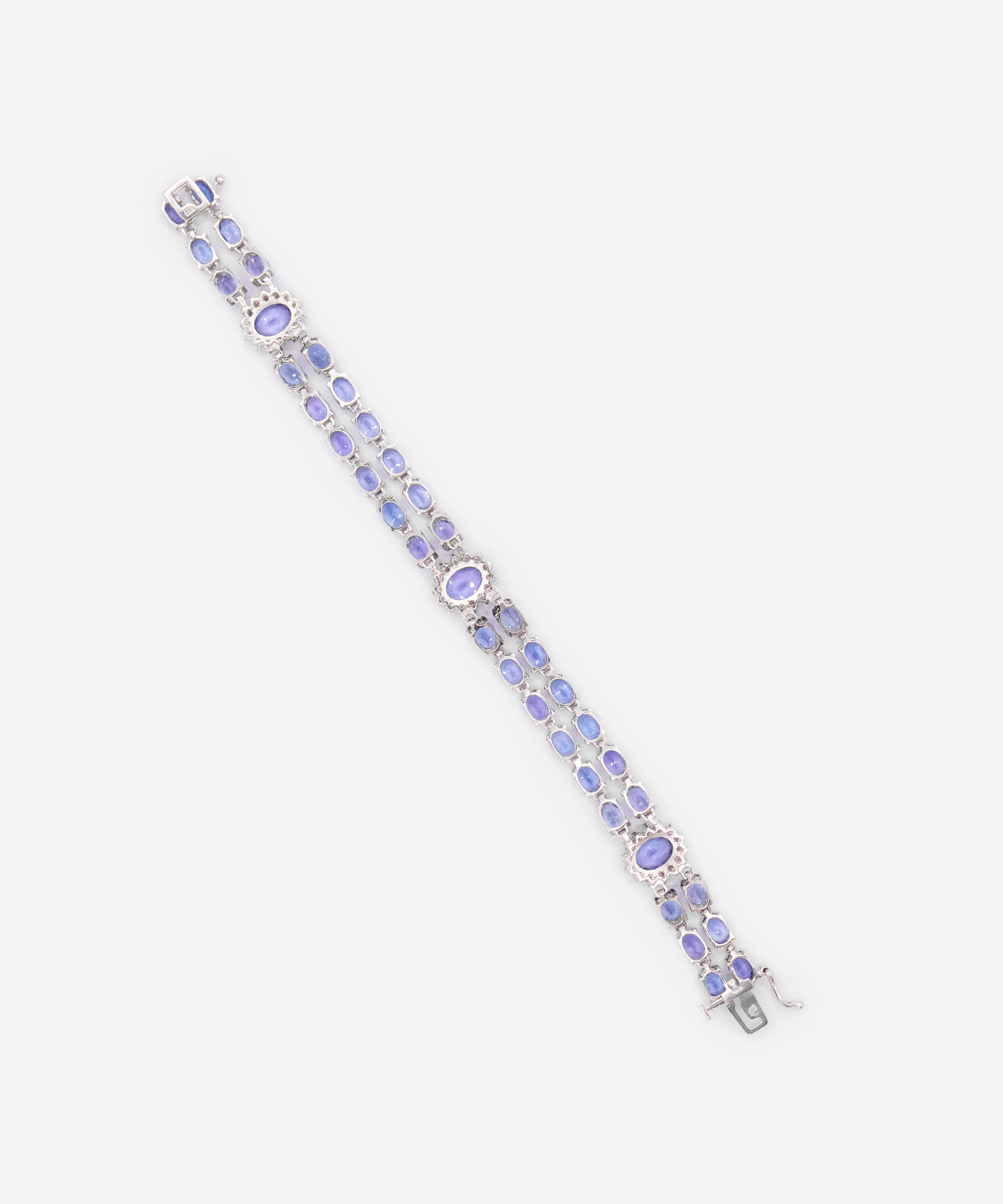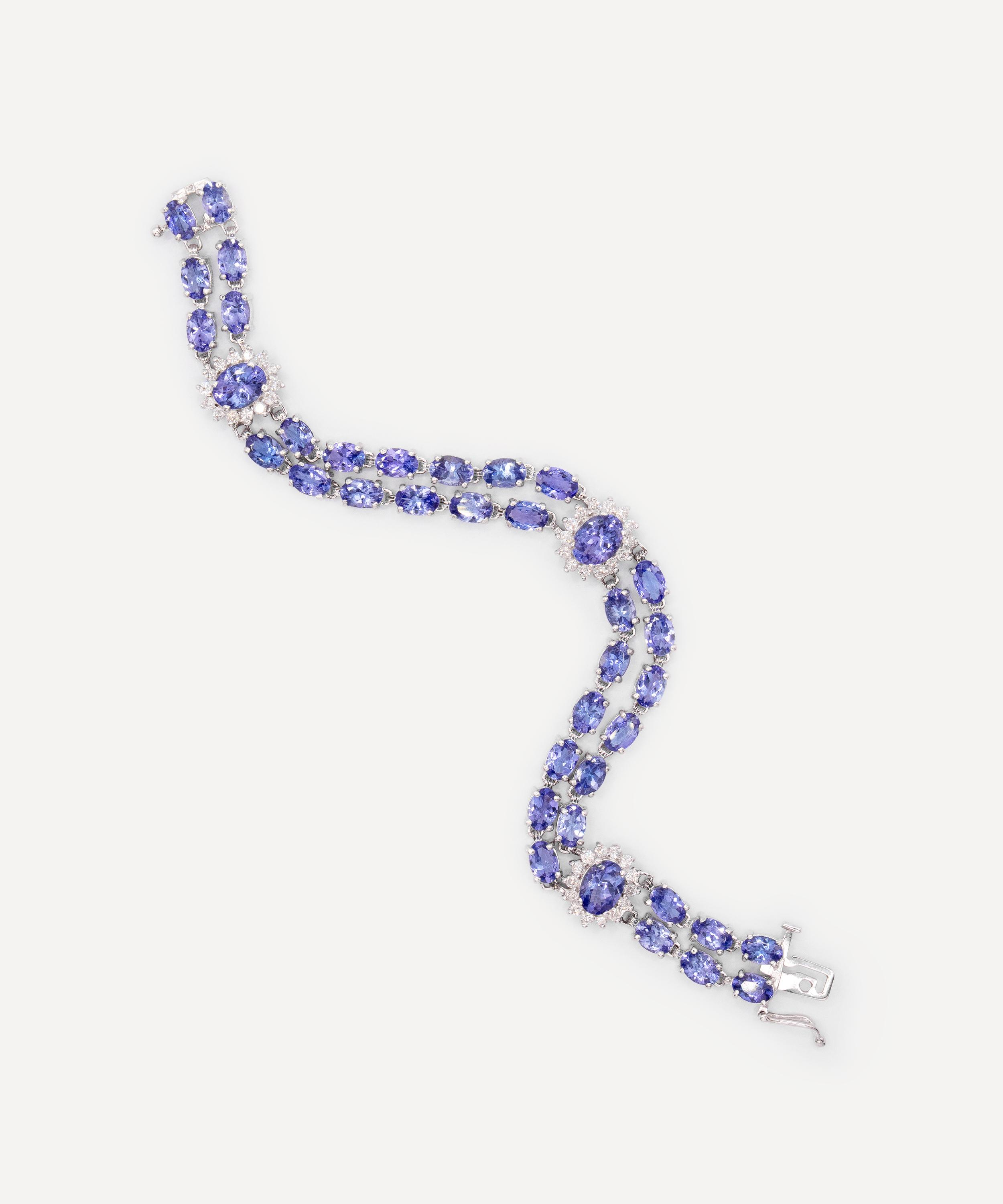 Perfect in every way, this exquisite bracelet from Kojis is set with 15.03ct Tanzanite and 0.38ct Diamonds. Crafted from 14ct white gold, it features two lines of oval-cut tanzanite stones, divided by three tanzanite and diamond clusters, evenly spaced along the bracelet.