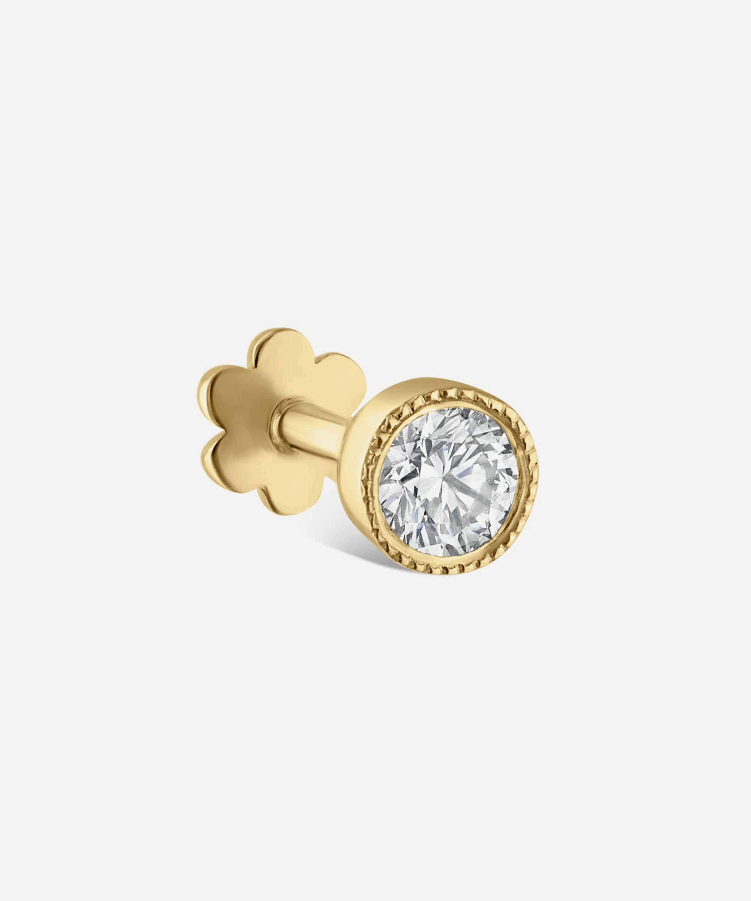 Available in multiple variations of high-polished 18 carat gold, this understated stud features a tiny 0.07-carat white diamond in a classic bezel setting, with intricate milgrain edging adding a subtly scalloped effect. Complete with the brand's signature flower threaded backing, it styles beautifully in a range of lobe and cartilage piercings - team it with several other single diamond studs for a dazzling dewdrop effect.