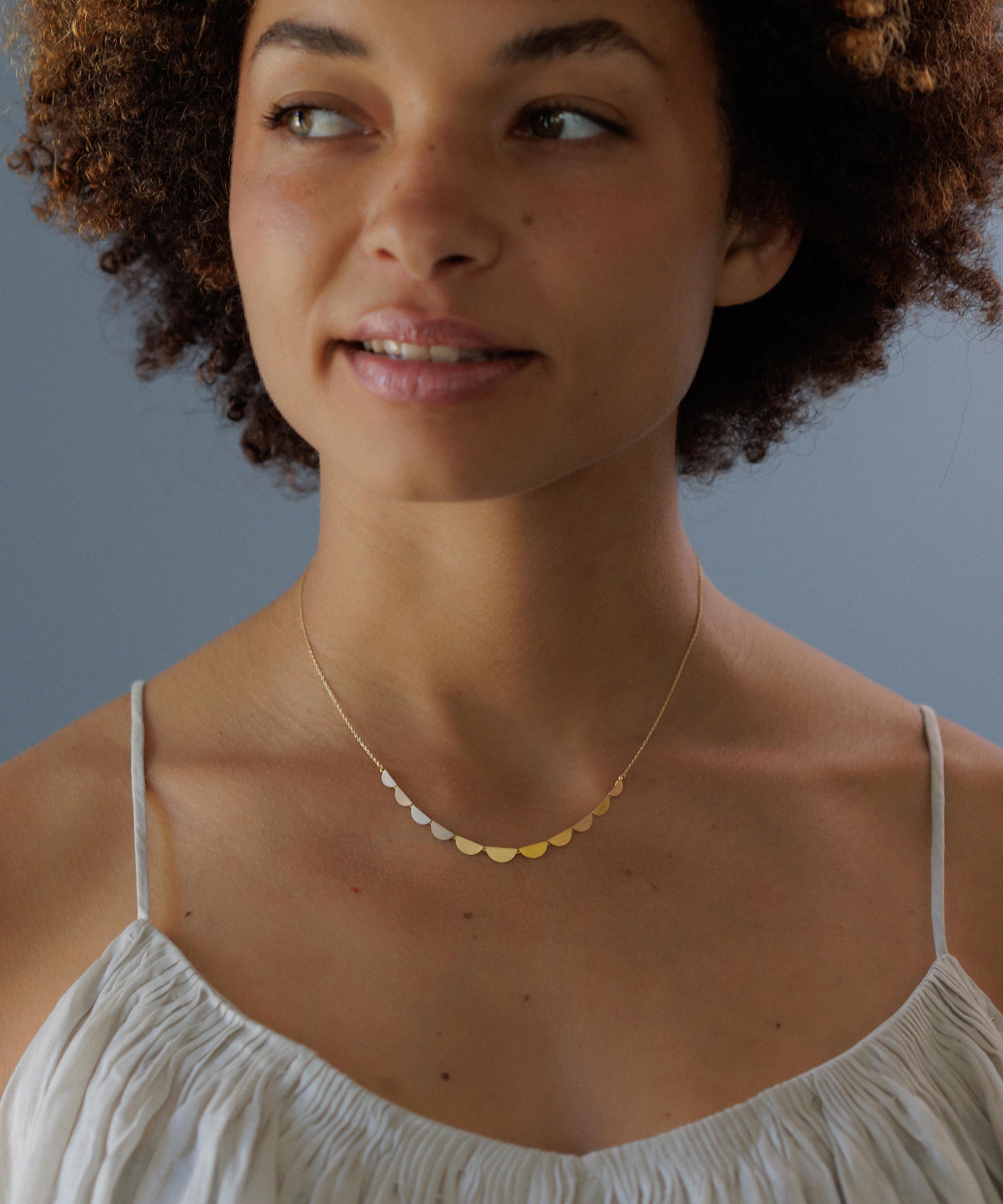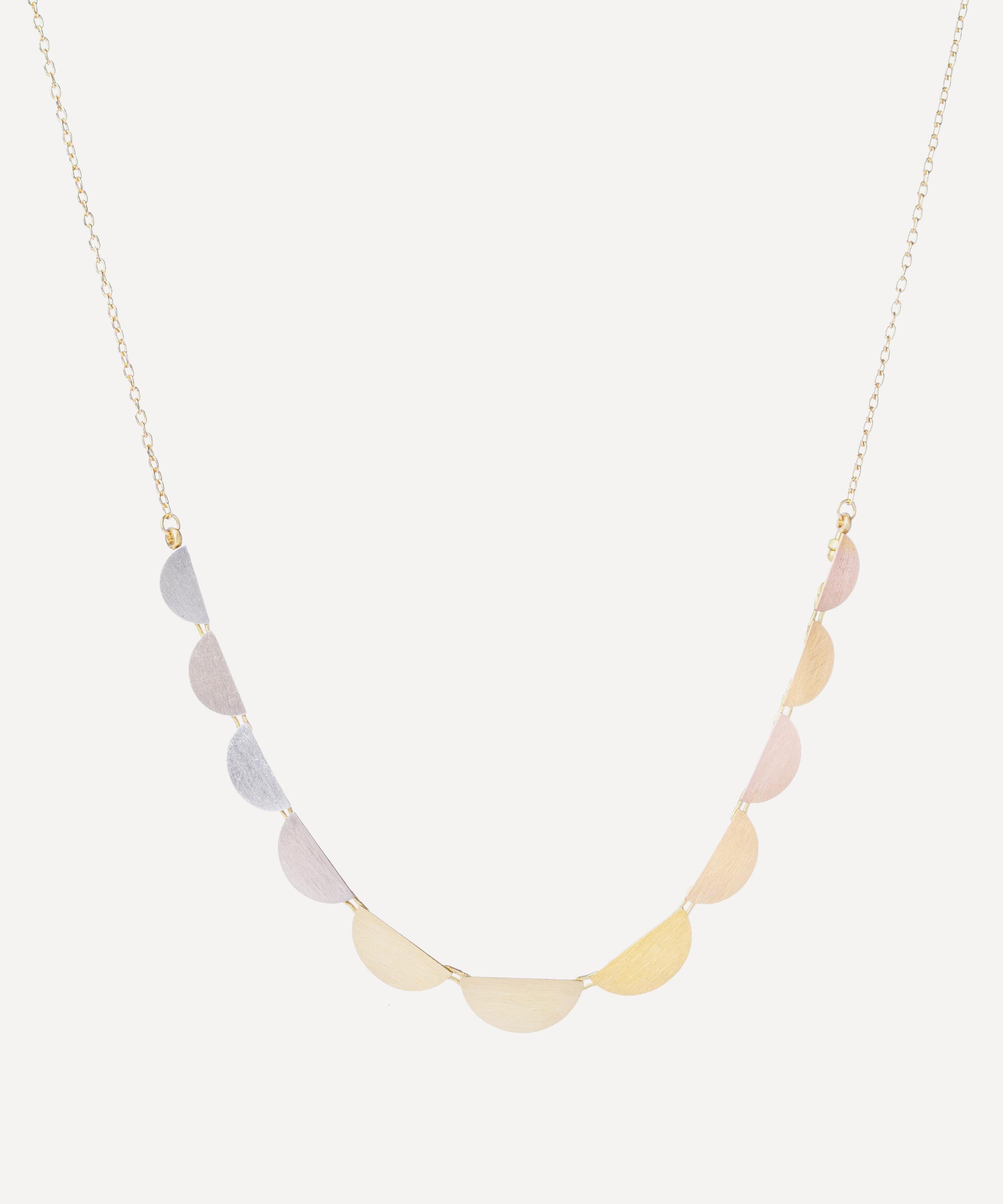 Handcrafted from 18ct-24ct gold and platinum, it boasts a minimal yet sculptural piece, featuring a fine cable chain adorned with a shimmering arc of half-moons in the brand’s signature golden rainbow fade palette. Beautifully styled as a solo piece, it can also be layered with other gold necklaces from the brand or your own collection.