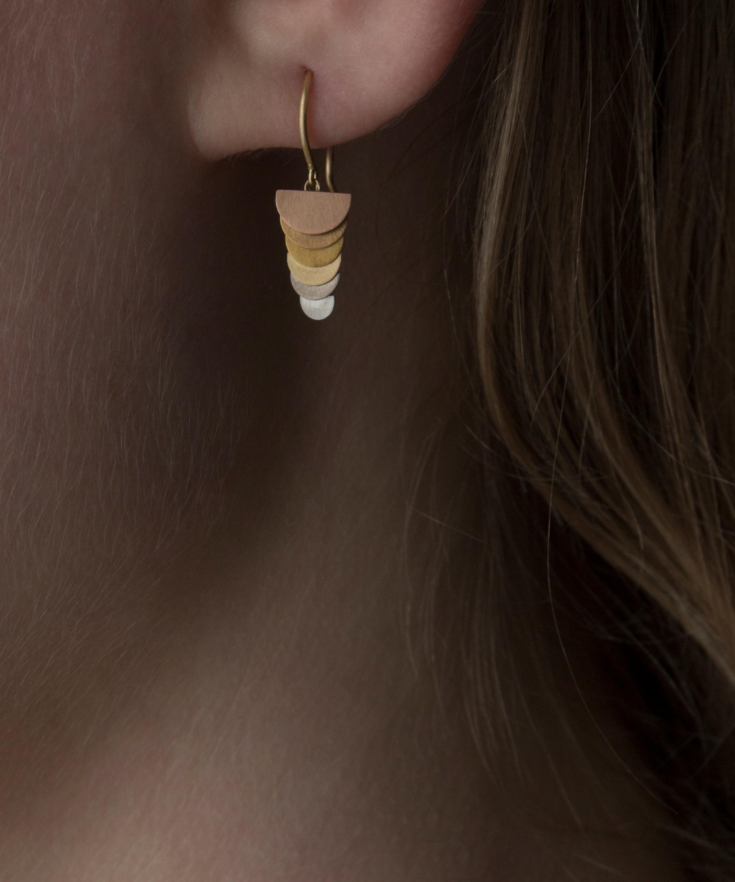 Handcrafted from 18ct-24ct gold and platinum, each earring boasts and minimal yet sculptural piece, featuring tiny half-moons layered together in brand’s signature golden rainbow palette. Beautifully styled as a solo piece, they can also be layered with other gold earrings from the brand or your own collection.