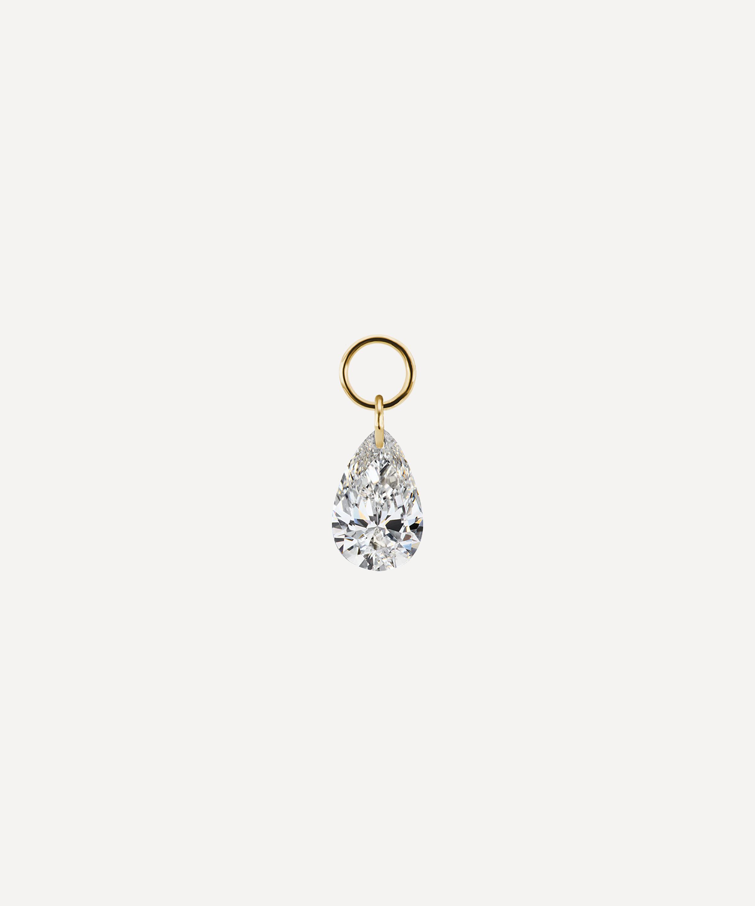 Crafted from high-polished 18 carat gold, this petite earring charm features a single pear cut white diamond, suspended freely without a setting to fully showcase the light-catching facets of the stone. Complete with a tiny attached top ring, it's perfect for adding a hint of embellishment to one of the brand's signature clicker earrings - try threading it onto a tragus, rook or helix hoop for a subtly alternative finish.