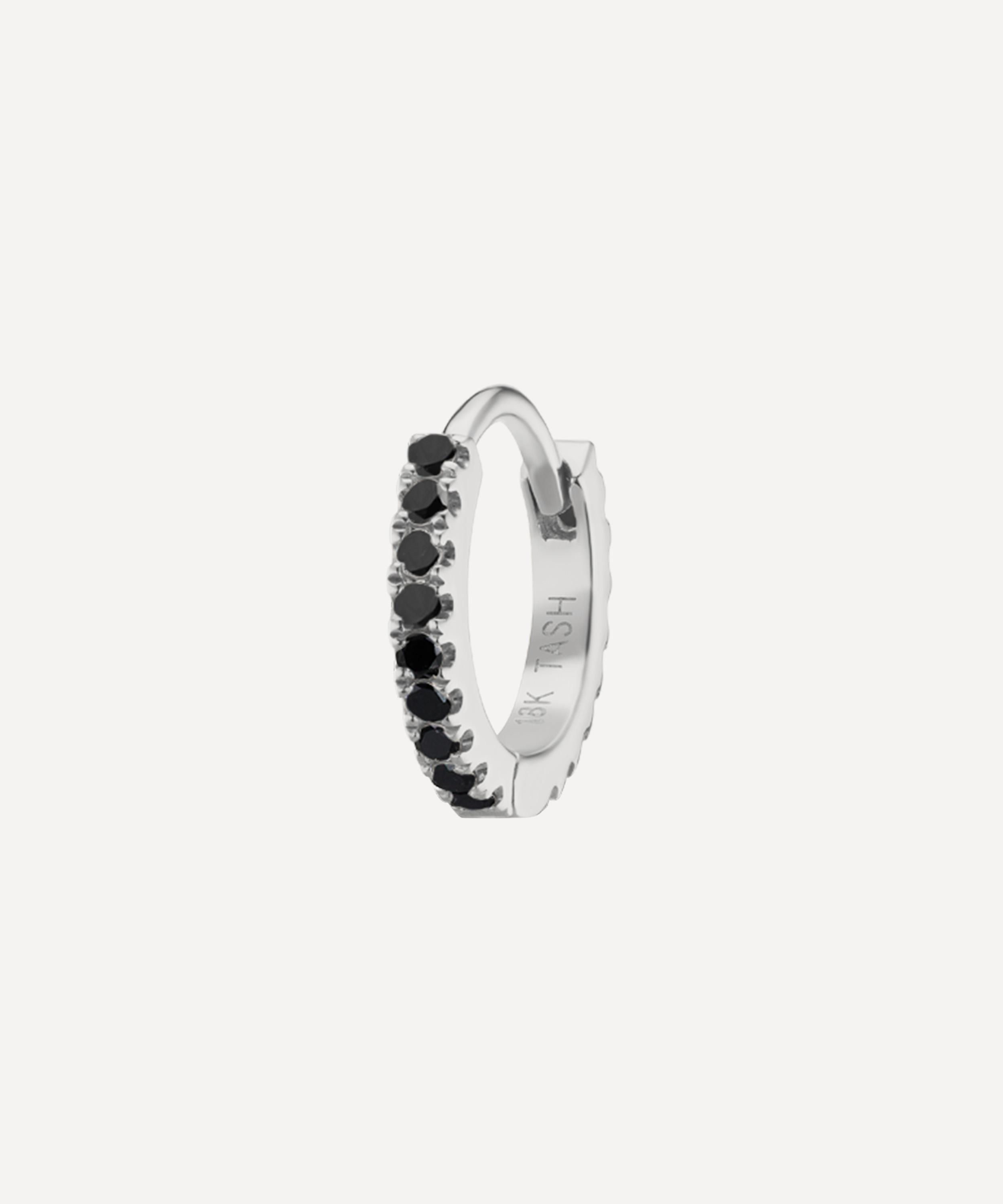 Available in multiple variations of high-polished 18 carat gold, this eternity hoop earring is set with 18 glittering black diamonds in one continuous row for a subtly gothic, all-around sparkle. Complete with an endlessly convenient clicker fastening, it styles beautifully in helix, rook and lobe piercings, with the helix offering a slightly looser fit. The perfect starting point for a show-stopping ear curation, try yours with diamond-encrusted studs and stacks of huggie hoops for the full Tash effect.