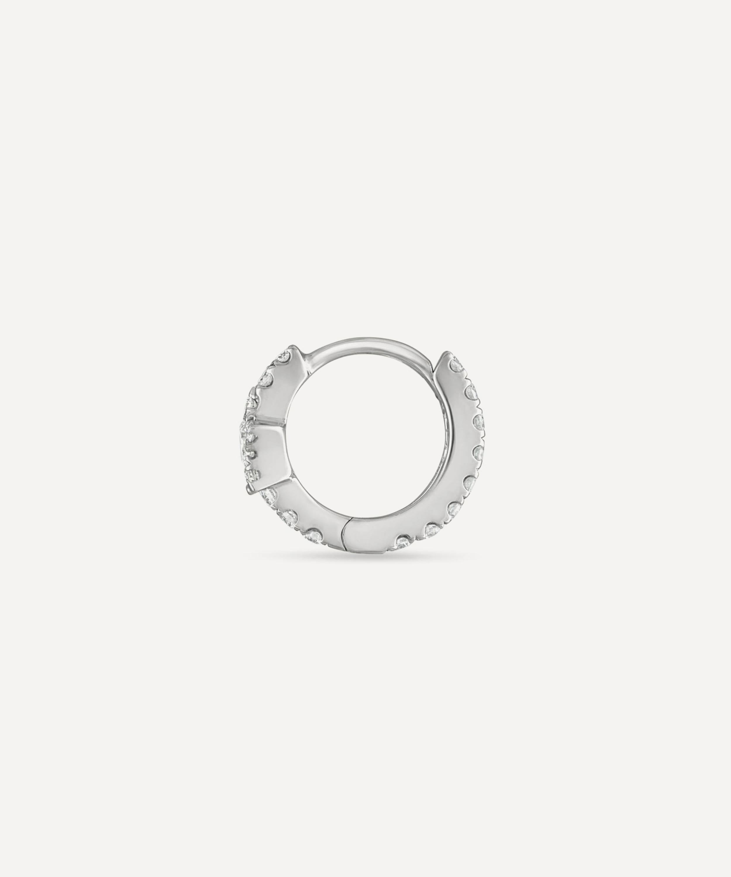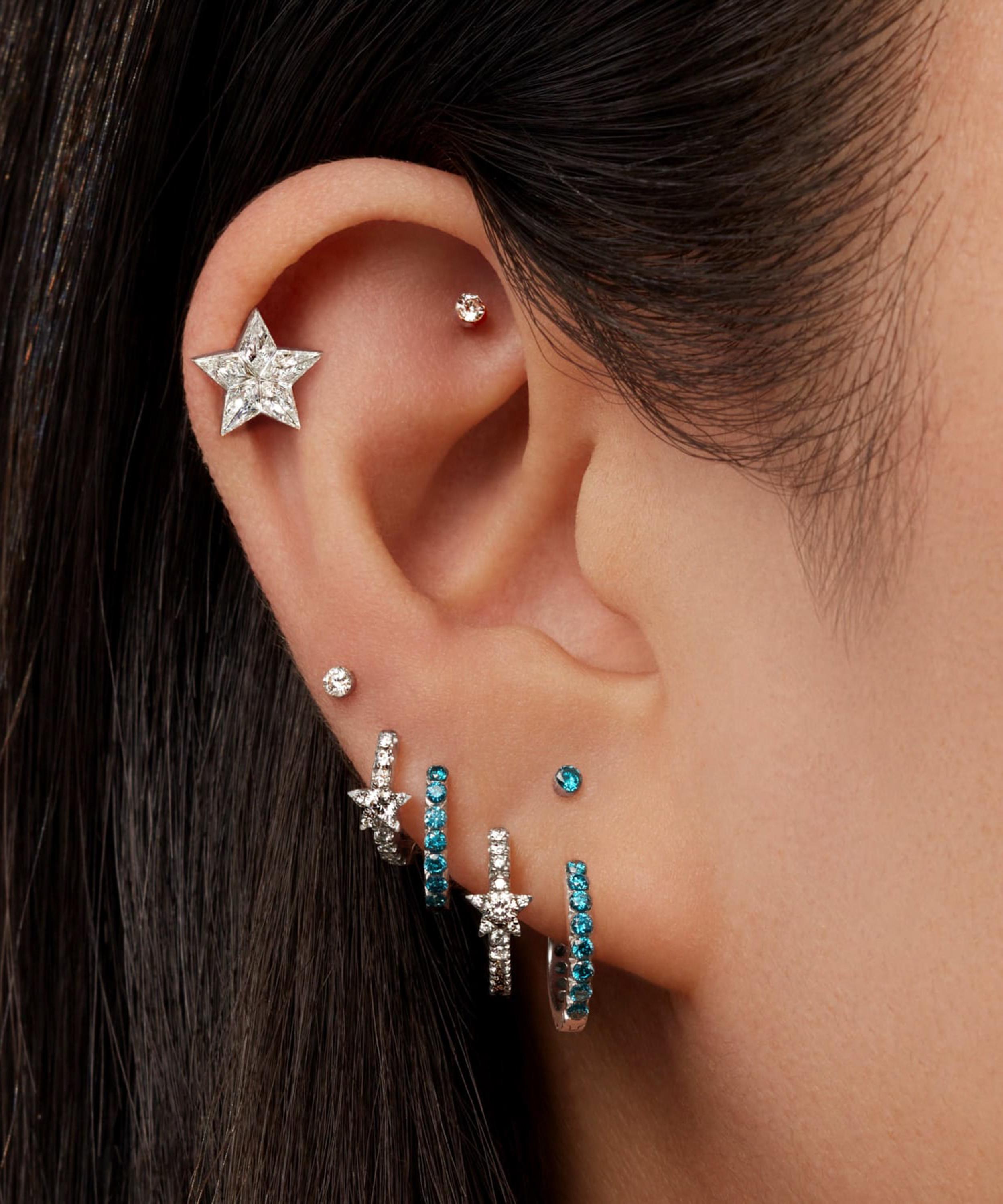 Available in multiple variations of high-polished 18 carat gold, this eternity hoop earring features a single row of 14 glittering white diamonds, punctuated by a dazzling diamond star. Complete with a convenient clicker fastening, it styles beautifully in both helix and lobe piercings, with the helix offering a slightly looser fit. Try yours with diamond-encrusted studs and stacks of huggie hoops for the full Tash effect.