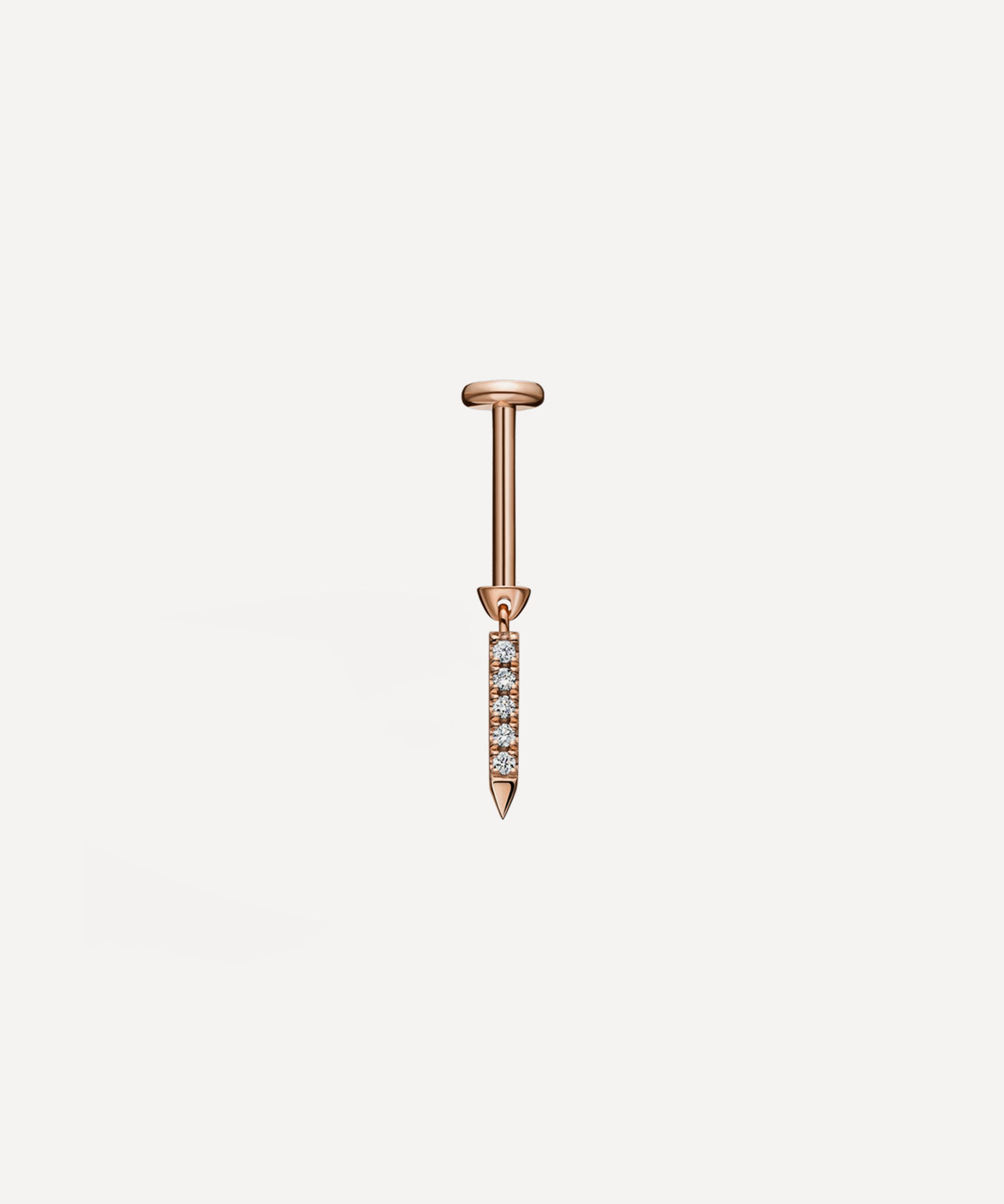 Available in multiple variations of high-polished 18 carat gold, this single stud earring features a short, pointed bar charm, set with five glittering white diamonds. Complete with a flat disc threaded backing, it styles beautifully in a range of lobe and cartilage piercings - wear it alongside the brand's longer bar charm stud for a striking graduated effect.