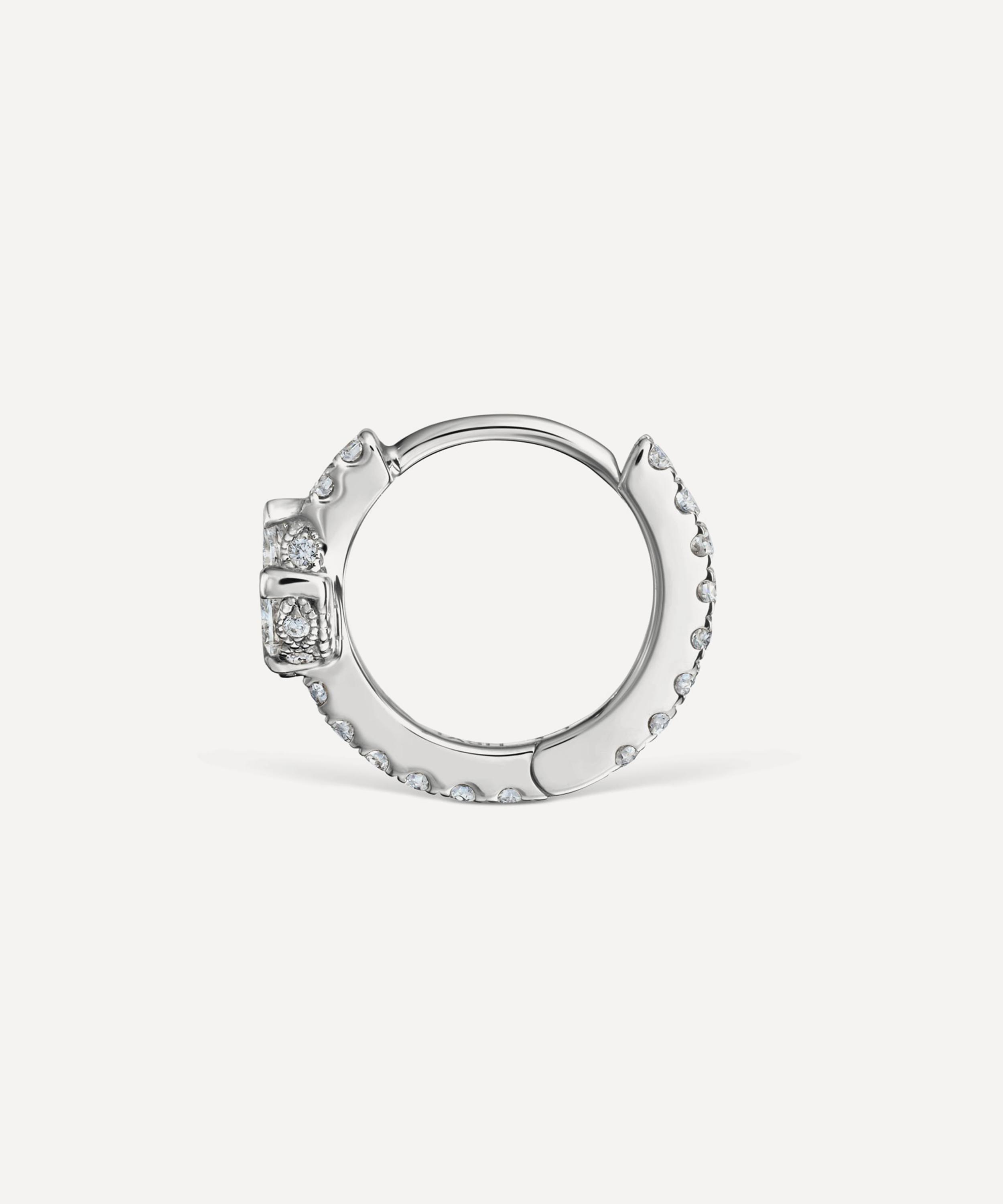 Crafted from high-polished 18 carat white gold, this eternity hoop earring features a continuous row of round, brilliant cut white diamonds, punctuated by a single marquise cut diamond lotus flower. Complete with a convenient clicker fastening, it styles beautifully in both helix and lobe piercings, with the helix offering a slightly looser fit. Try yours with diamond-encrusted studs and stacks of huggie hoops for the full Tash effect.