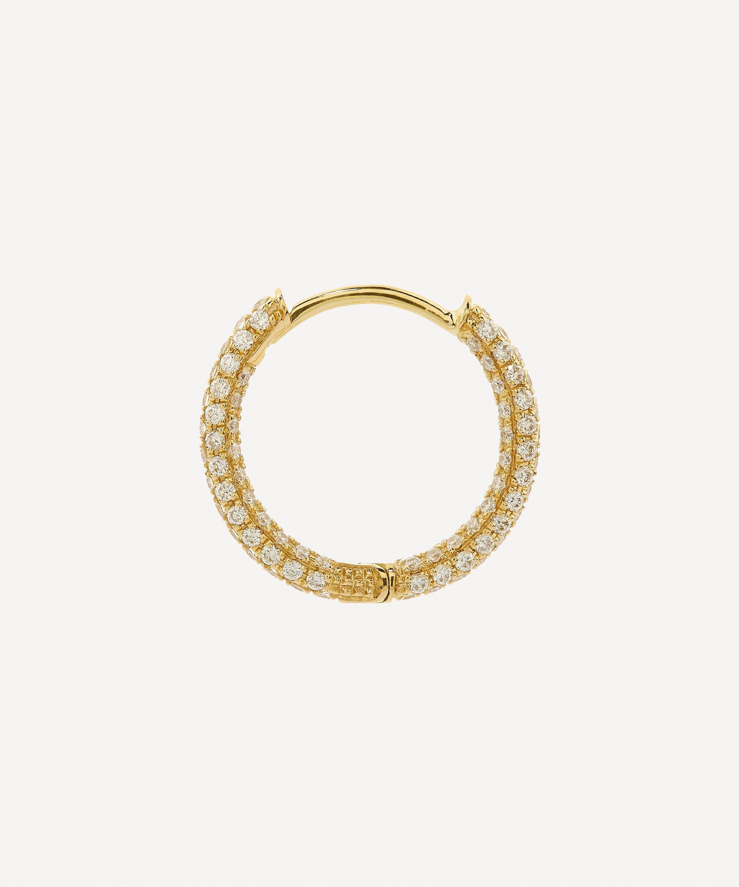 Available in multiple variations of high-polished 18 carat gold, this mesmerising hoop earring features five rows of glittering pavé white diamonds for an exquisite, all-around sparkle. Complete with a bottom hinge and an endlessly convenient clicker fastening, it styles beautifully in both daith and lobe piercings, while the larger size is tailored more for the conch than the classic helix. The perfect starting point for a show-stopping, evening-ready ear curation, try yours with diamond-encrusted studs and stacks of huggie hoops for the full Tash effect.