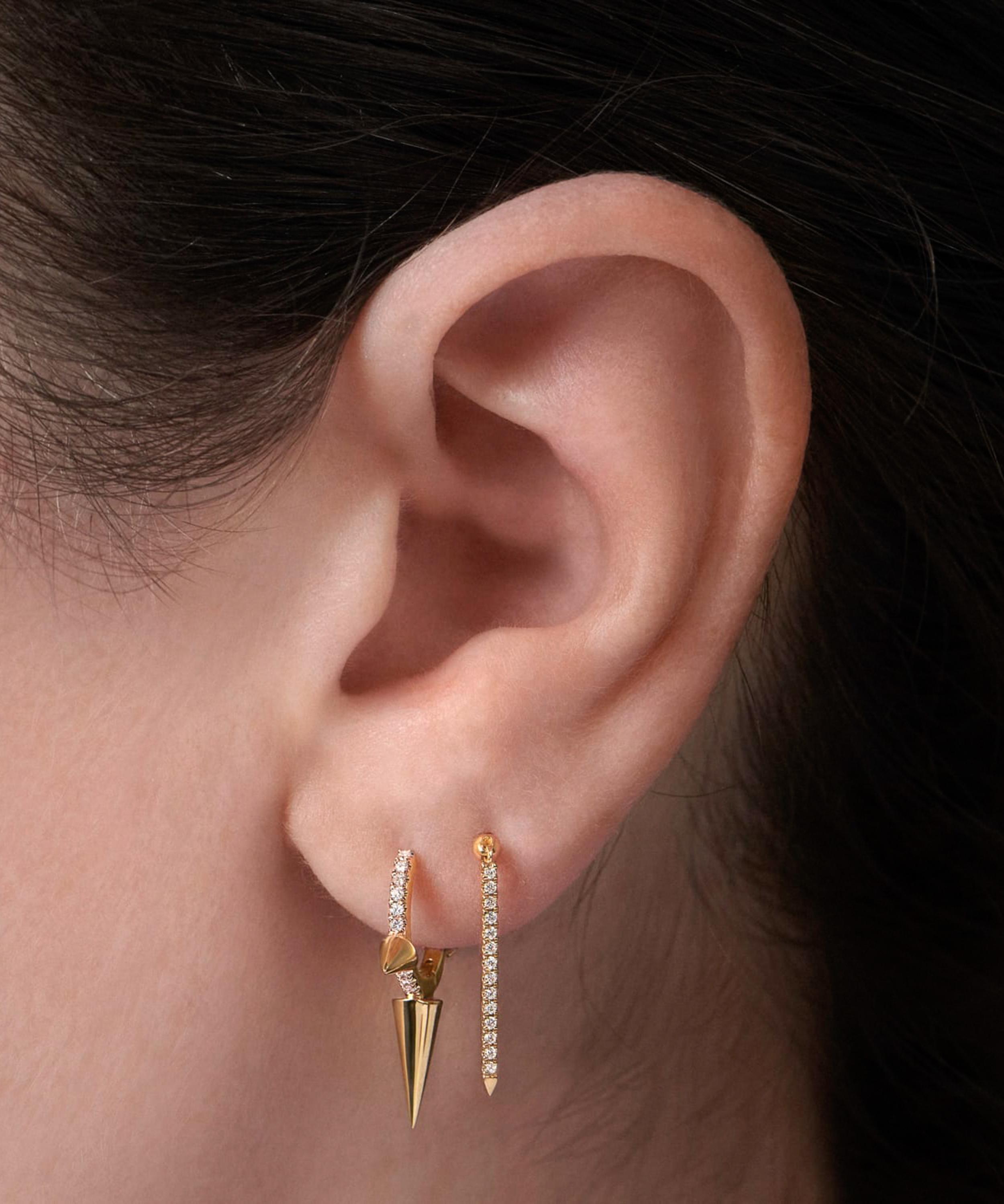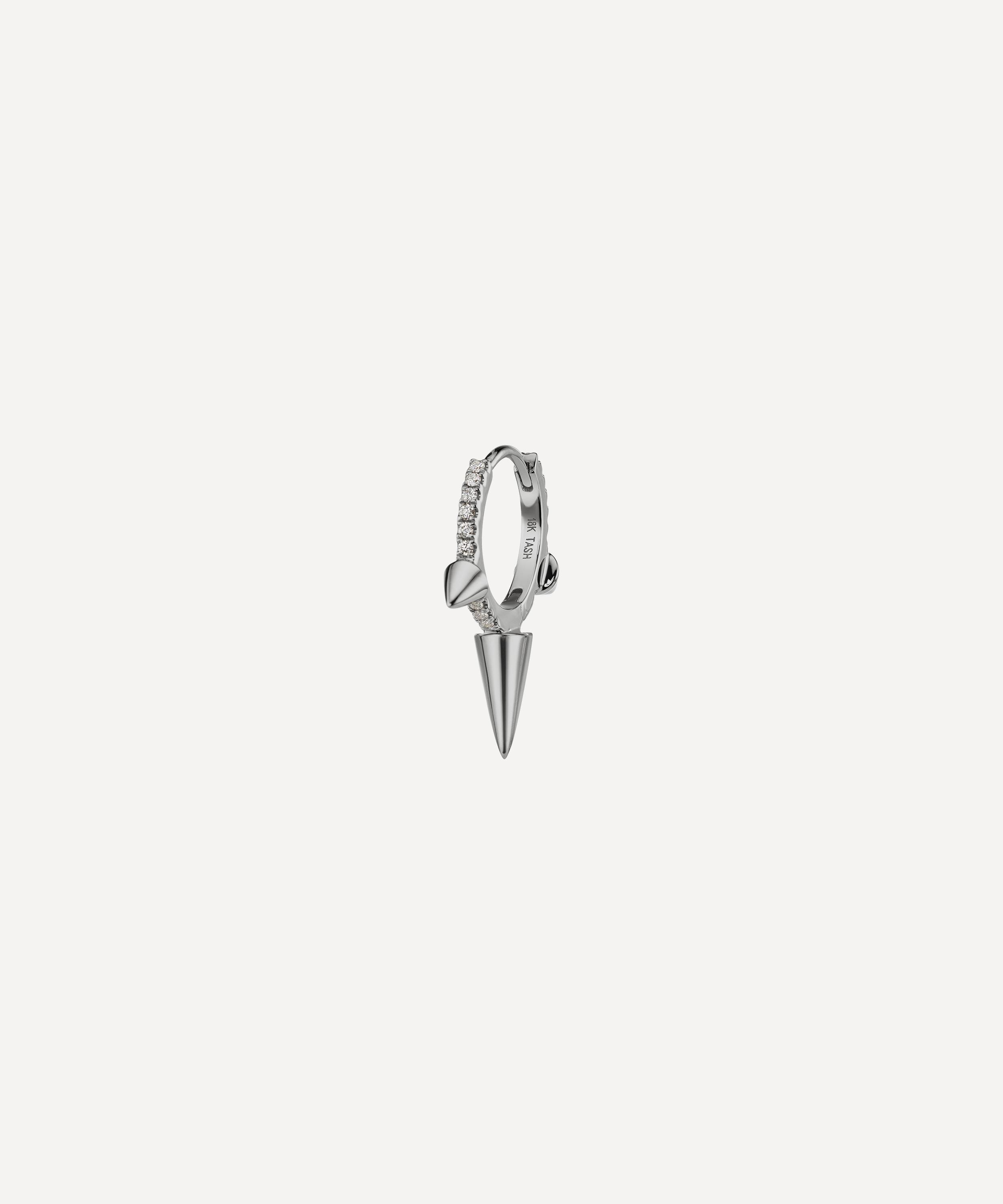 Available in multiple variations of high-polished 18 carat gold, this hoop is set with a single row of glittering white diamonds along the outer edge, while the long central spike creates a dramatic, punk-inspired drop. Complete with a convenient clicker fastening, it's designed to bring a dazzling, 360-degree sparkle to any standard lobe piercing. Try yours with diamond-encrusted studs and stacks of huggie hoops for the full Tash effect.