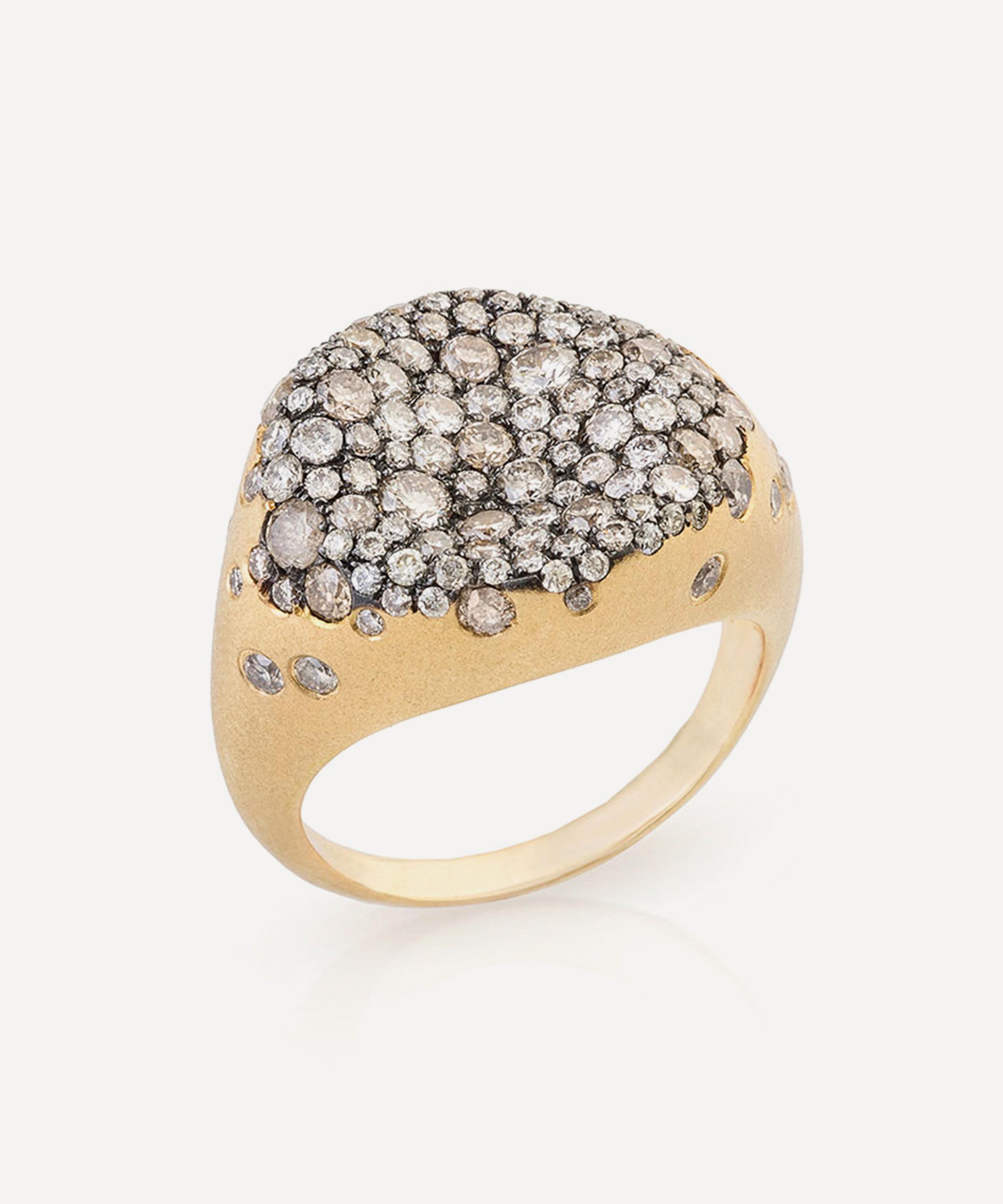 Intricately crafted from solid 18 carat gold, it features round silhouette in a hand brushed to matte finish, adorned with scattered champagne diamonds in Nada’s signature pave setting. Team it with other bold feminine pieces from the designer to build your own powerful narrative of jewels.