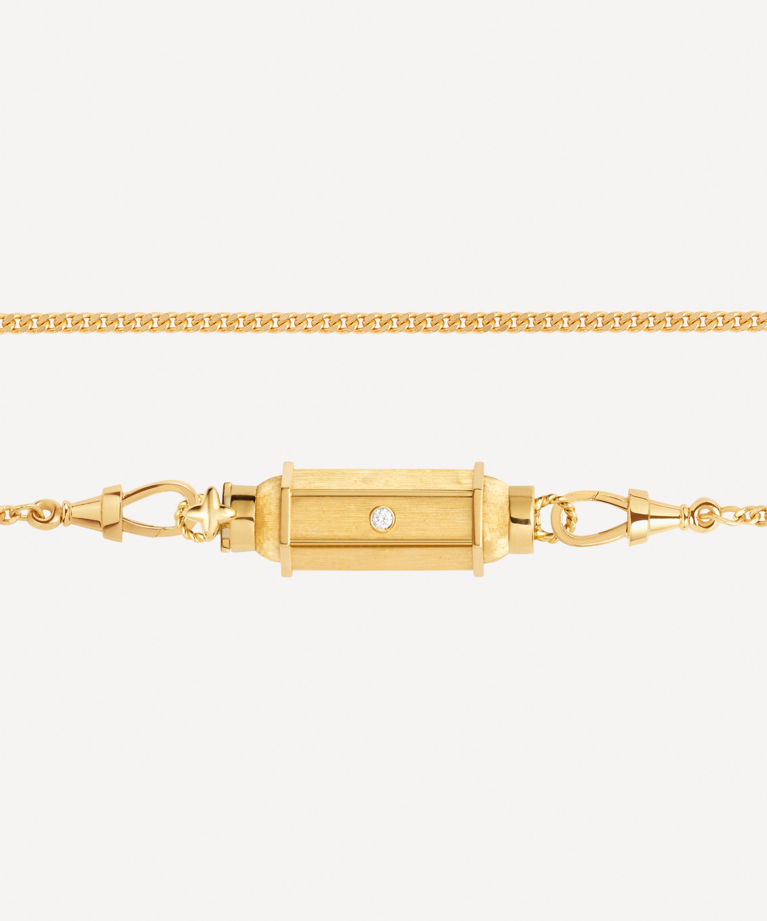 Expertly crafted from 18ct gold, this necklace features a fine chain with a handcuff finish at each end. At the centre hangs a barrel pendant in a brushed gold finish, embellished with three star set diamonds.