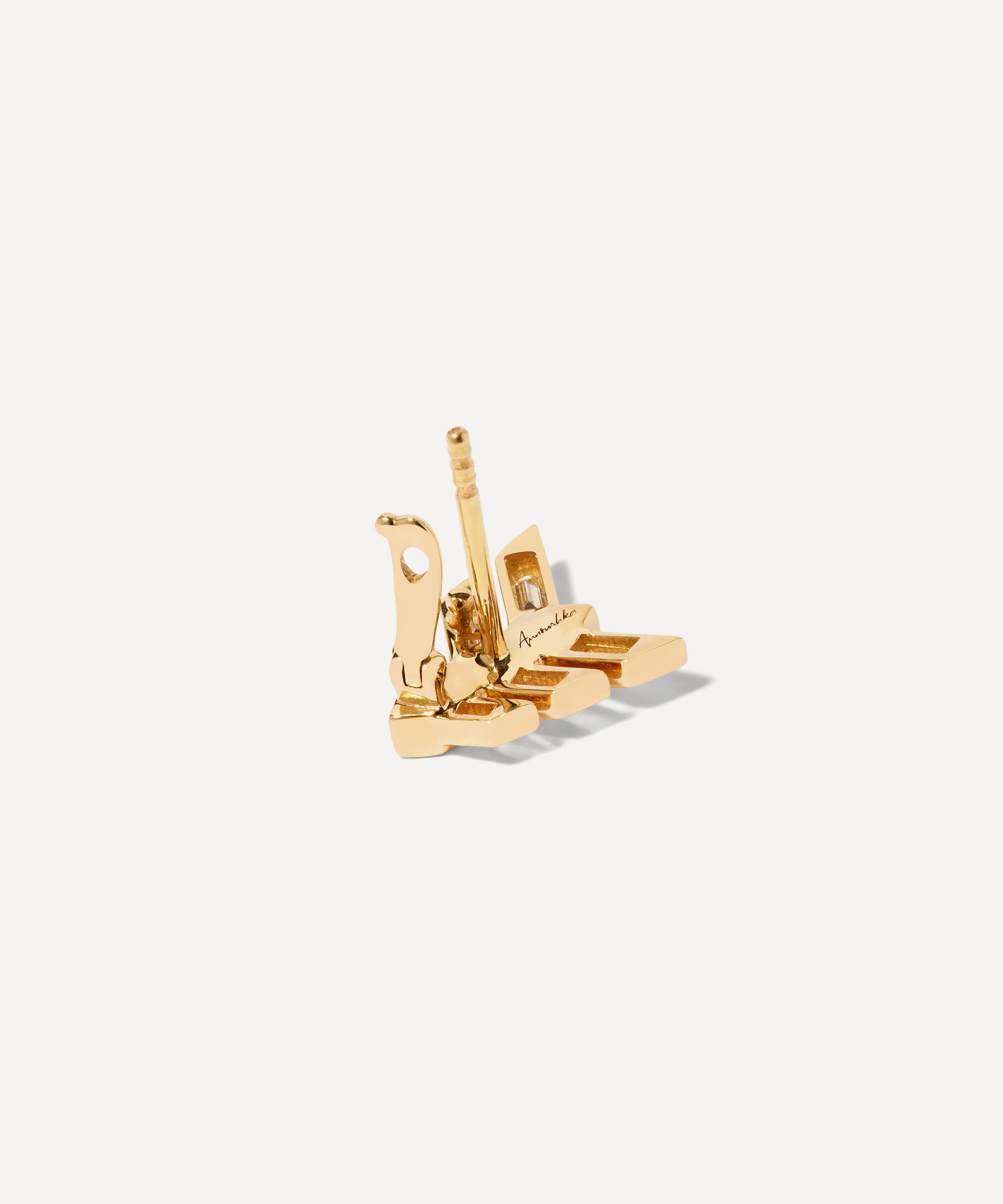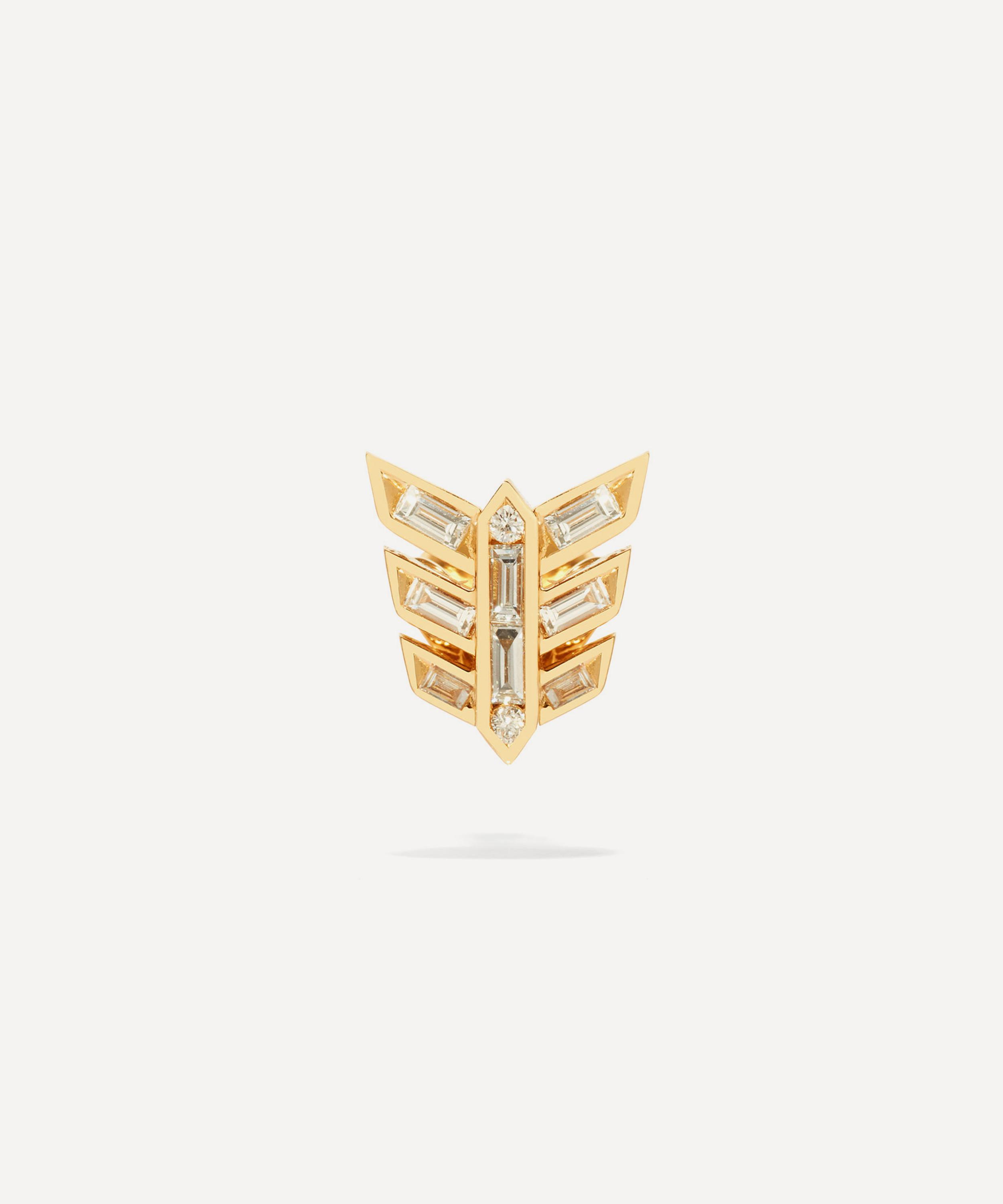 An elegant piece set to brighten your daily attire with a touch of sparkle, this single stud earring is crafted from 18ct gold with handset baguette-cut diamonds. Featuring a contemporary, arrow-inspired silhouette, it comes together by a hinged clip on the reverse. Wear it on its own, or style with any Annoushka drops and studs for a personal curation of gems.