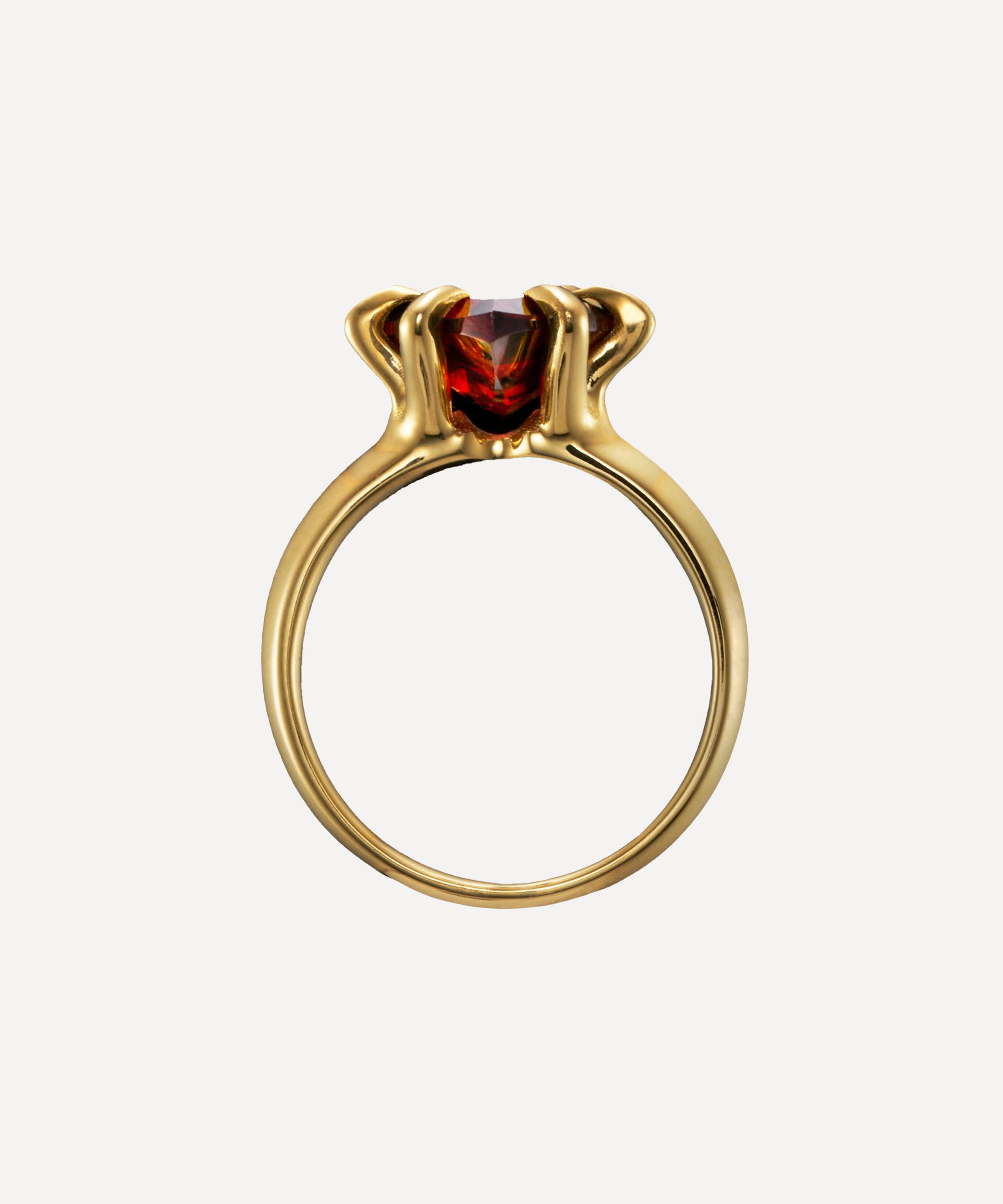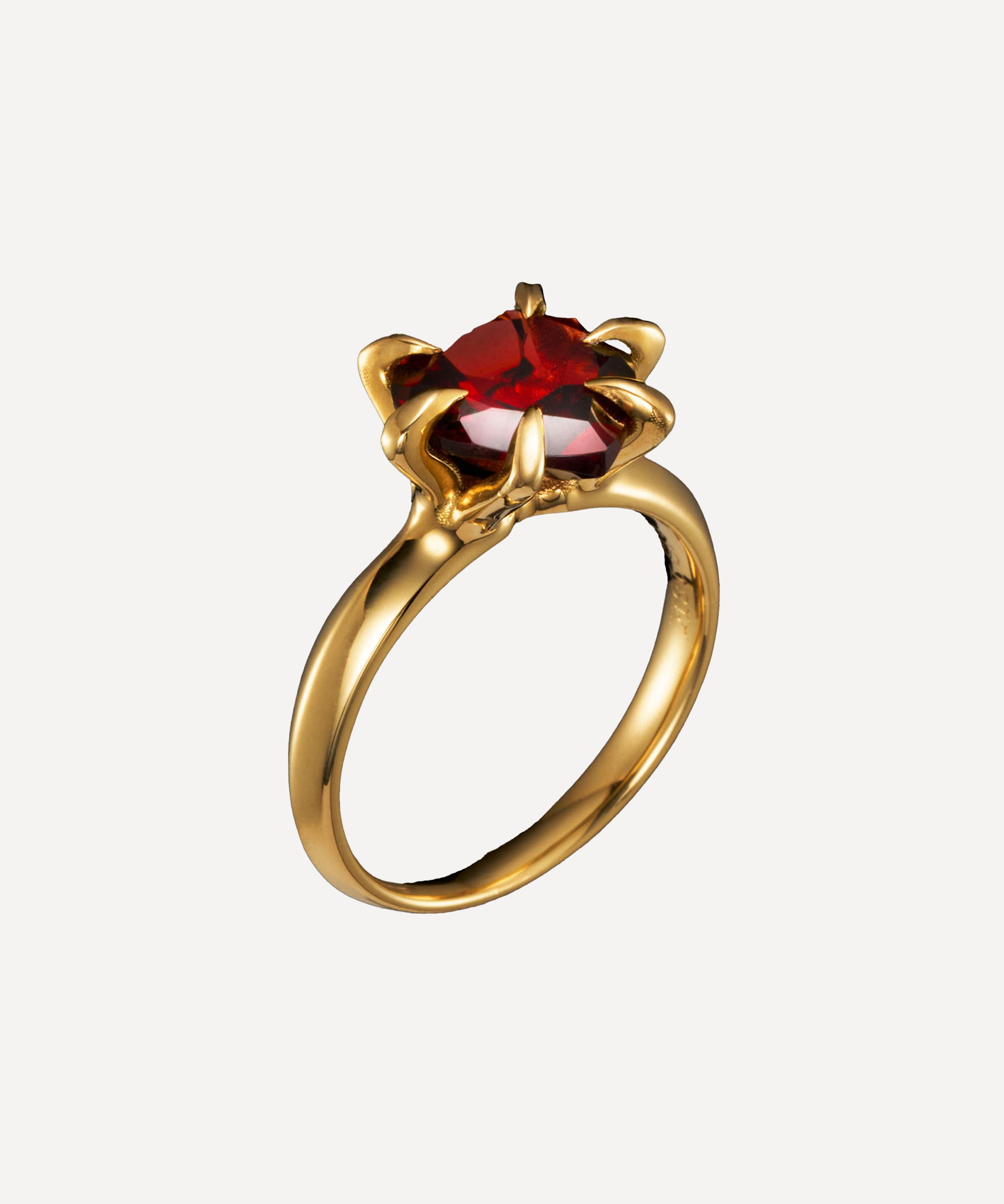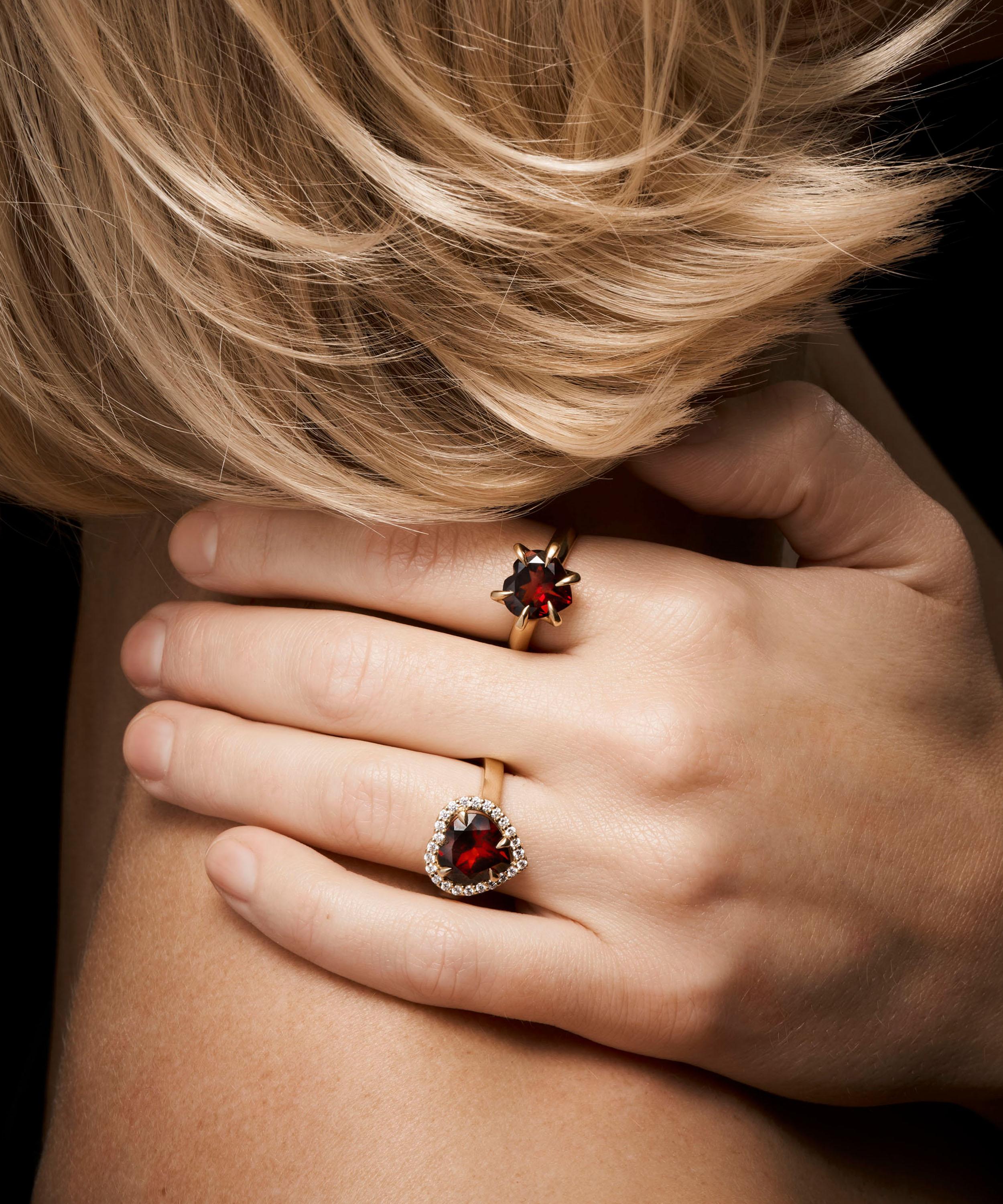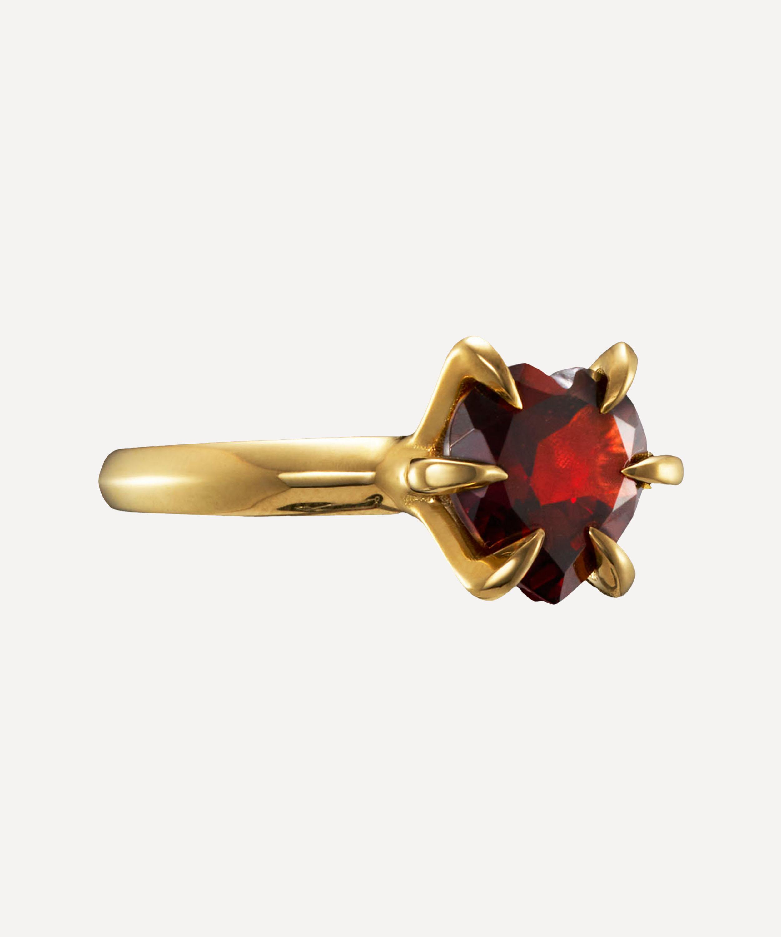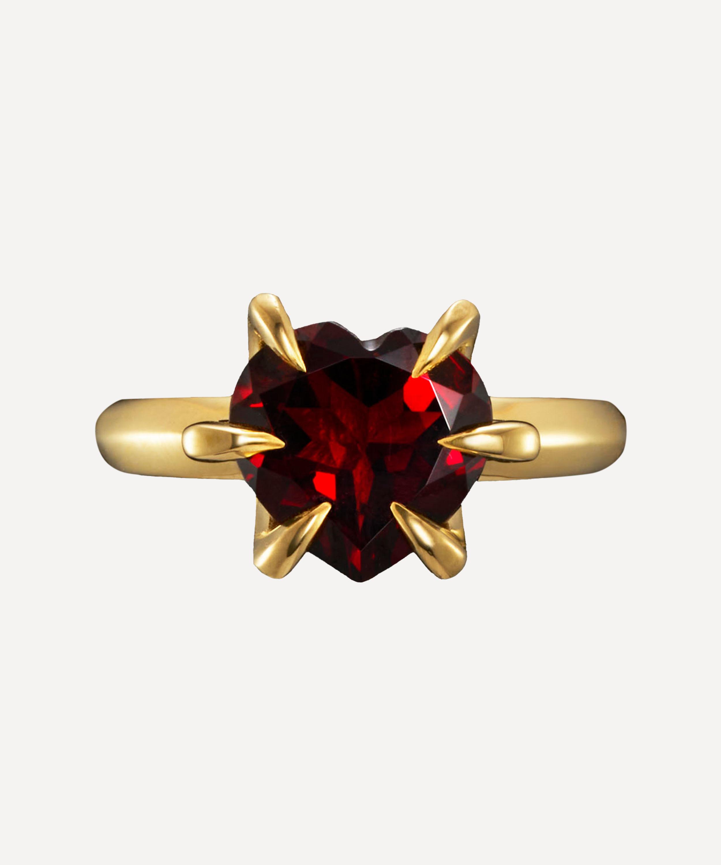 Breathe new life into your jewellery box with the Captured Heart ring from Maria Nilsdotter. Exuding an endearing beauty with gothic undertones, it centres around a claw set red garnet heart on a slim band in 18ct gold – boasting a reinterpretation of the classic engagement ring. Perfect for both occasion wear and elevated everyday looks, style it solo, incorporate it into a stack, or pair it with matching pieces from the brand.