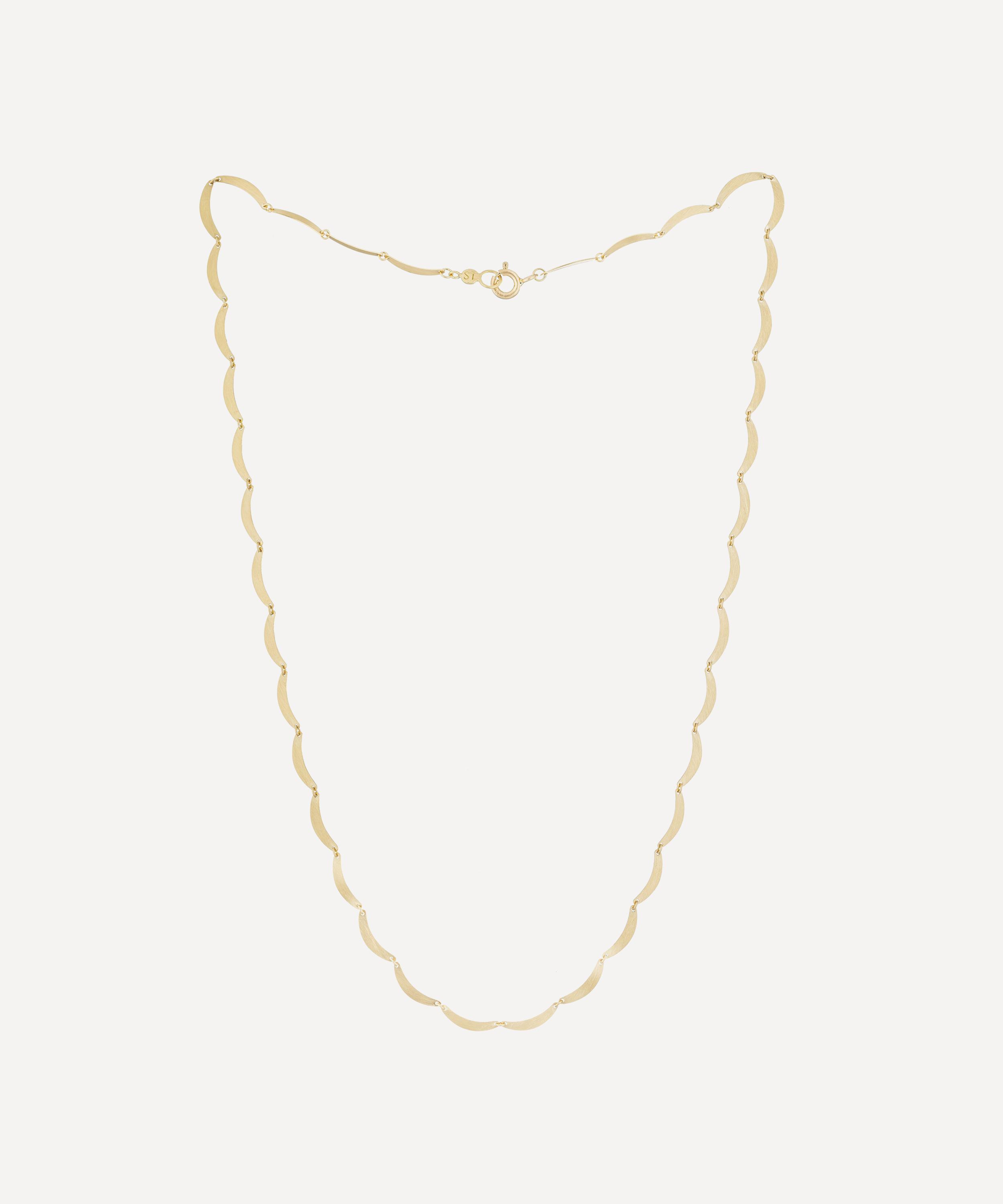 Handcrafted from 18ct gold, it boasts a minimal yet sculptural piece, featuring an undulating silhouette composed of, smooth, crescent-shaped links. Beautifully styled as a solo piece, it can also be layered with other gold necklaces from the brand or your own collection.