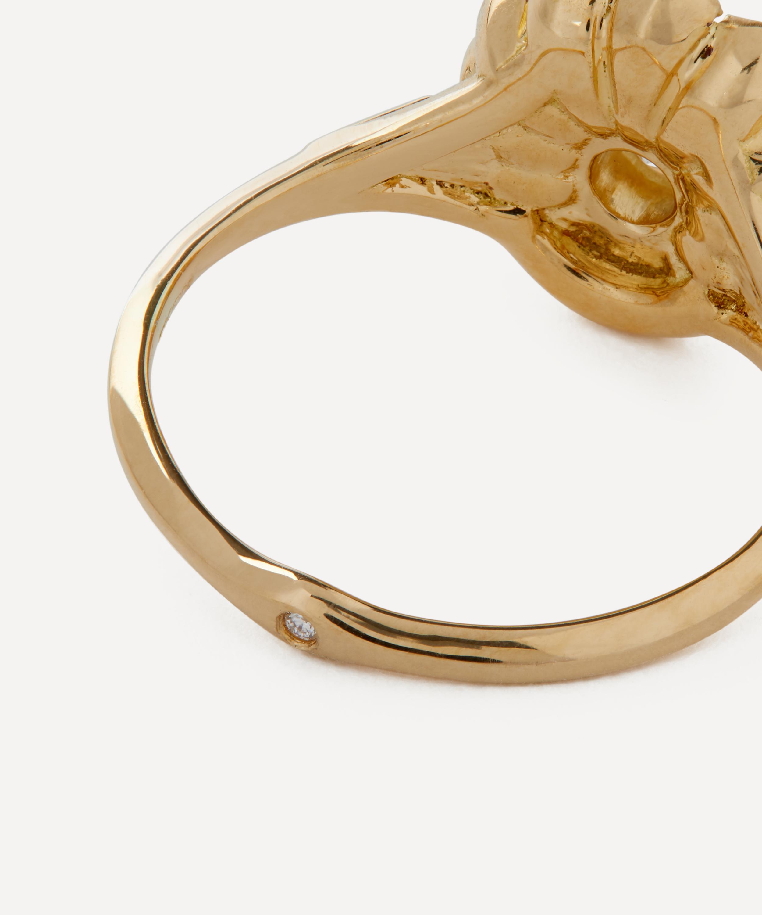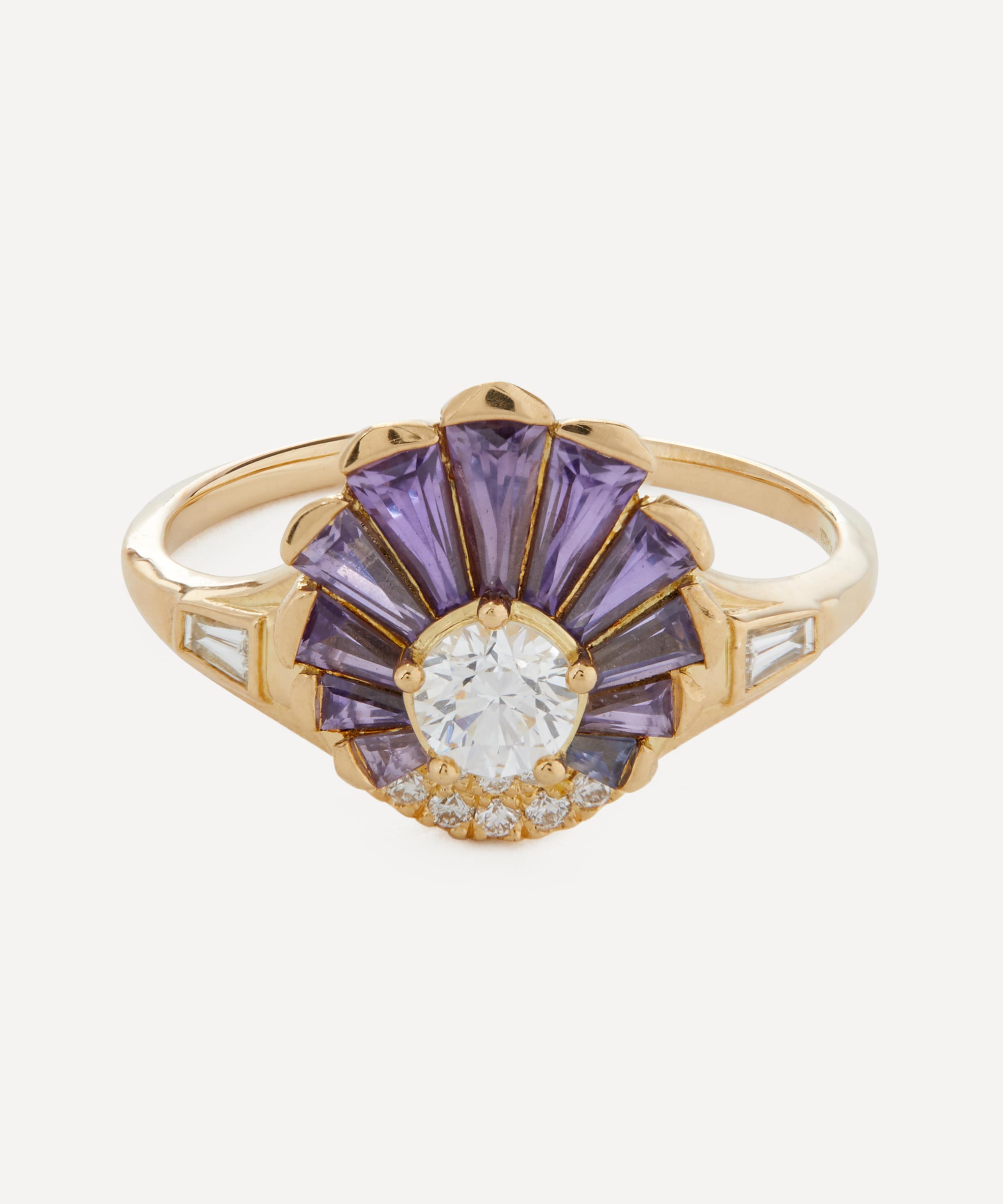 The Deco Sapphire engagement ring from fine jewellery brand Artemer exemplifies the designer’s expert eye for divine compositions. A symbol of love and dedication, this ring is crafted from solid 18ct gold, featuring a slim band adorned with a round centre diamond surrounded by purple tapered-baguette sapphires. The deco-inspired feature is finished with round pave diamonds, and tapered diamonds on either shoulder. Style it solo, stack it with a wedding band or team it with other gem encrusted rings for a beautiful curation that’s out of this world.