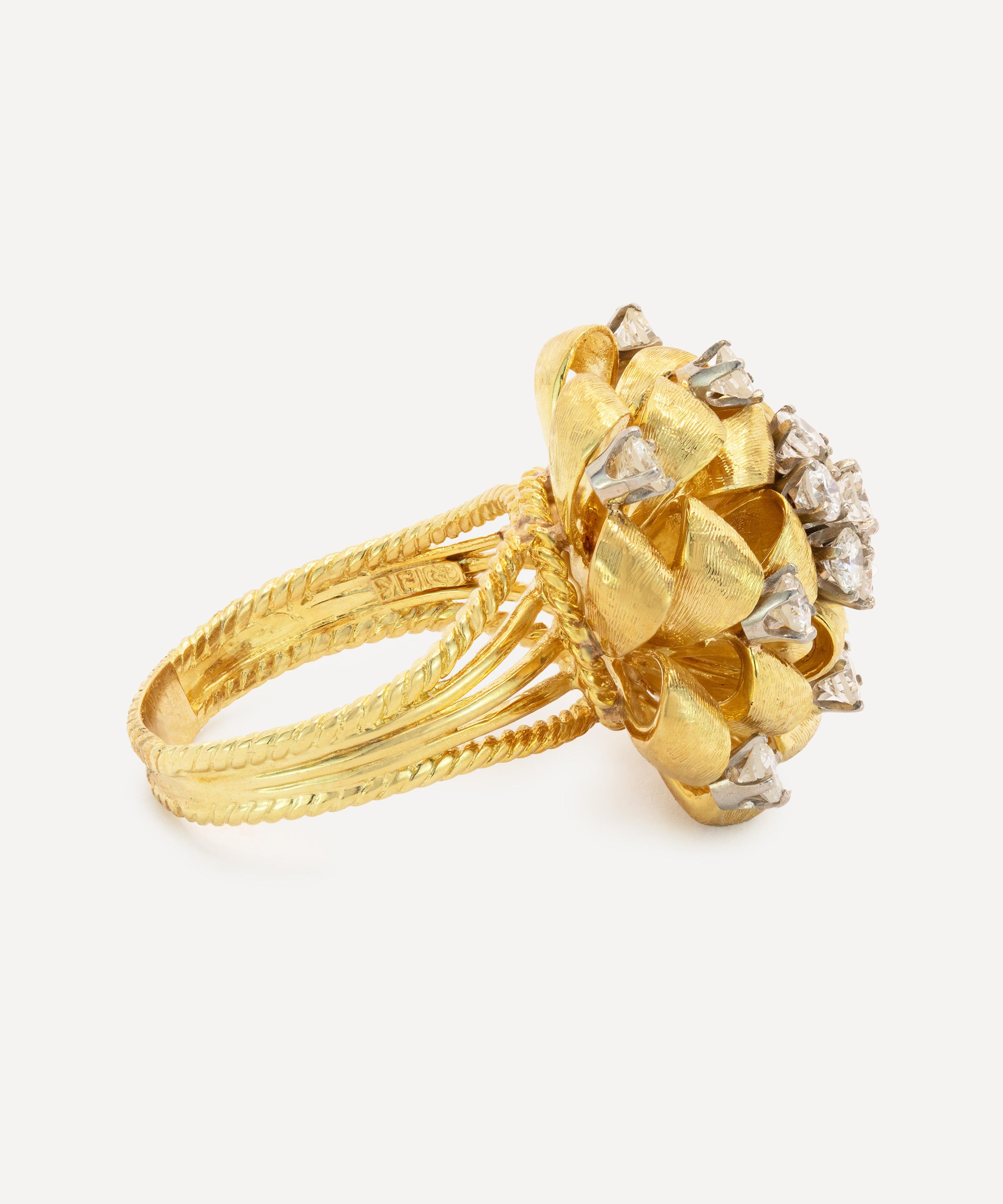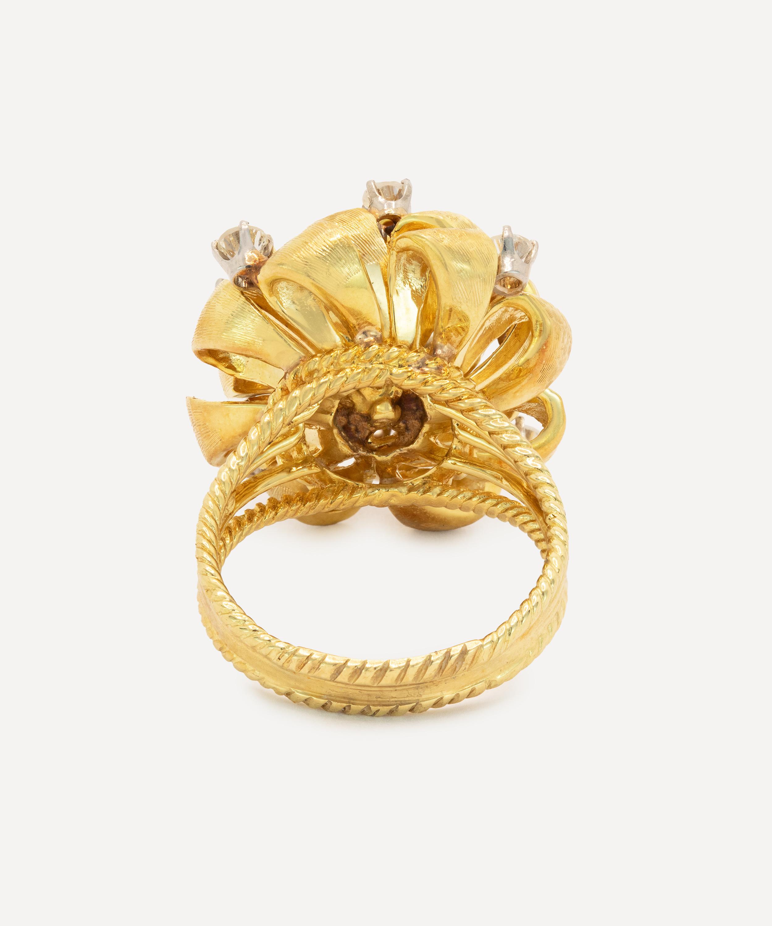 Rendered in 18ct gold, it features a ribbon-twist floral motif. The centre of the flower is set with a cluster of seven round brilliant cut diamonds, with eight more diamonds spaced through the petals. The flower is crafted in textured gold and sits on a twisted yellow base, leading to split shoulders composed of twisted outer bands and three polished inner bands. Whether worn as a statement of refinement or a whisper of vintage charm, it will steal the spotlight and elevate every ensemble with its undeniable presence.