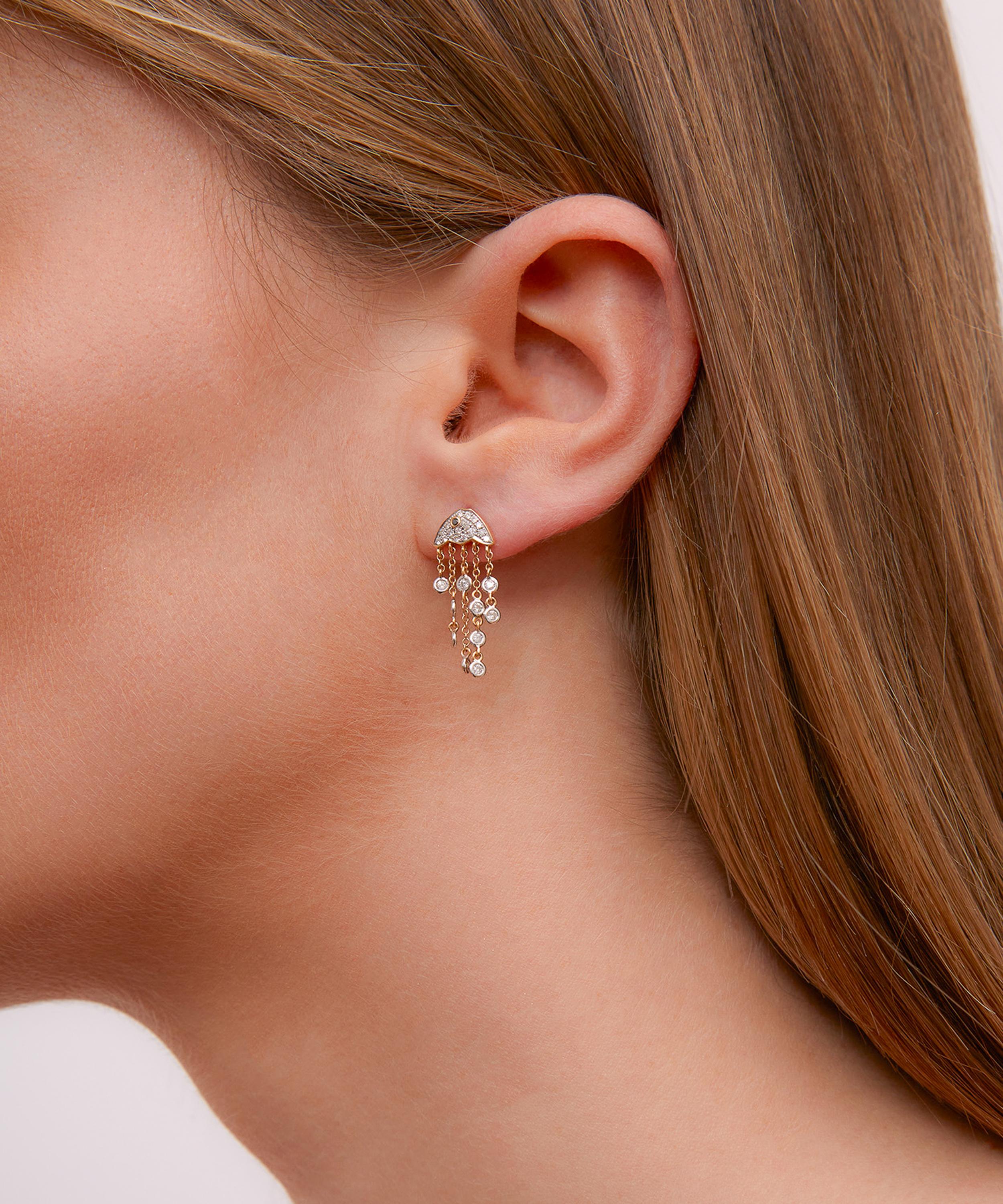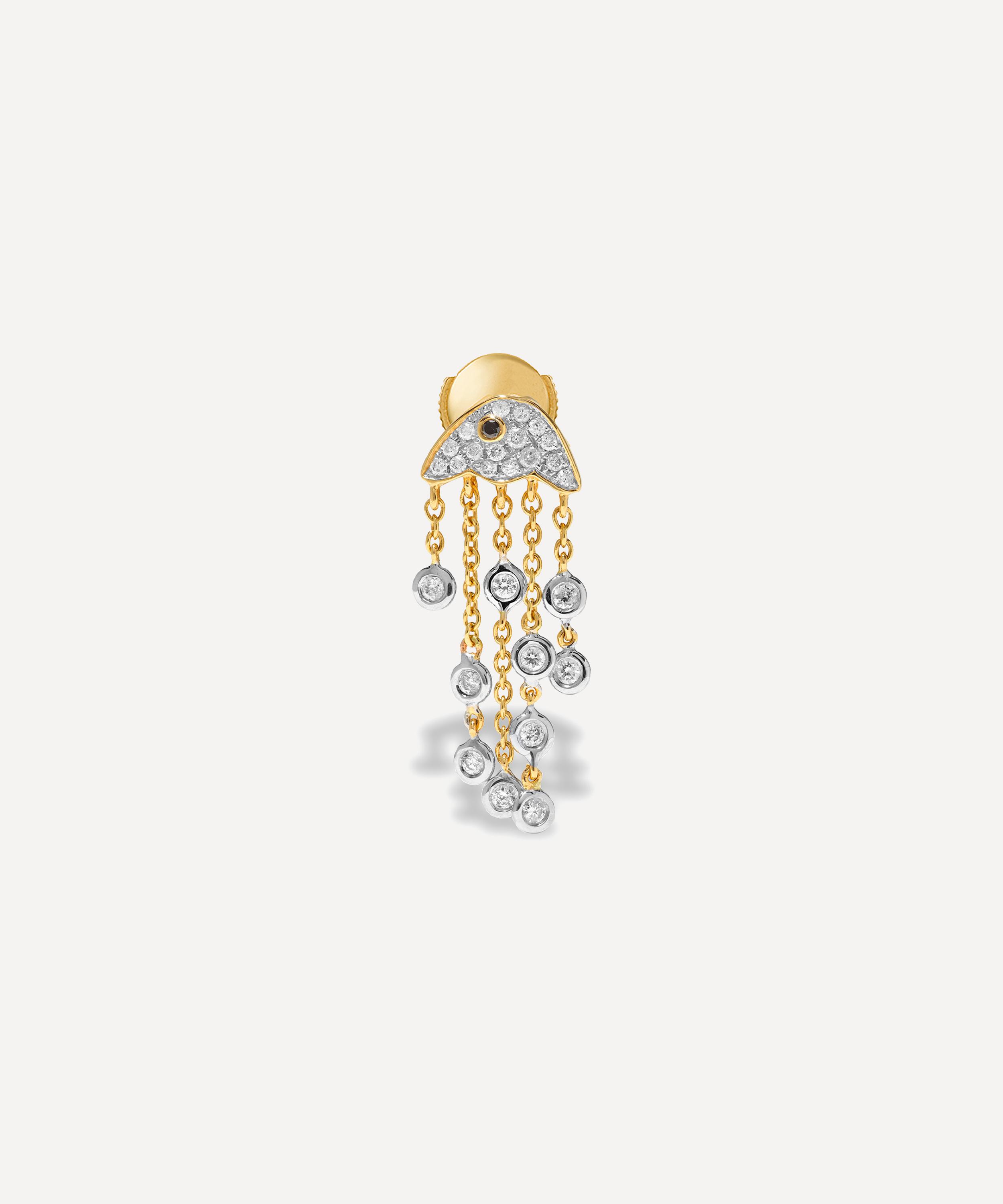 Delve into a world of vintage classics and tie your whole look together with this drop earring from Yvonne Léon. Crafted from 18ct gold, this single earring features a diamond jellyfish design adorned with a tiny black diamond and chain links with grey diamond drops. Style it as part of a curated stack, or get two for a matching pair.