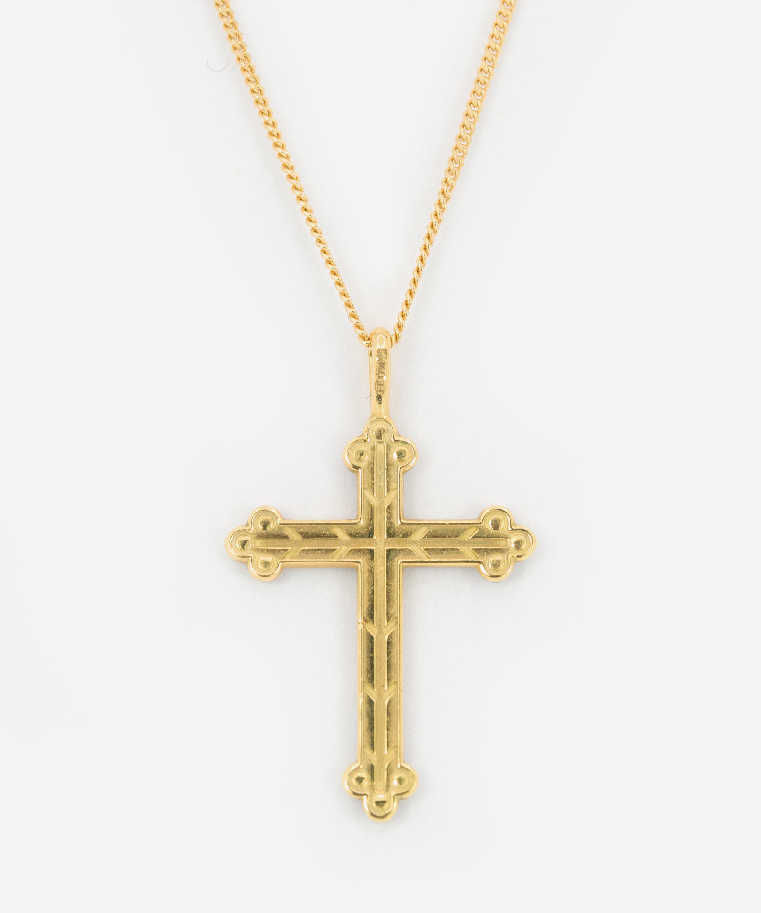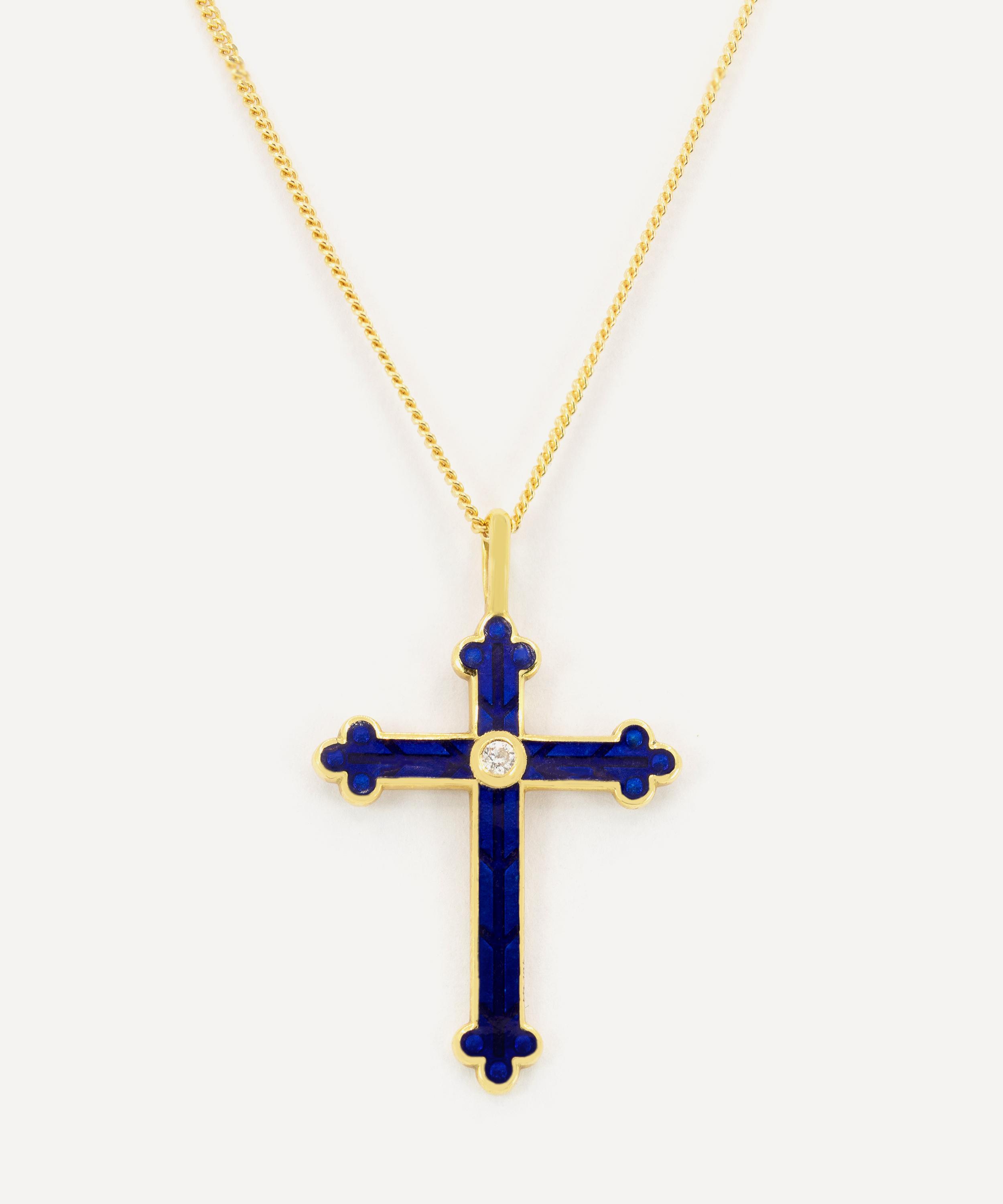 Suspended from an 18-carat gold curb link chain, this necklace features a dark blue enamel budded cross, set with a single diamond in the centre. Offering a modern alternative to the brand's signature elaborate antiques, style it with pulled-back hair and an array of single gemstone studs for an understated evening look.