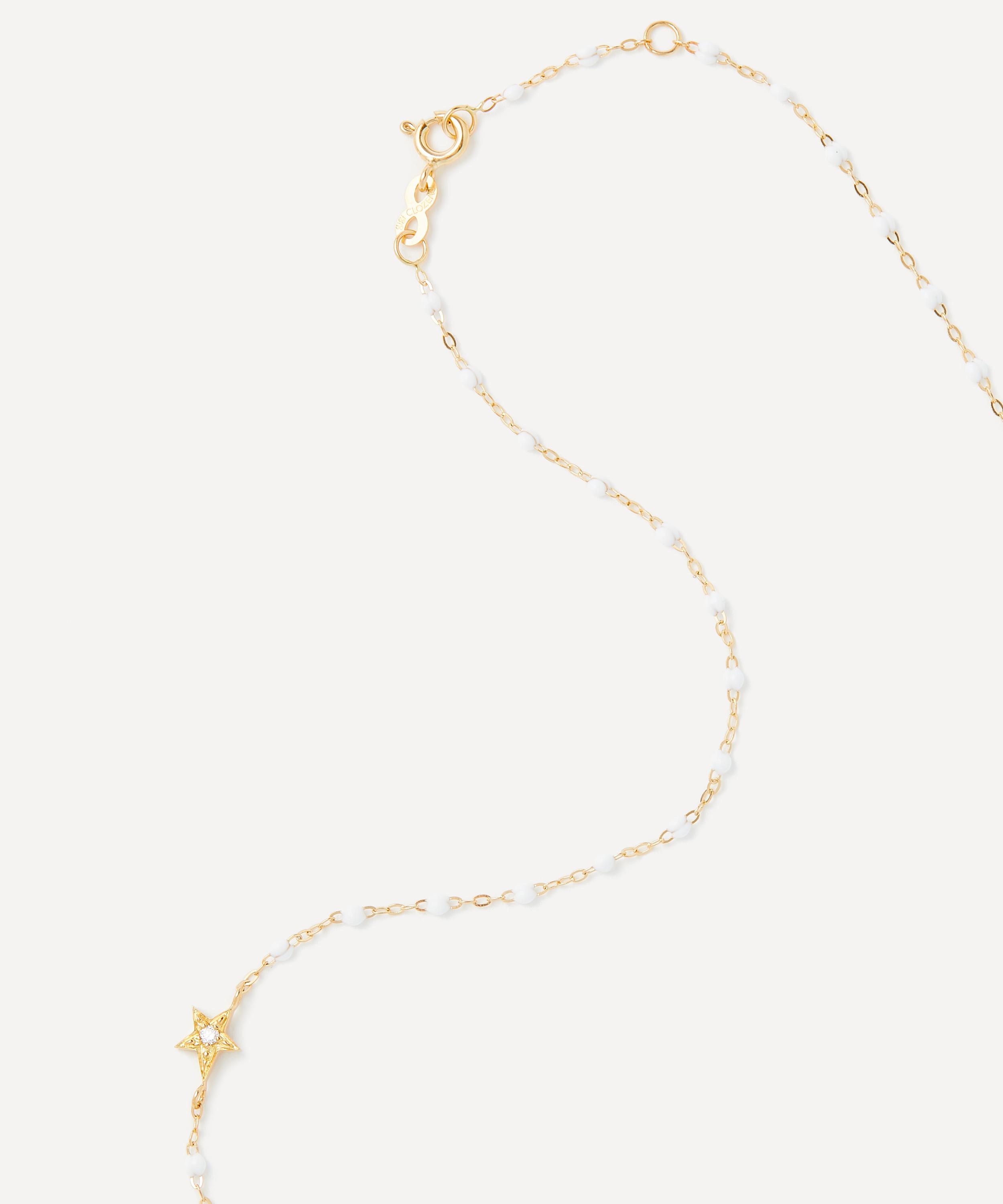Paying homage to her family’s traditions and background in jewellery-making, the Etoile Classic Star bead necklace by Gigi Clozeau boasts a sparkling take on her signature design. Crafted from 18ct gold, it features a classic link chain adorned with white resin beads and an intricate star charm set with a tiny diamond at the centre. Designed to be layered, wear this piece with additional necklaces from the brand, or pair with the matching bracelet.