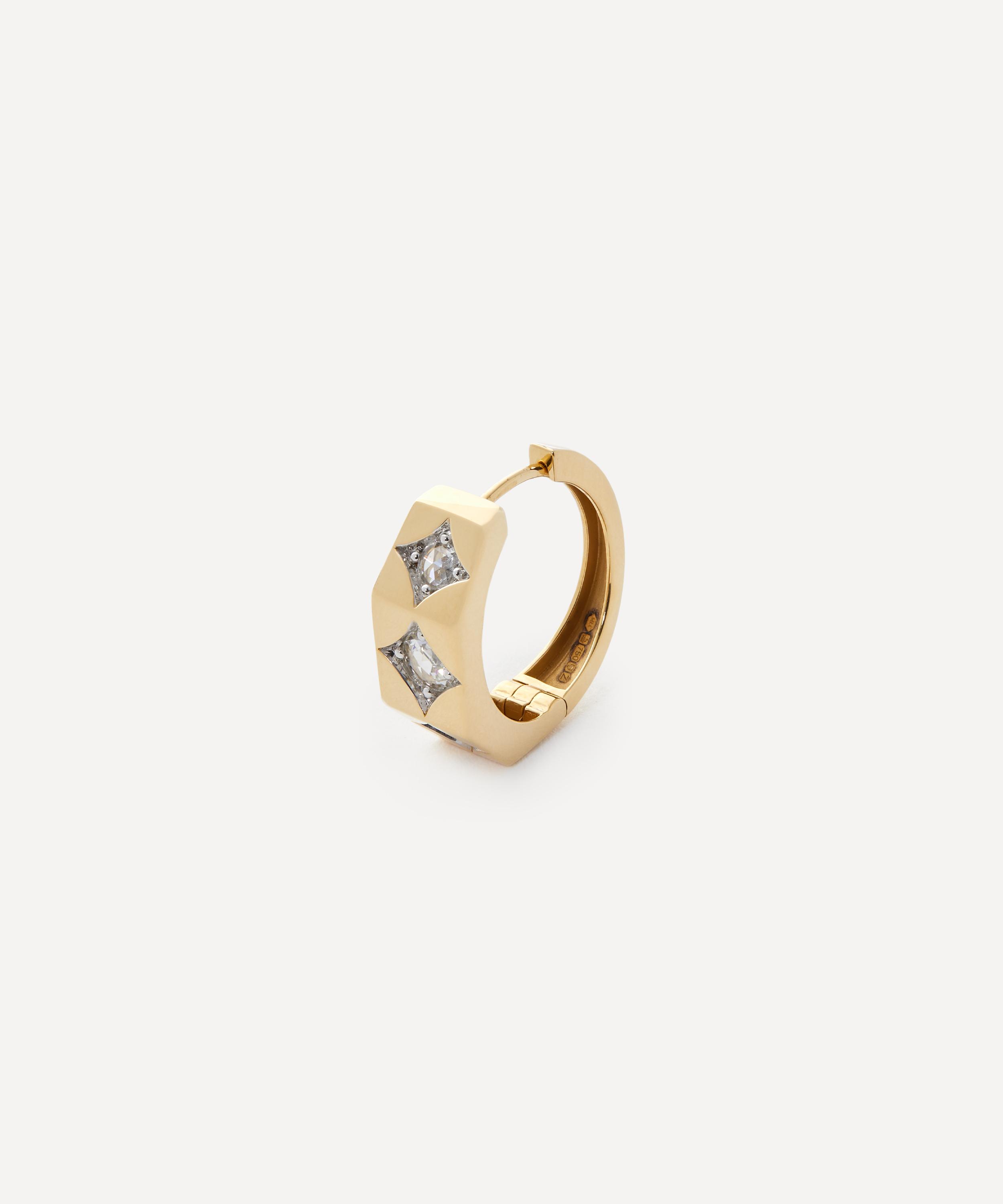 Add a playful touch to your ear curation with the Ecrou hoop earring from Marie Lichtenberg. Crafted from 18ct gold, this single earring features a squared, geometric silhouette adorned with rose cut, star set diamonds. Complete in a polished finish, it will effortlessly brighten up any ear stack with its whimsical spirit.