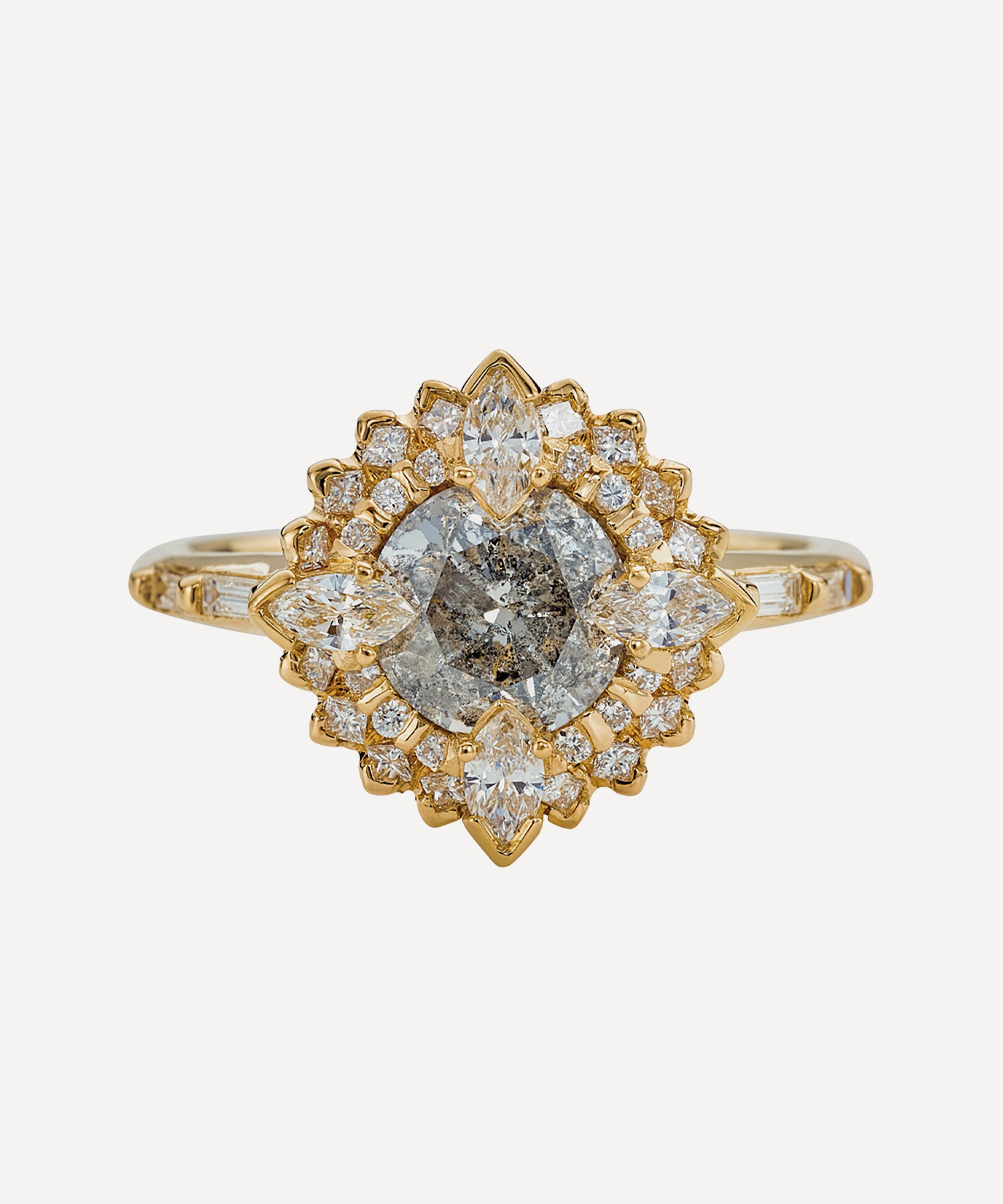 This engagement ring from fine jewellery brand Artemer exemplifies the designer’s expert eye for stunningly cut gems and divine compositions. A symbol of love and dedication, it’s crafted from solid 18ct gold, featuring a lotus inspired design beautifully composed of a one-of-a-kind, brilliant cut salt and pepper diamond, surrounded by a cluster of marquise, princess and baguette cut white diamonds. Style it solo, stack it with a wedding band or team it with other gem encrusted rings for a beautiful curation that’s out of this world.