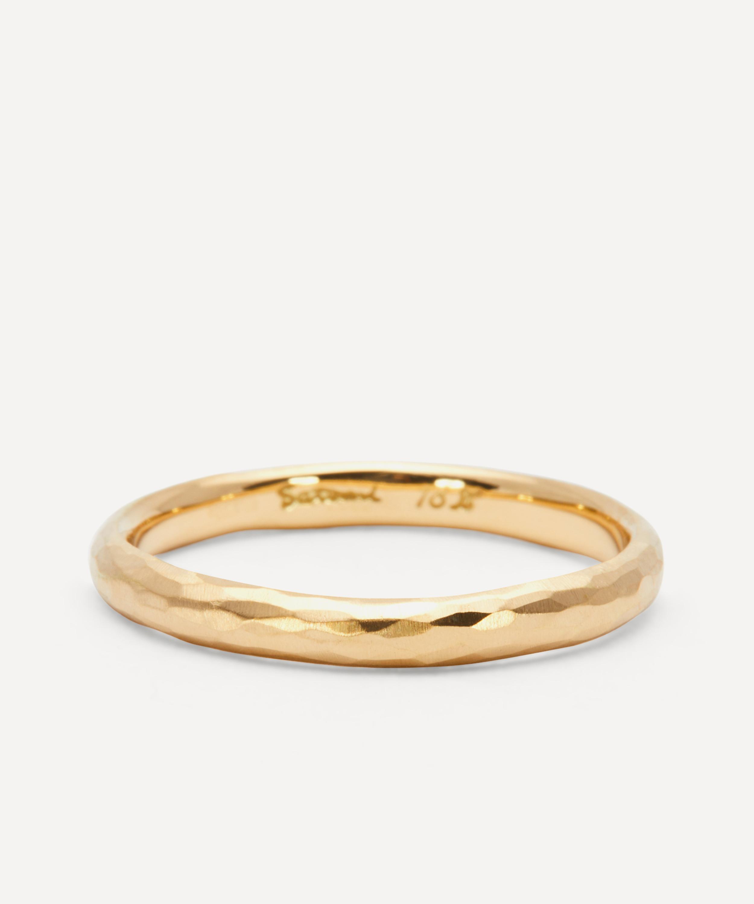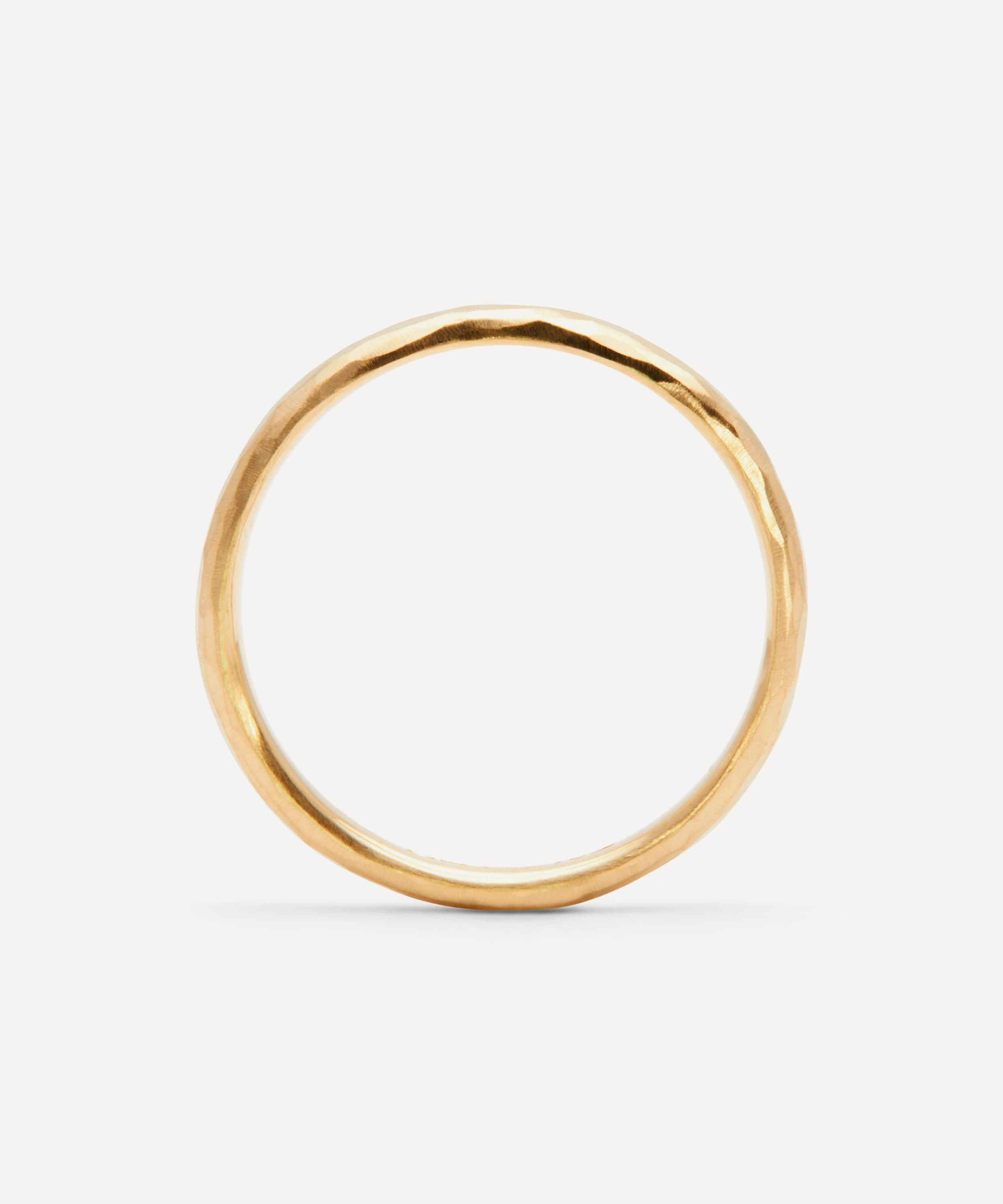 Handcrafted from solid 18ct gold, this versatile ring features a thin, half-round band in a polished, hammered texture, offering a rustic yet elegant aesthetic. Exemplifying the designer’s truly timeless approach to everyday jewellery, it can be styled as an everyday piece or as a unique wedding band.