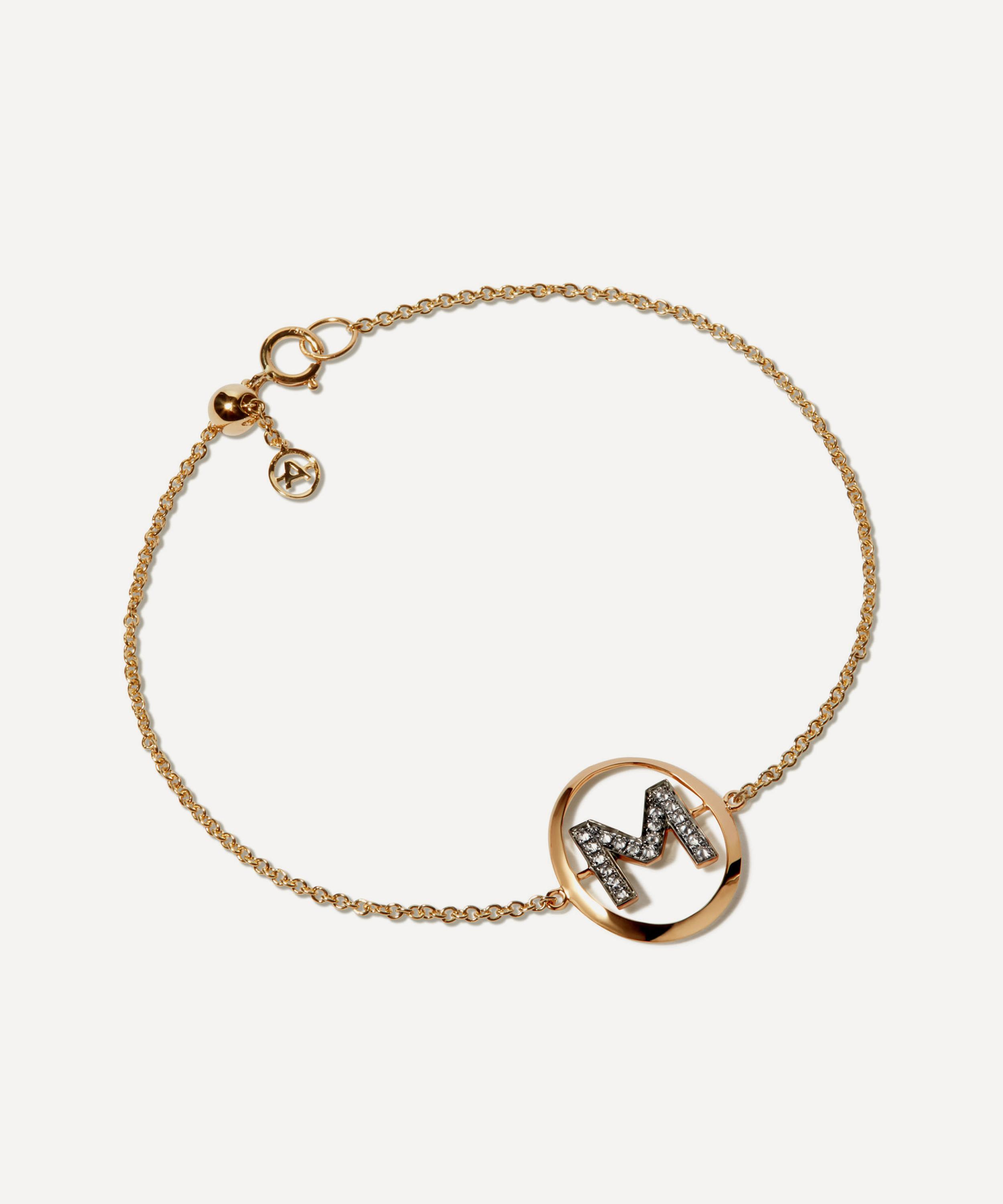 Annoushka offers its signature sophisticated take on alphabet jewellery with the gold Initial bracelet – a simple fine gold chain set with a 22-diamond letter fixed inside a polished gold oval.