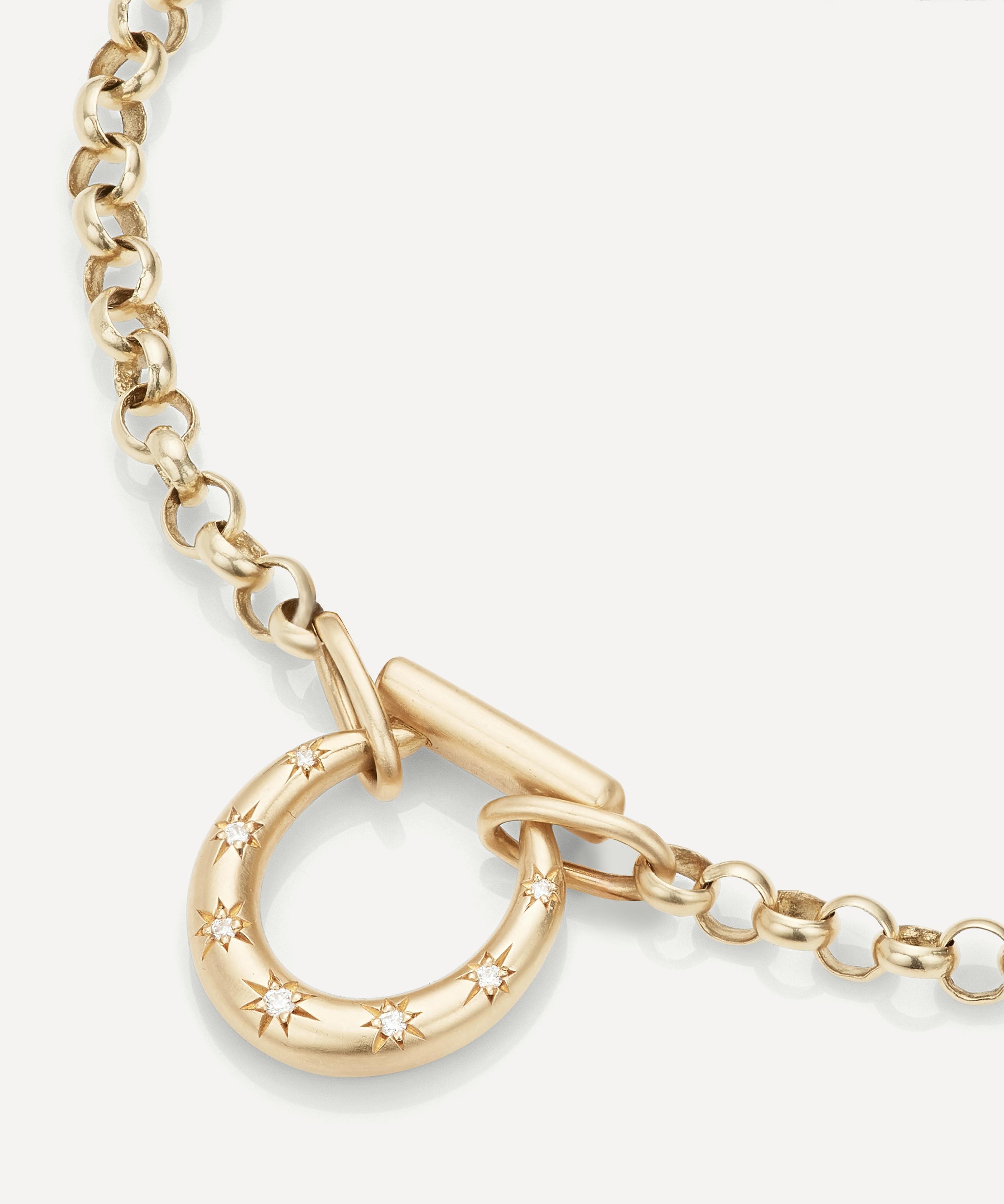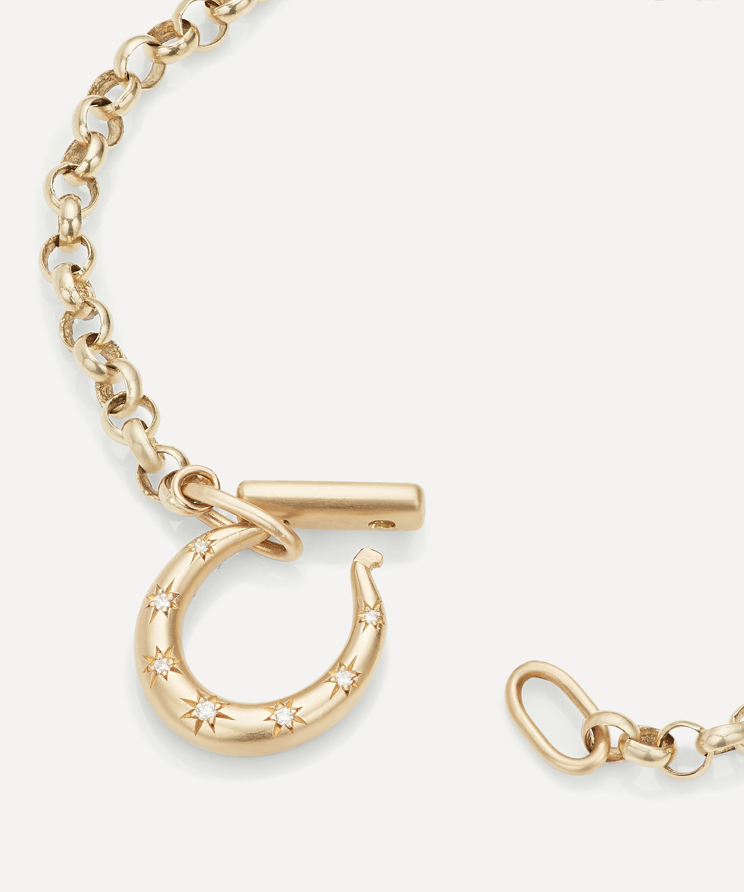 Handcrafted from frosted 18 carat gold, this elegant piece boasts a heavy round belcher chain design, complete with a horseshoe-shaped clip closure, a mythical symbol of luck and protection steeped in centuries of history – complete with seven sparkling, brilliant cut diamonds, a nod to an age-old Irish proverb.