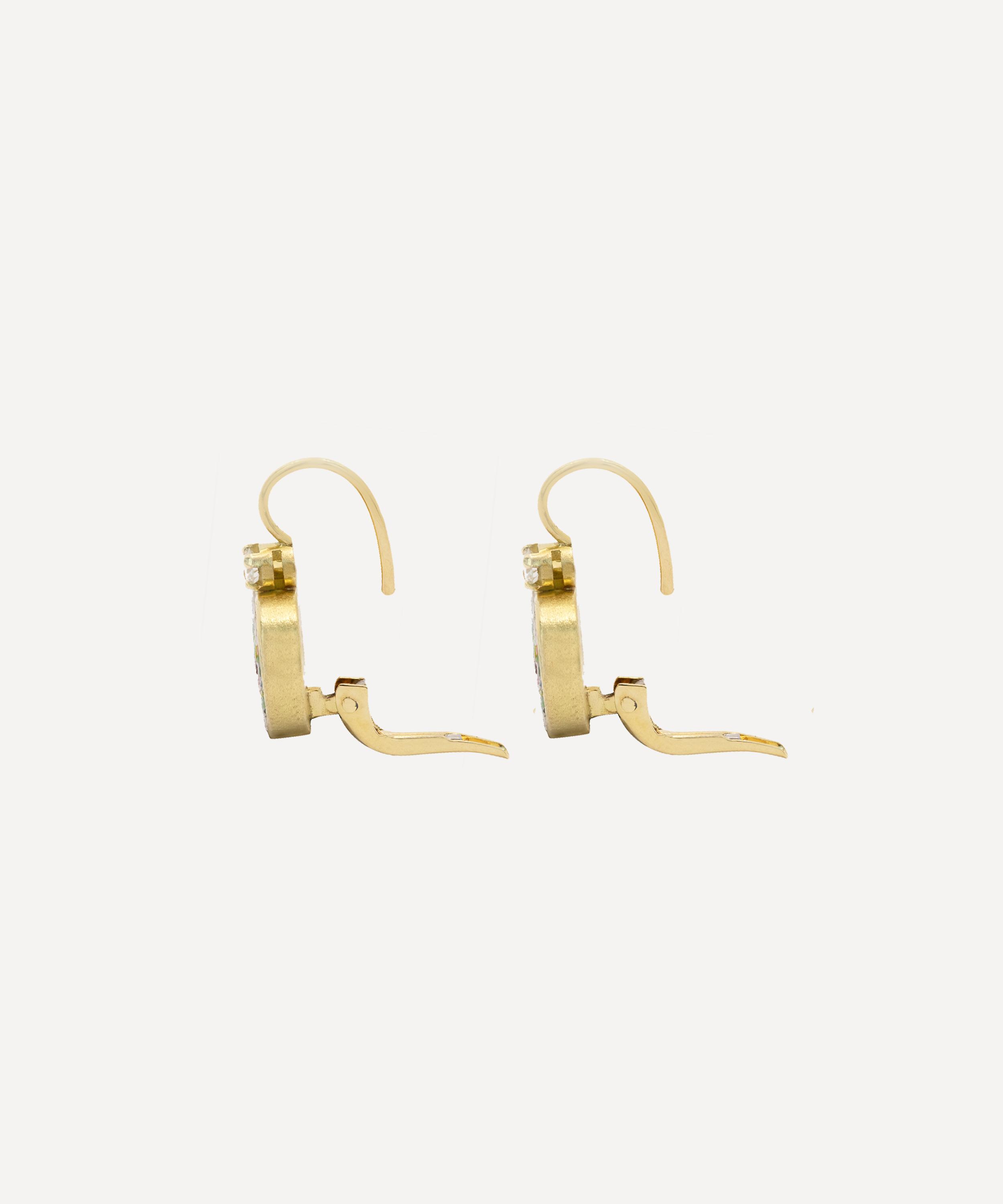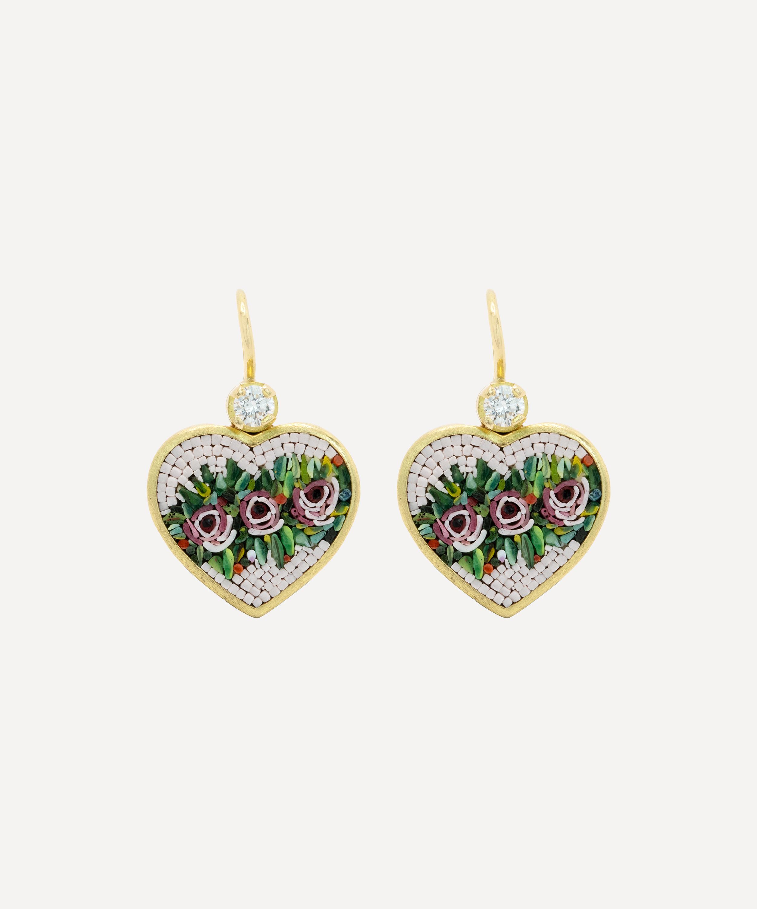 These artistic, exceptionally intricate drop earrings are from antique purveyor Kojis. Handmade in Italy from 18ct gold, each earring features a heart-shaped micro mosaic drop – a jewellery practice popular in the 18th and 19th centuries – depicting three pink roses on a bed of green leaves, framed by a light pink background. The decorative mosaic is surrounded by a gold border and set with a single round brilliant cut diamond at the top of the heart. The earrings are complete with a brushed gold finish and a French back fastening.