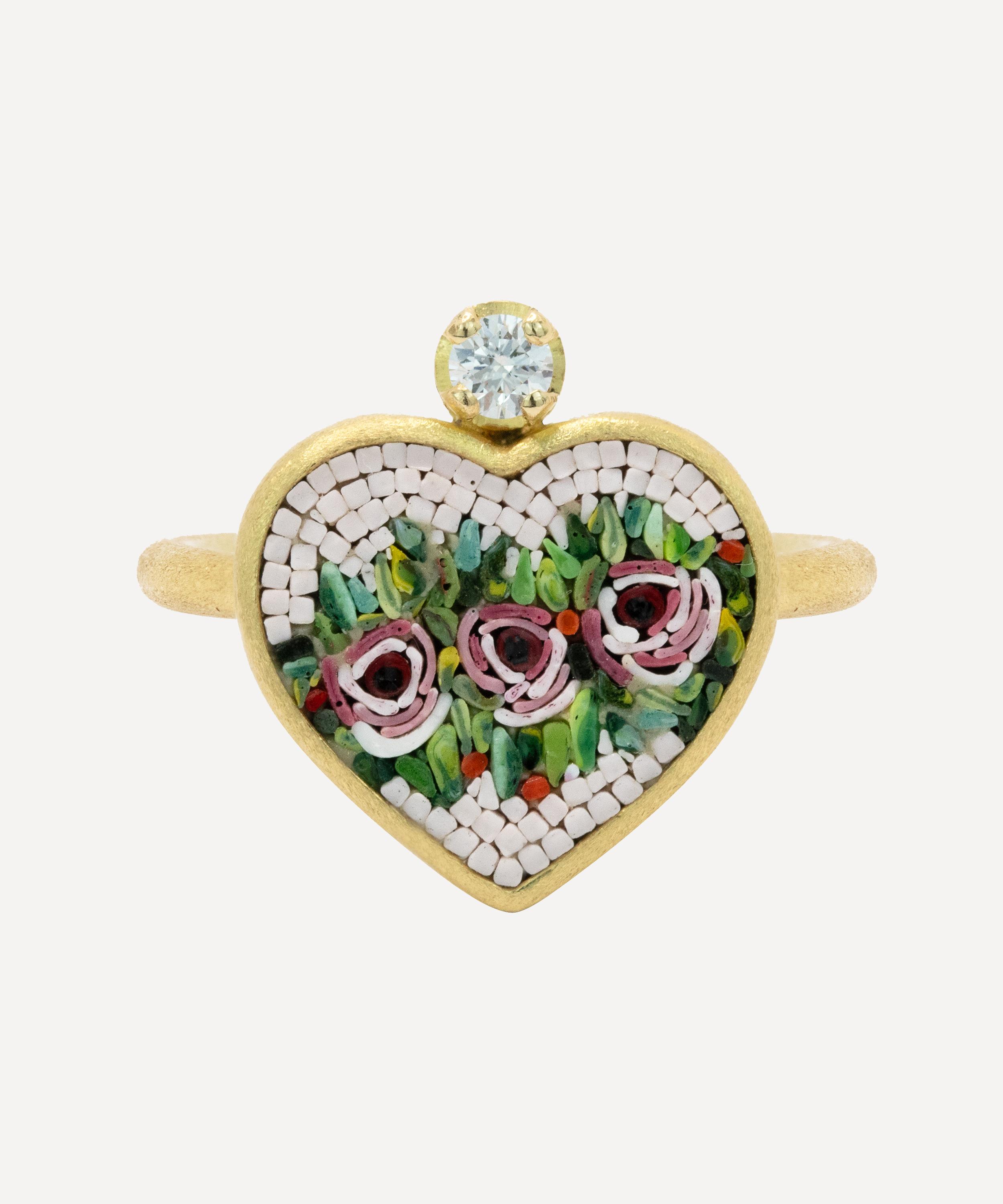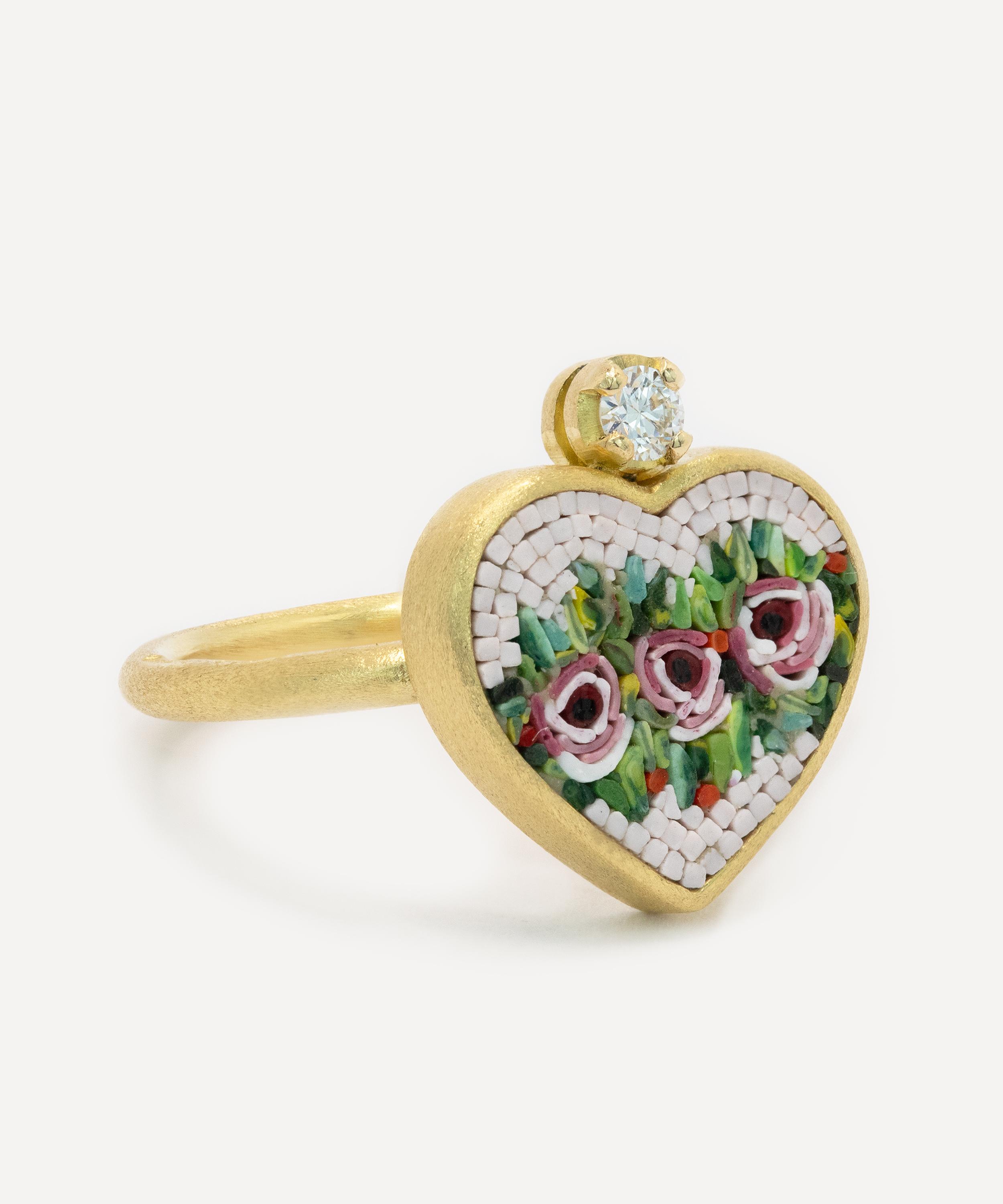 This artistic, exceptionally intricate ring is a one-of-a-kind masterpiece from antique purveyor Kojis. Handmade in Italy from 18ct gold, it features a heart-shaped micro mosaic – a jewellery practice popular in the 18th and 19th centuries – depicting three pink roses on a bed of green leaves, framed by a light pink background. The decorative mosaic is surrounded by a gold border and set with a single round brilliant cut diamond at the top of the heart. The ring is complete with a brushed gold finish and band.