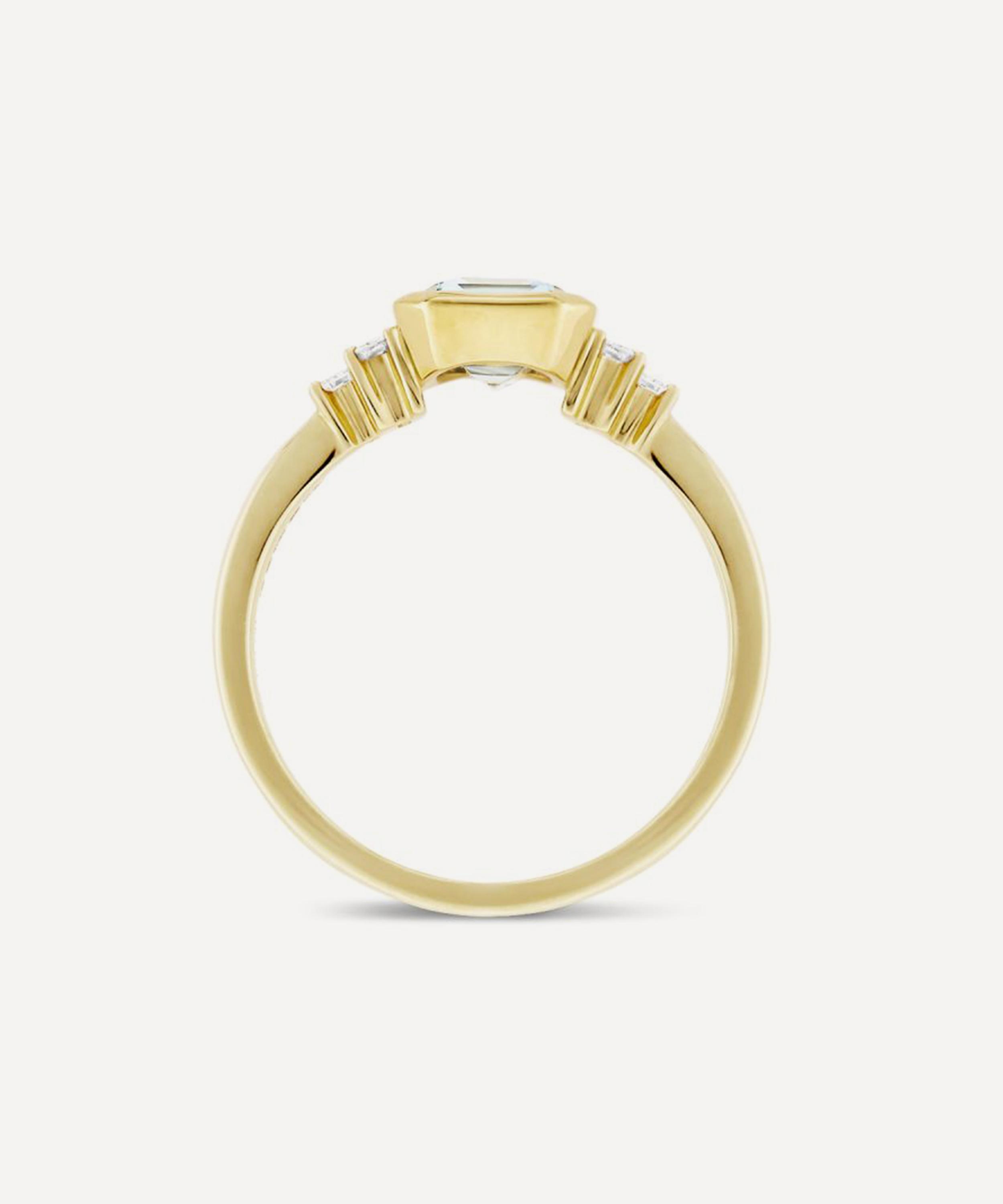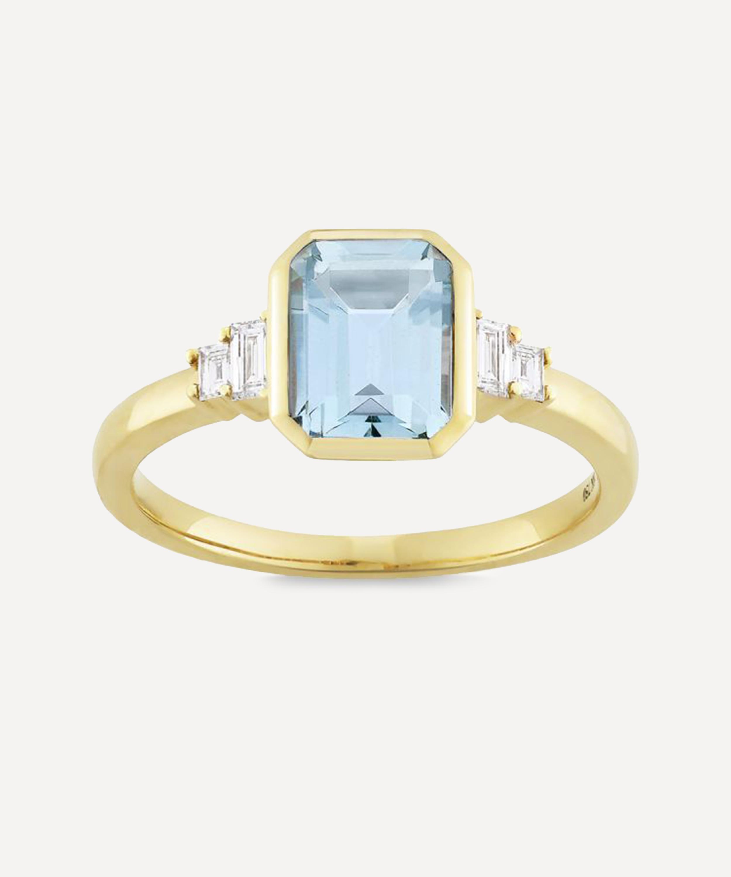 Exemplifying the designer's passion for coloured gems, this statement ring showcases a single emerald-cut aquamarine, presented in an 18-carat gold bezel setting flanked by baguette cut diamonds. The perfect starting point to a show-stopping curation of stacked rings and glittering gems, this piece will bring an impressive burst of colour to any special occasion look.