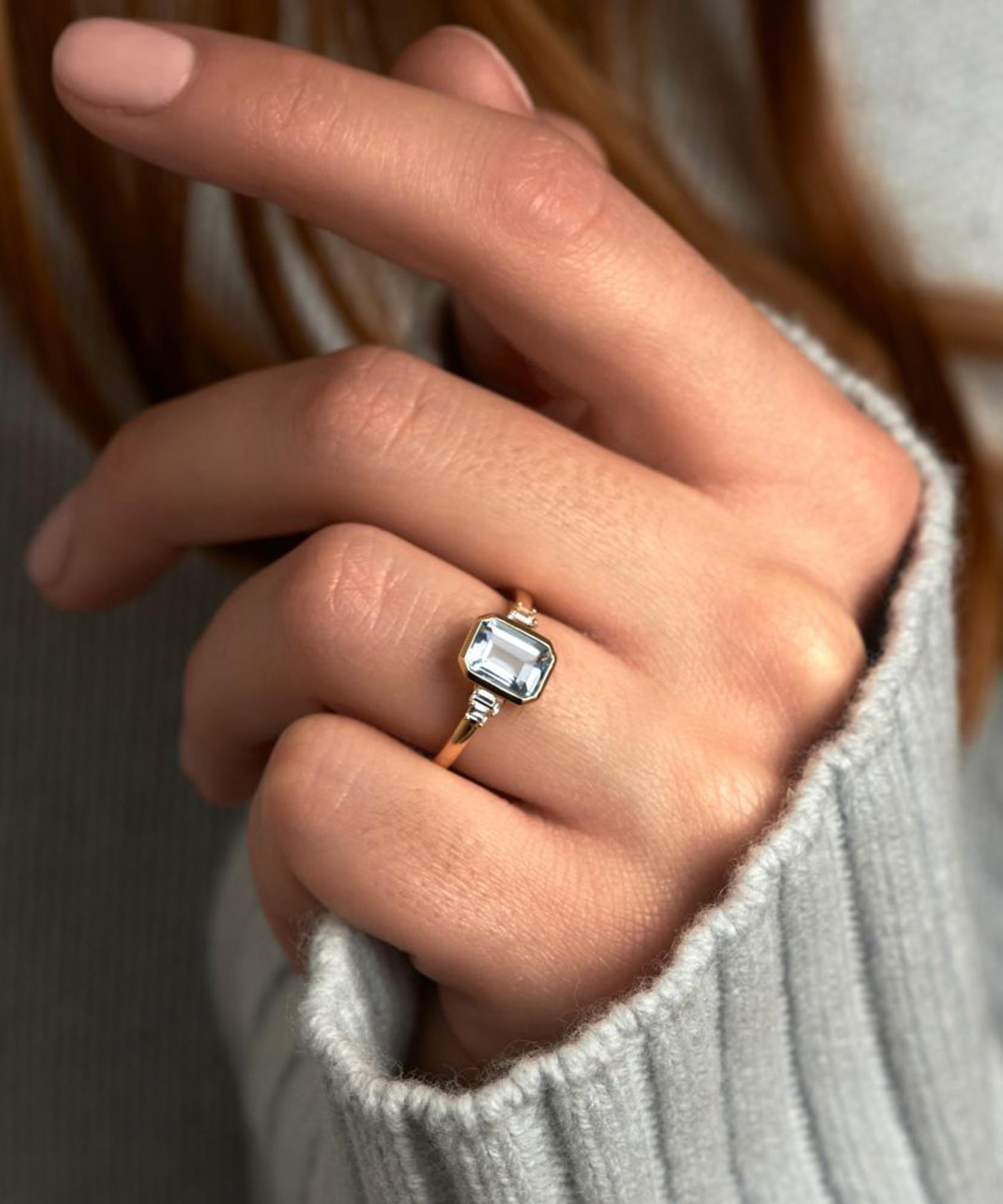 Crafted from solid gold, the Mila ring is an ornate aquamarine and diamond-encrusted piece from Dinny Hall's fine jewellery collection.