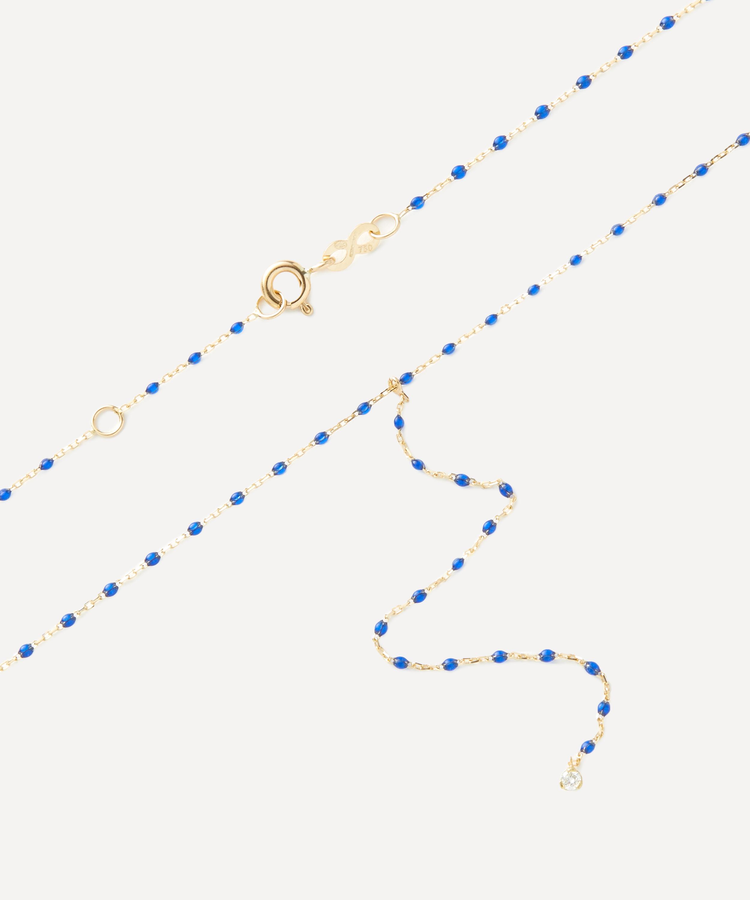 Crafted from 18ct gold, it features a classic link chain adorned with blue resin beads and a single striking diamond. Available in a range of different shades, try layering multiple necklace together for a vibrant stack.