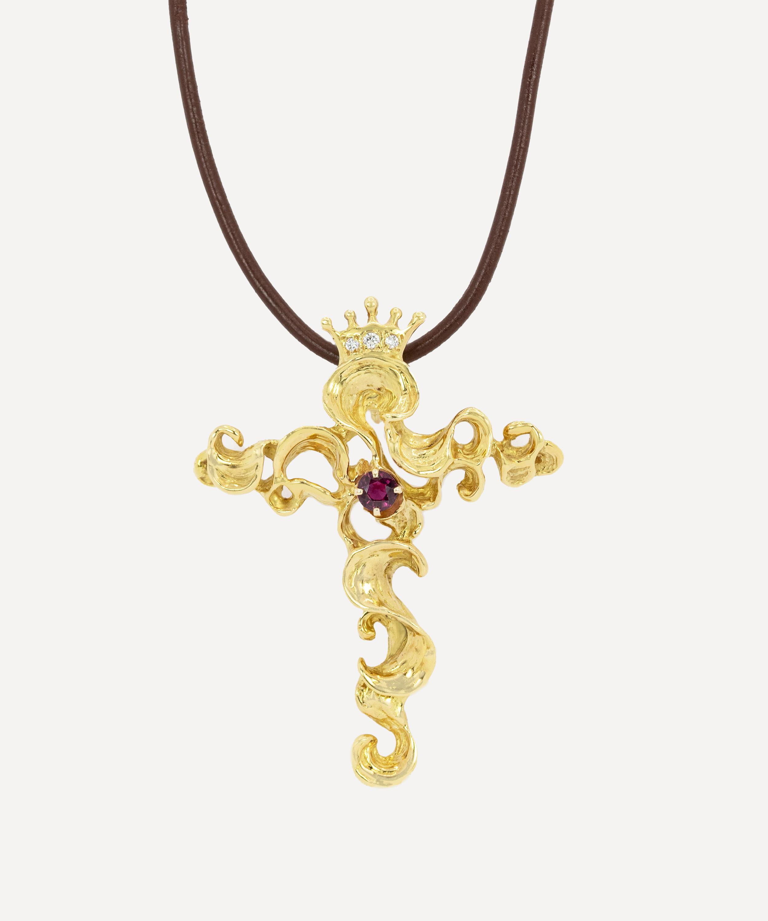 This beautifully crafted vintage cross from Kojis was made by American jewellery designer Gregory Appleby. Crafted from 18ct gold, it features a swirling design with a crown at the top containing three round brilliant cut diamonds. The cross is finished with a radiant ruby and is presented on a leather cord.