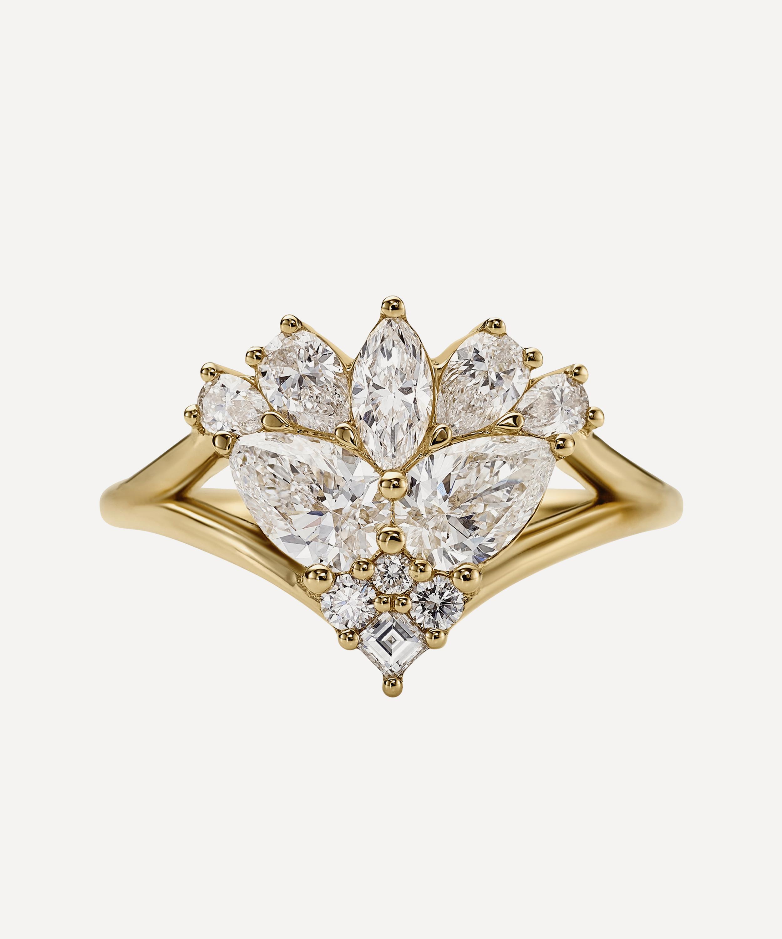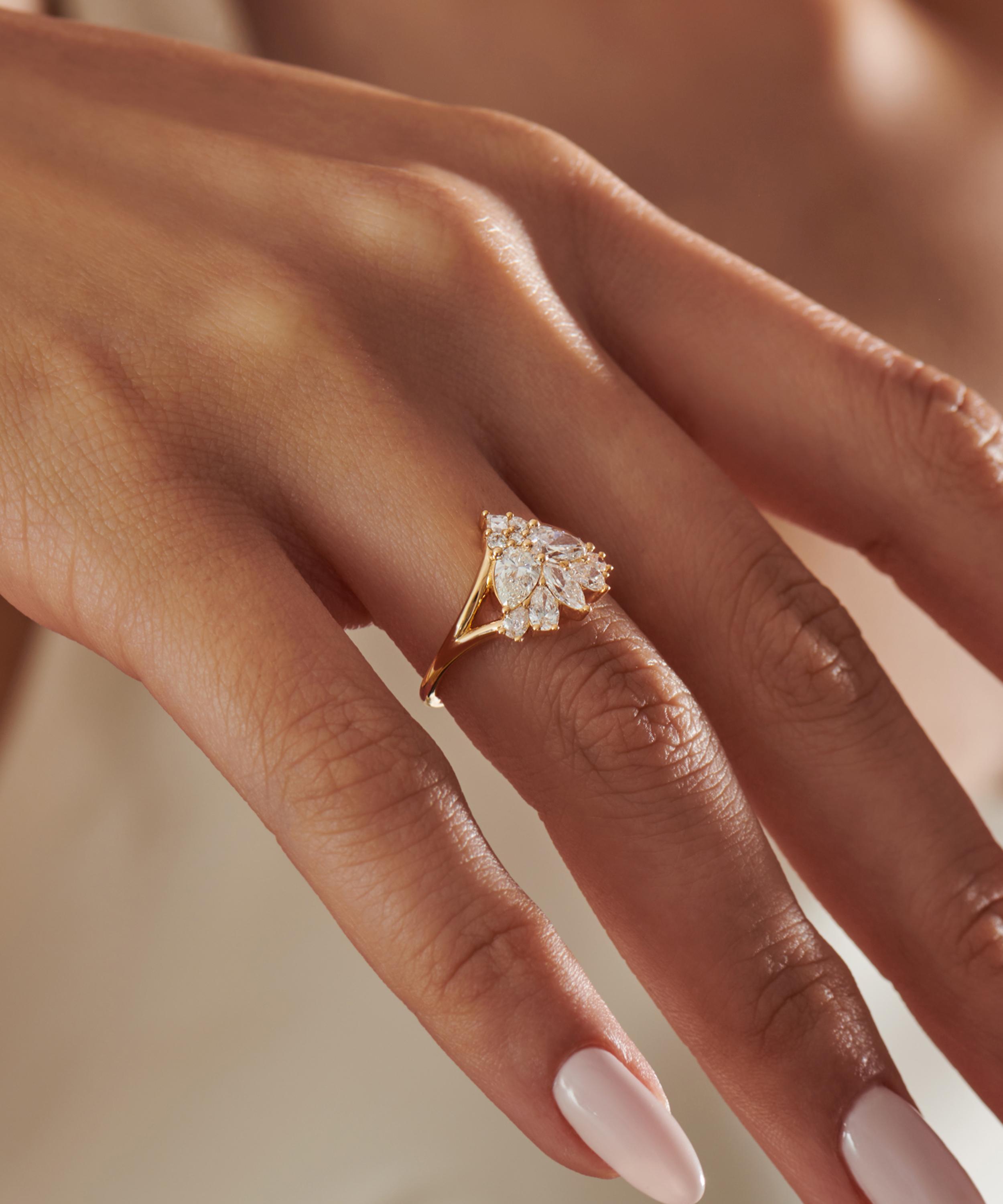 This engagement ring from fine jewellery brand Artemer exemplifies the designer’s expert eye for stunningly cut gems and divine compositions. A symbol of love and dedication, it’s crafted from solid 18ct gold, featuring a delicate assemblage of marquise, brilliant, carre, and pear cut diamonds supported by a split shank band. Style it solo, stack it with a wedding band or team it with other gem encrusted rings for a beautiful curation that’s out of this world.