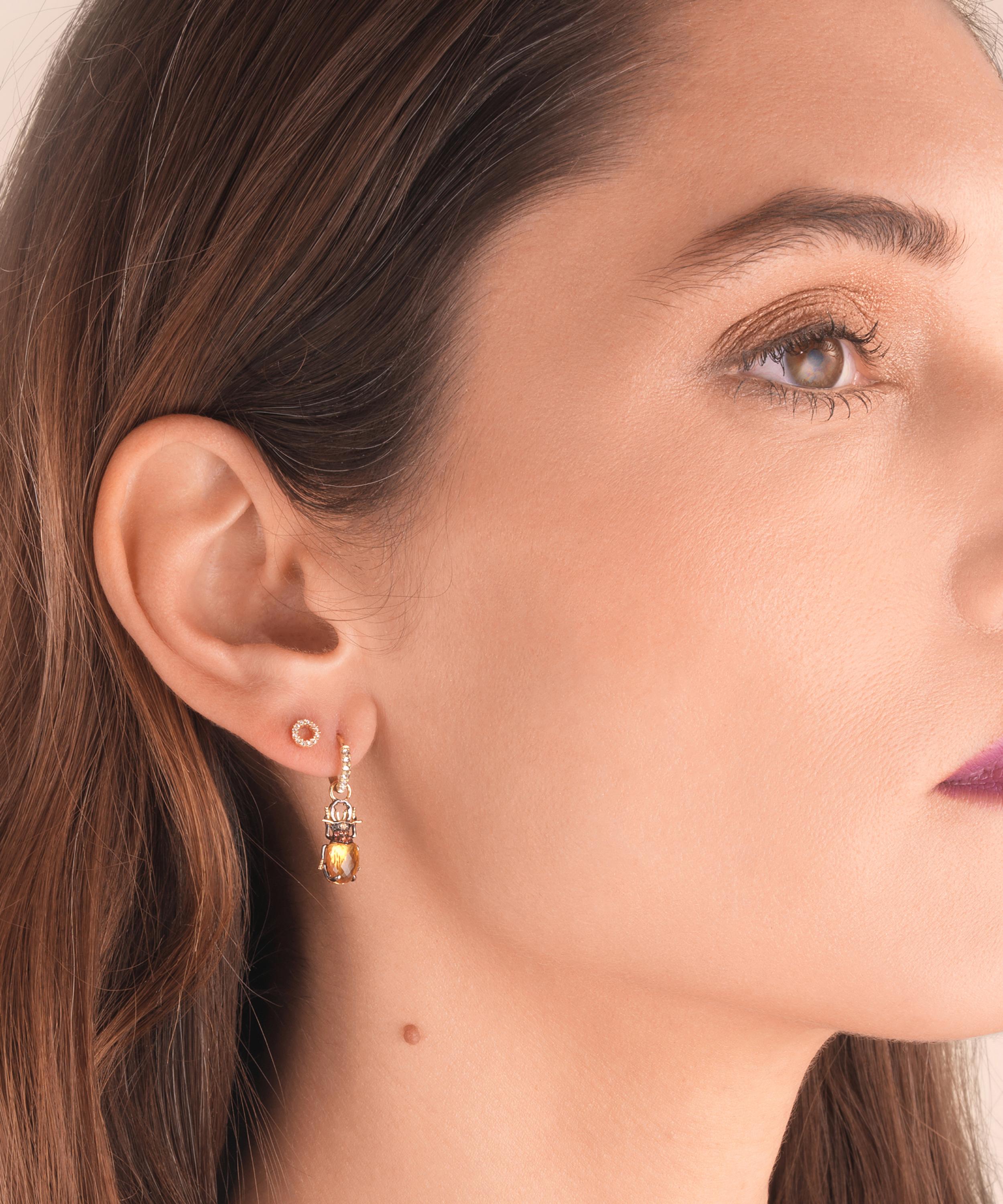 Crafted from high-polished 18 carat gold, this single earring drop features a tiny, intricately detailed gemstone beetle. A vibrant faceted citrine forms the body, while sparkling orange sapphire stones and black diamond eyes adorn the creature's head. Finished with touches of black rhodium to bring the design to life, mix and match it with other naturally-inspired drops from the collection for an artful update on classic hoops.