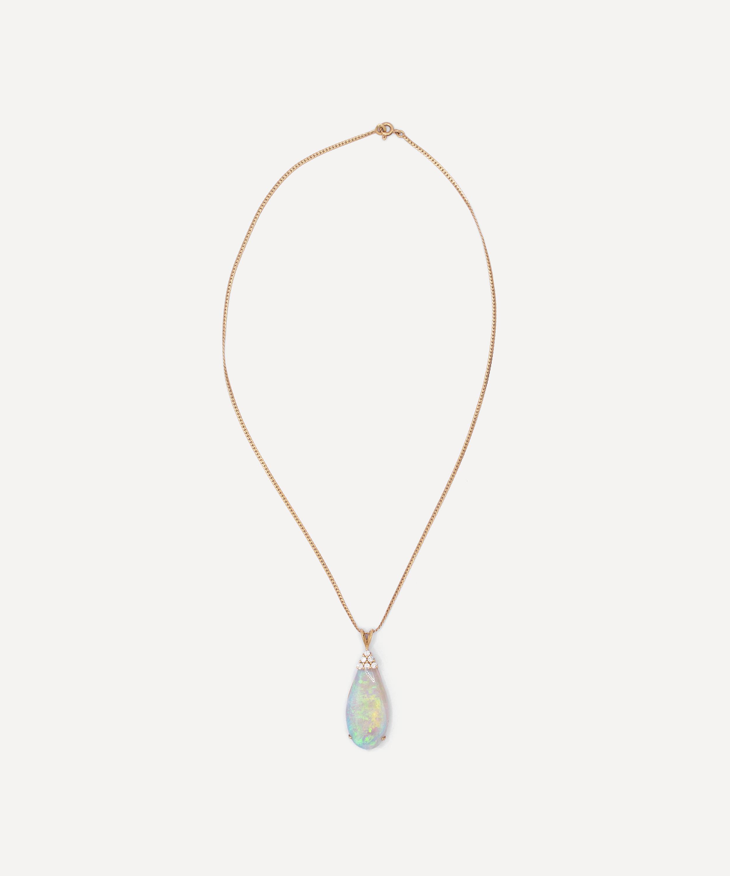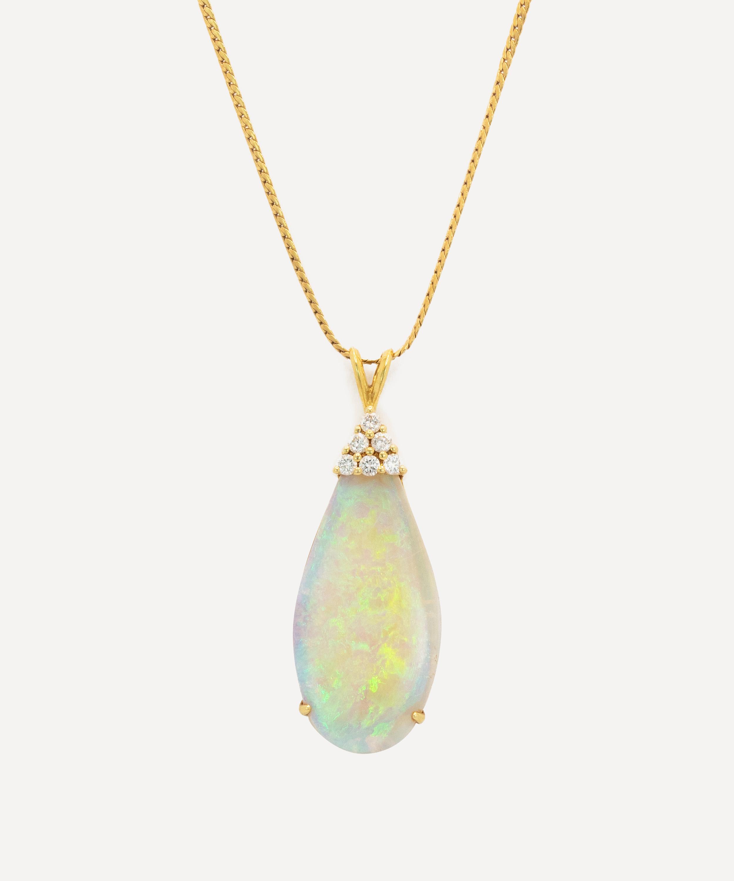 Rendered in 18ct gold, it features a fine chain and pear-shaped cabochon opal, exhibiting a striking play of colour, topped with six round brilliant cut diamonds, adding a touch of sparkle above the vibrant centrepiece. Whether worn as a statement of refinement or a whisper of vintage charm, it will steal the spotlight and elevate every ensemble with its undeniable presence.