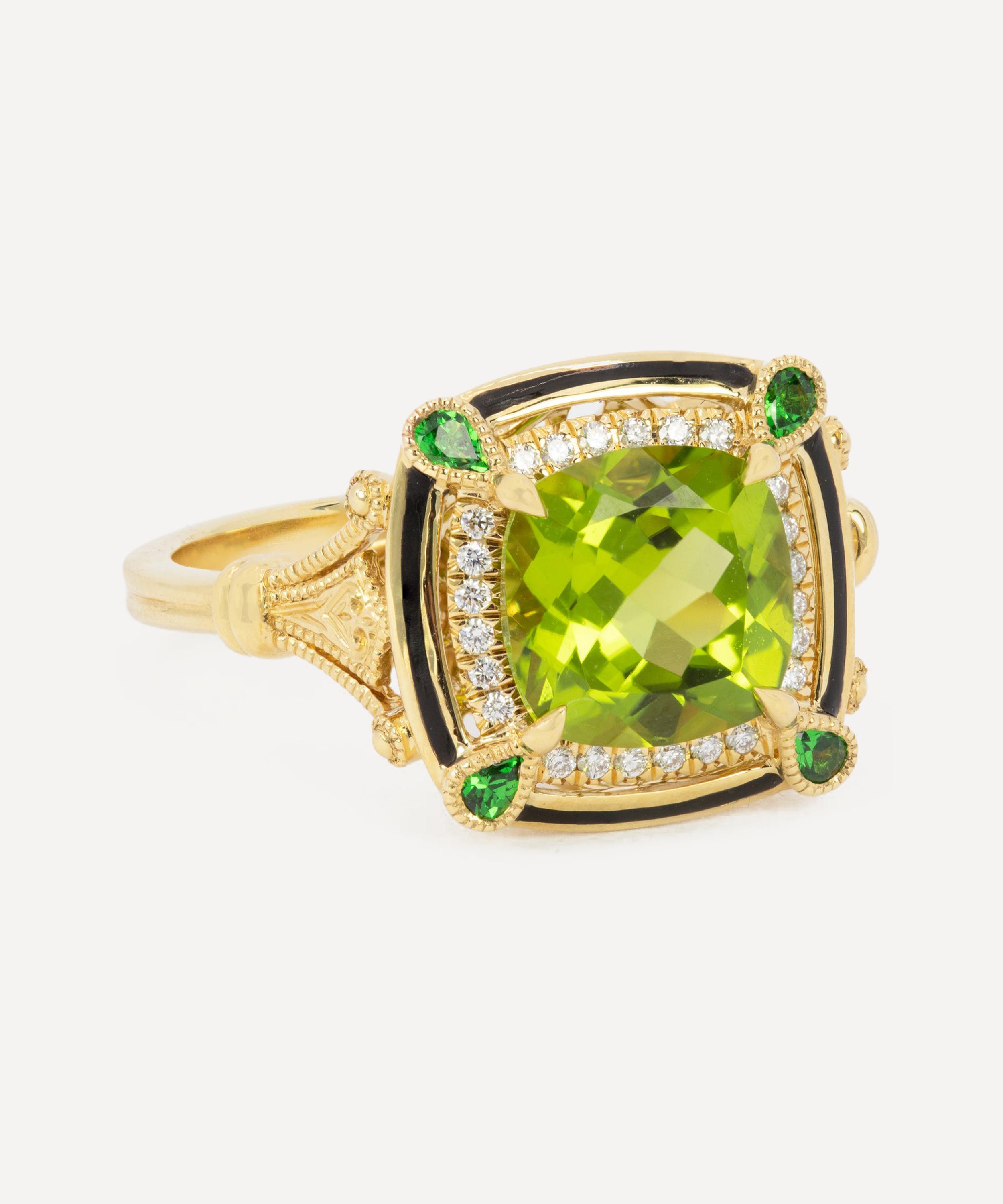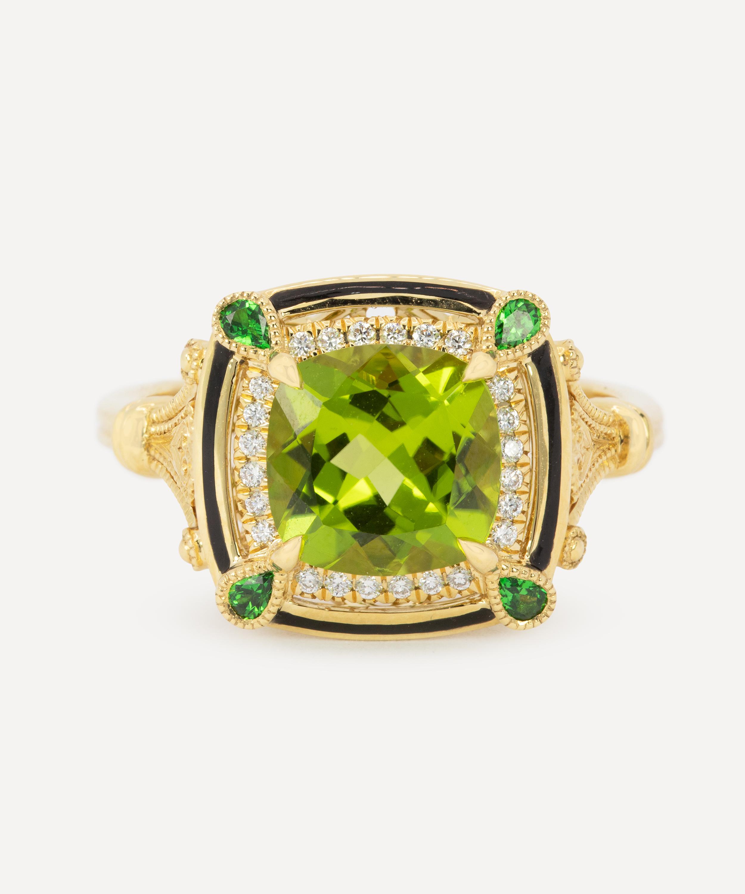 Drawing from the Art Deco period, this cocktail ring is crafted from 18 carat gold – featuring a cushion cut peridot in a prismatic green colour, enclosed by a halo of round, brilliant-cut diamonds. A modern design from Kojis, the ring is further characterised by a delicate border in black enamel, surrounding the diamonds, adorned with a pear-cut tsavorite garnet in each corner. Complete with decorated shoulders and gallery, it comes together with a double-barrel band – creating an elegant statement piece to be worn on its own, or teamed with the matching earrings for an outstanding ensemble.