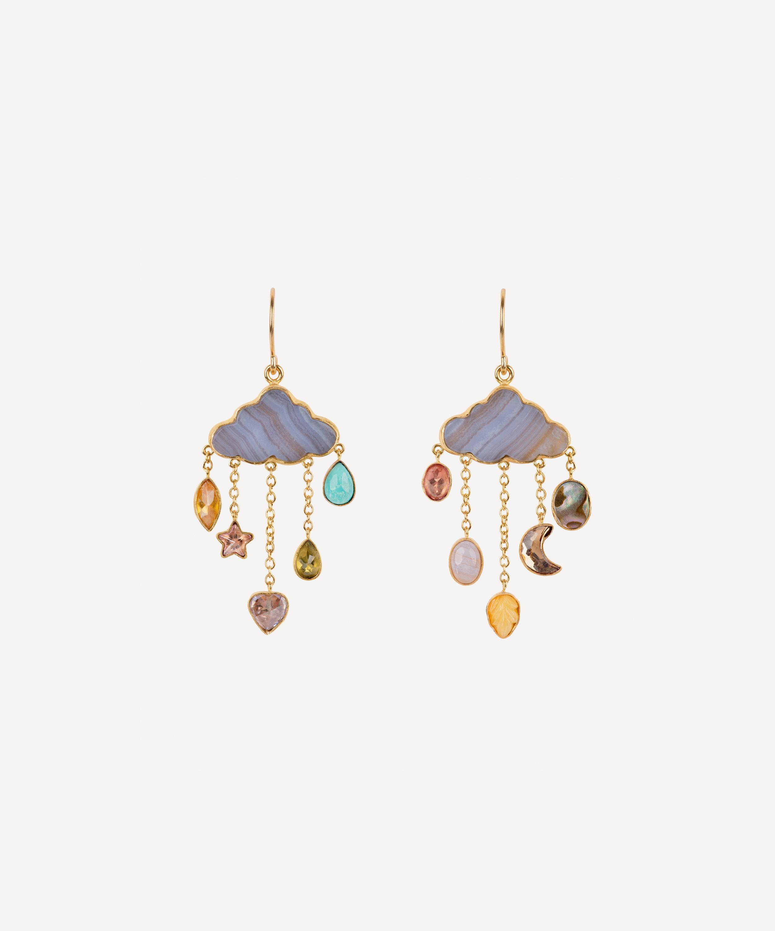 These asymmetric Cloud And Rain drop earrings offer an eclectic example of Grainne Morton's signature sculptural, chandelier-style designs. Each of these earrings feature a blue agate cloud with a cluster of graduating chains and mismatched, multi-coloured gems falling from the base like rain.