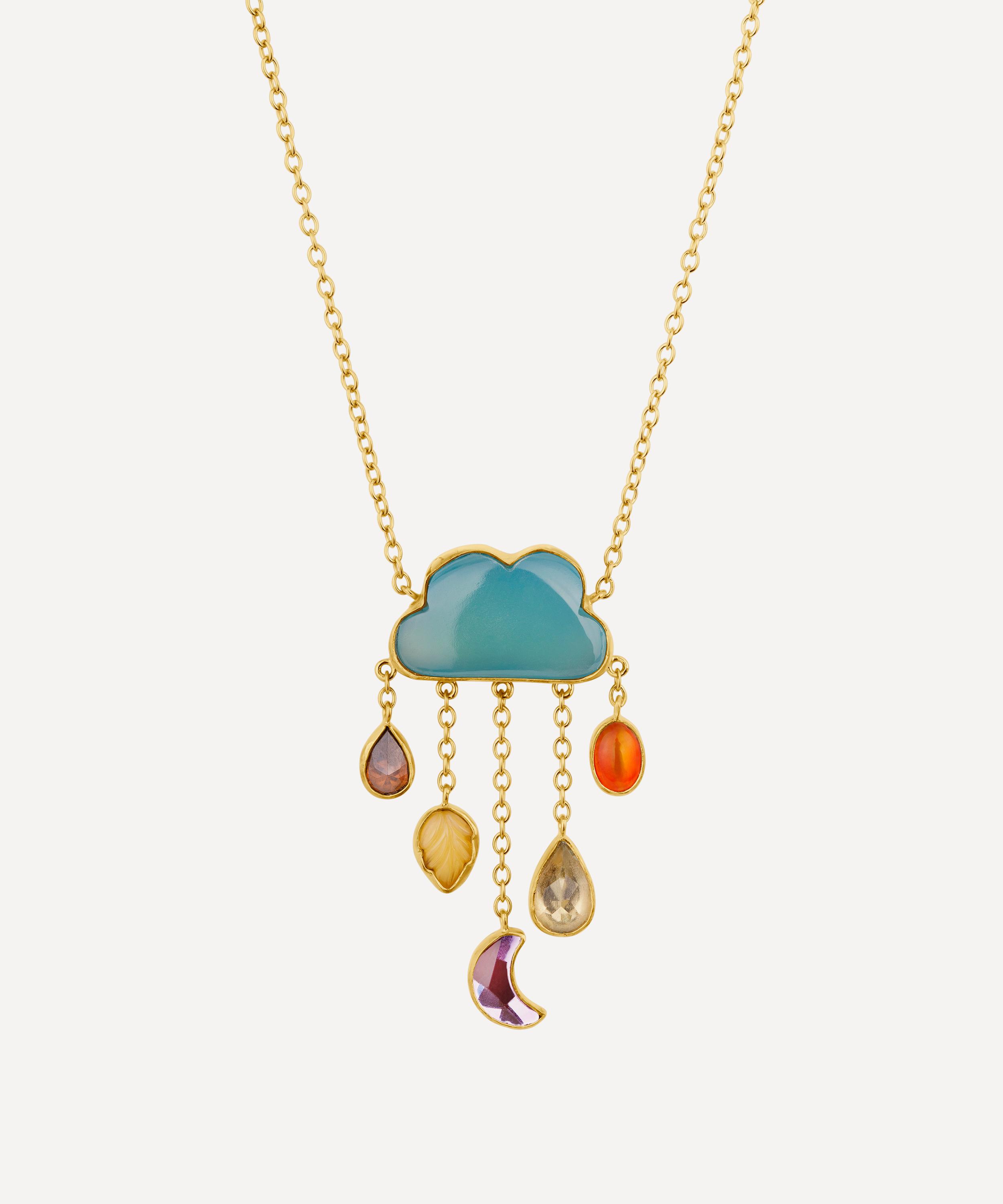 Part of the beloved cloud and rain collection, this eye-catching necklacehas been handmade in Edinburgh from 18ct gold-plated silver, featuring a vibrant blue chalcedony cloud with a cluster of graduating chains and mismatched, multi-coloured gems falling from the base to evoke sparkling rain drops.