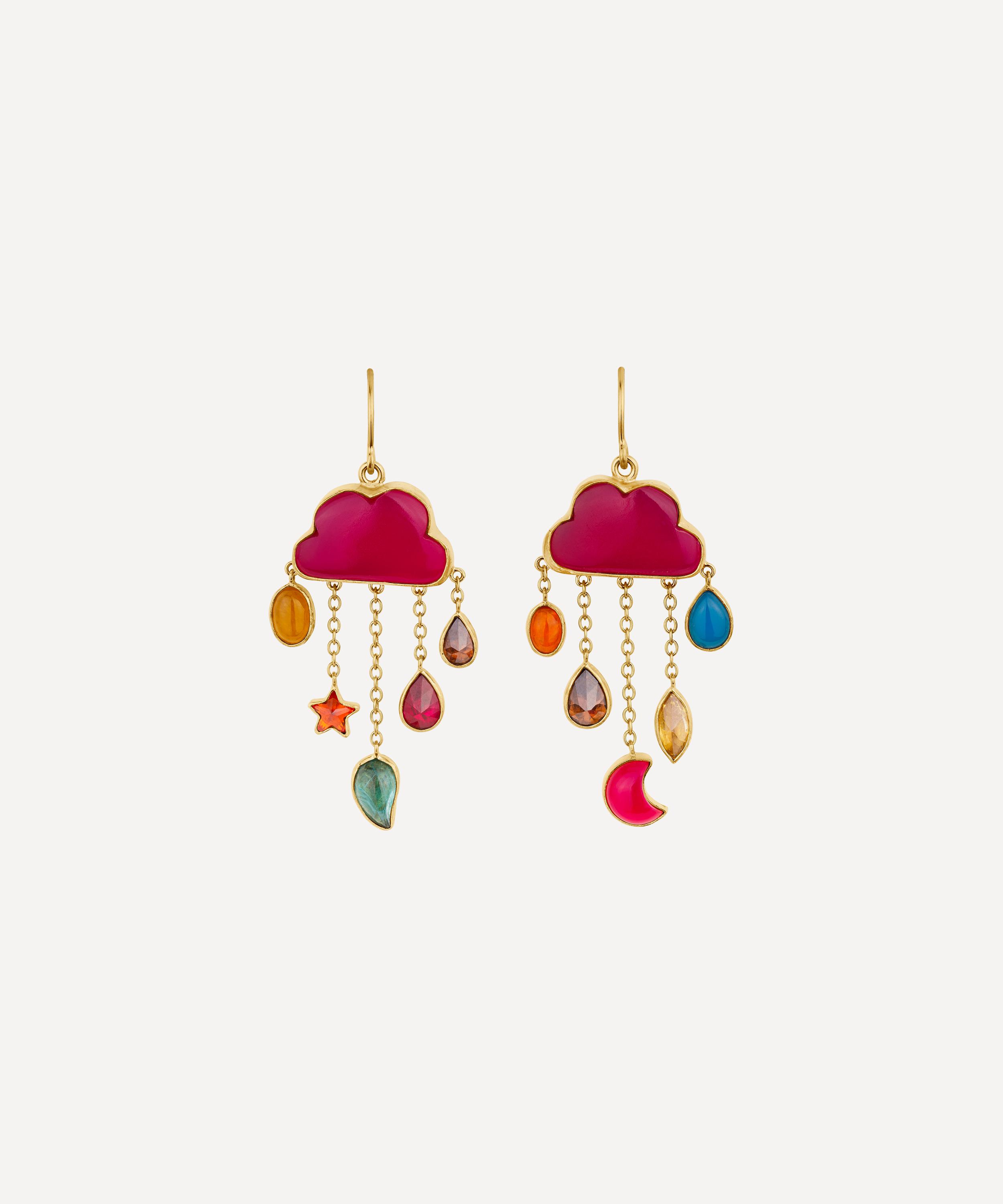 Part of the beloved cloud and rain collection, these eye-catching earrings have been handmade in Edinburgh from 18ct gold-plated silver, featuring a vibrant rani chalcedony cloud with a cluster of graduating chains and mismatched, multi-coloured gems falling from the base to evoke sparkling rain drops.