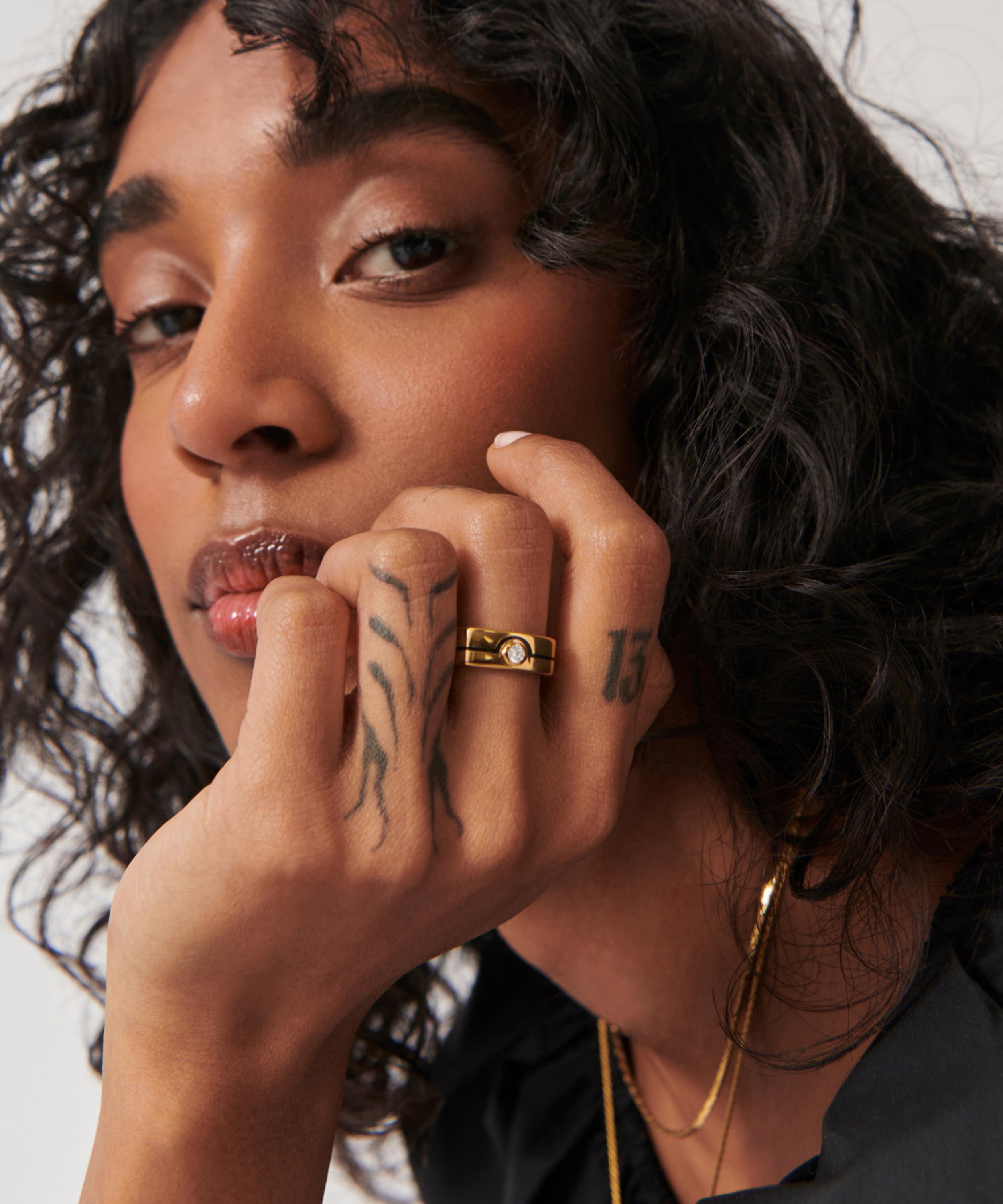 Crafted from 18ct gold-plated brass, it’s characterised by a wide, slightly square silhouette, accented with hand-painted black enamel line detailing, and a sparkling round cubic zirconia centre stone. The best of the past, reimagined for today - wear it solo, or team with the beaded rings from the collection.