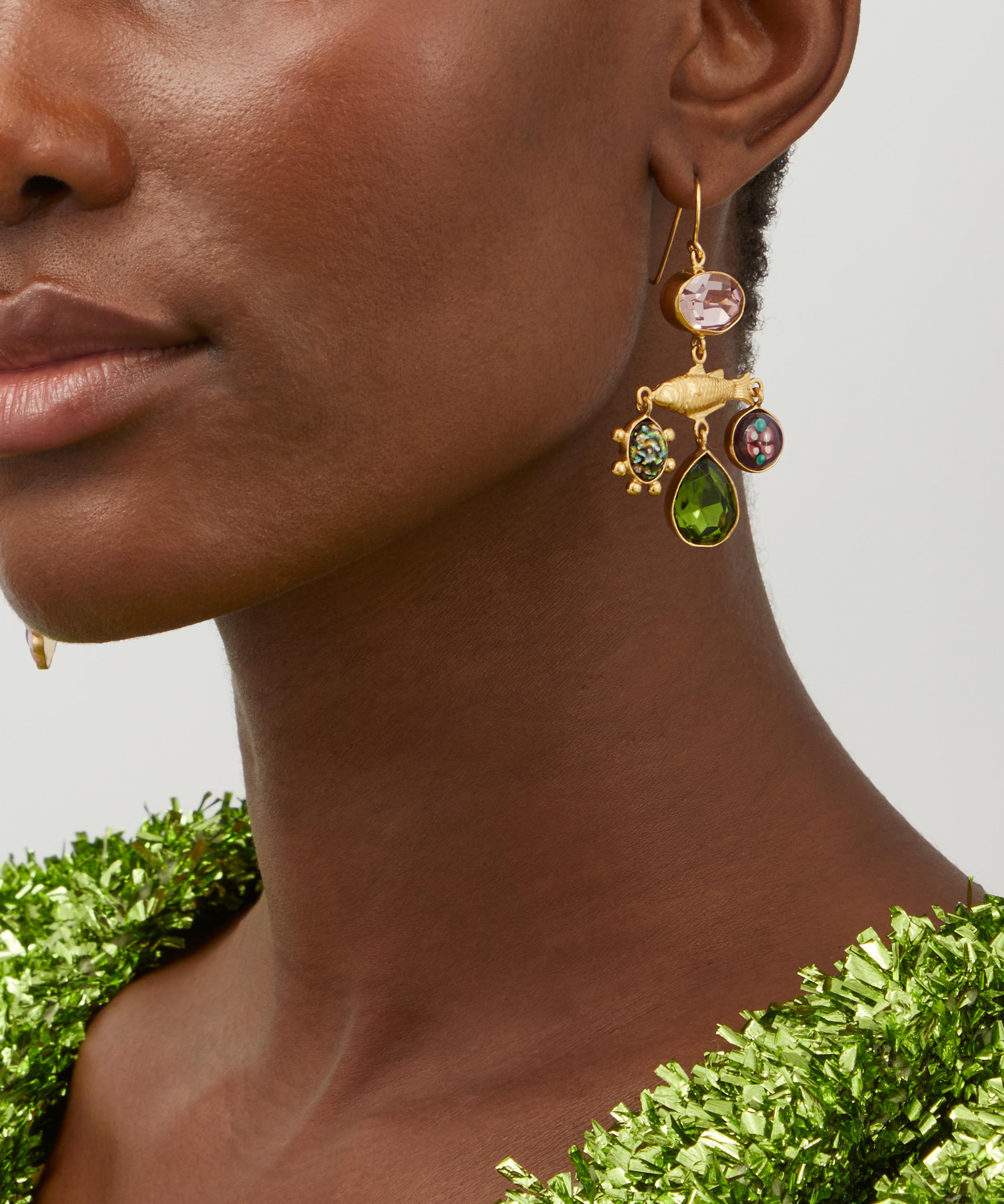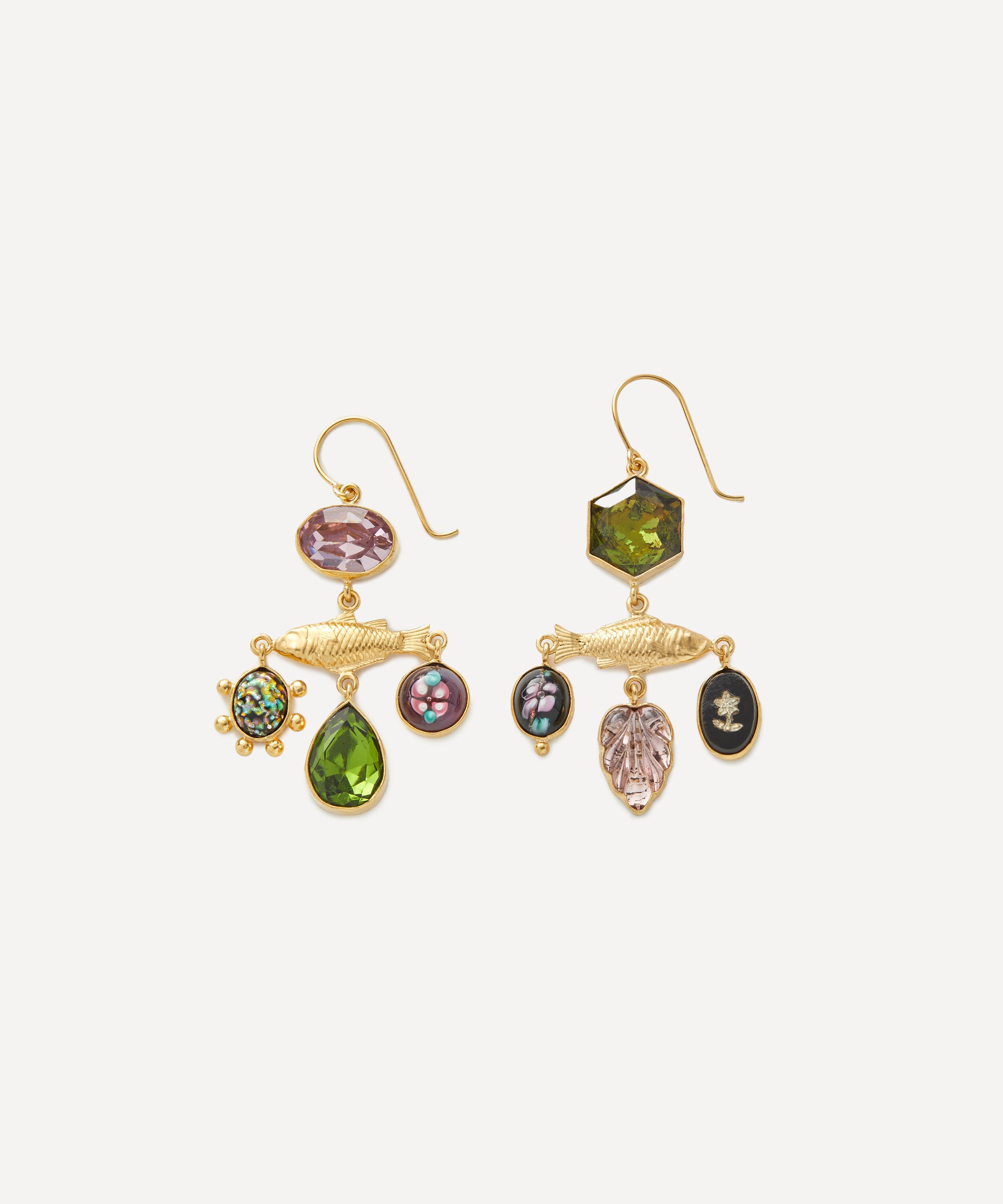 A signature style from Grainne Morton, these drop earrings offer a whimsical, dreamy addition to your daily line-up. Handmade in Edinburgh from 18ct gold-plated silver, each earring features a chandelier-style design composed of a fish motif and assorted charms. Finished with a classic hook fastening, they boast an unexpected juxtaposition of vintage and contemporary styles - perfect for adding visual interest to everyday looks.