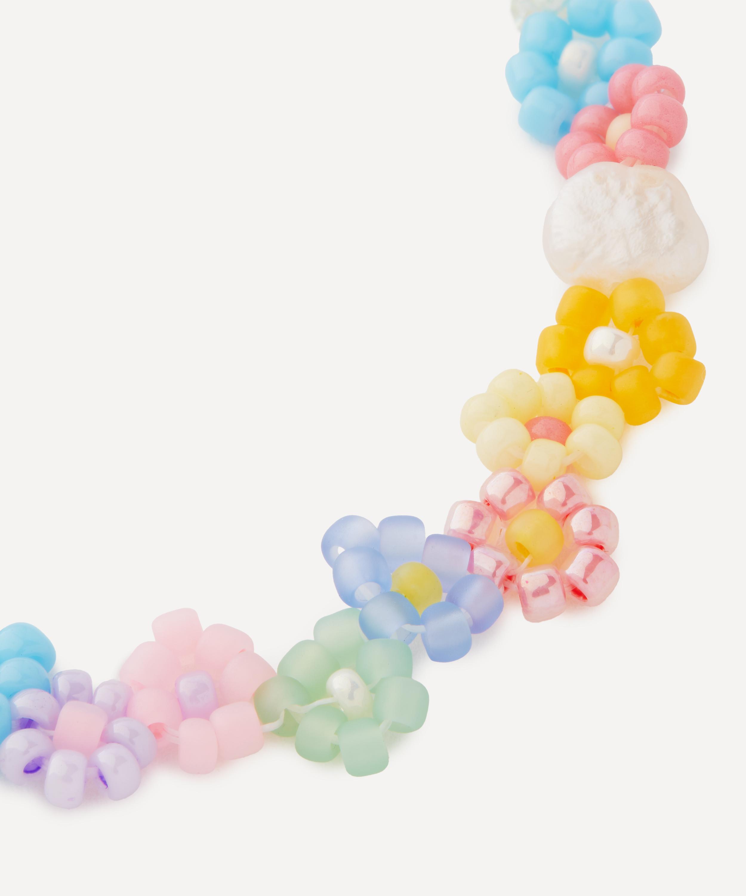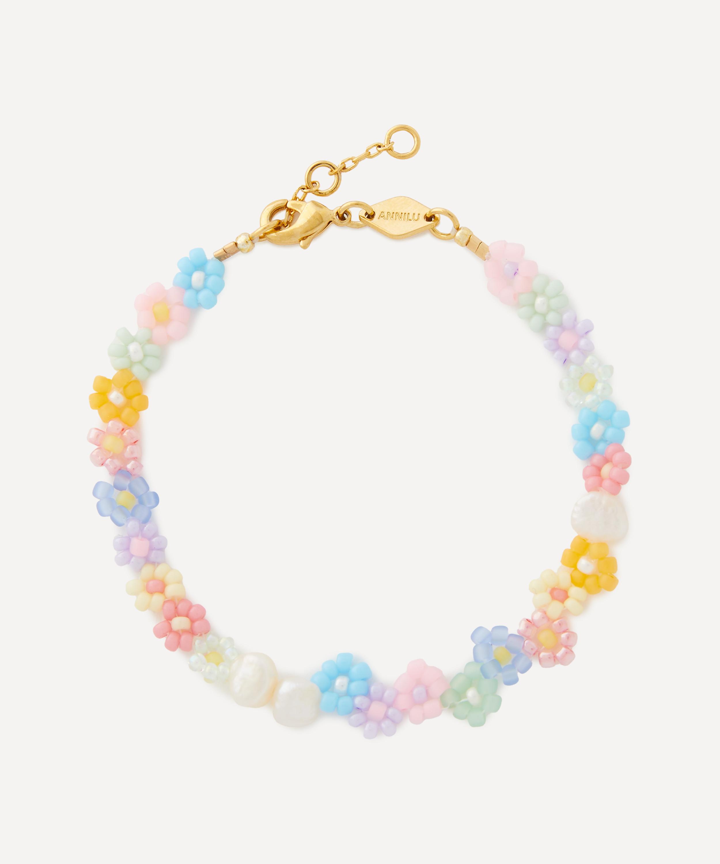 Add a touch of boho glamour to your look with the Fleur bead bracelet from Anni Lu. Handcrafted from 18ct gold-plated brass, it features a string of opulent freshwater pearls and delightful beaded flowers made using the traditional Mexican Huichol technique. Style it solo or stacked.