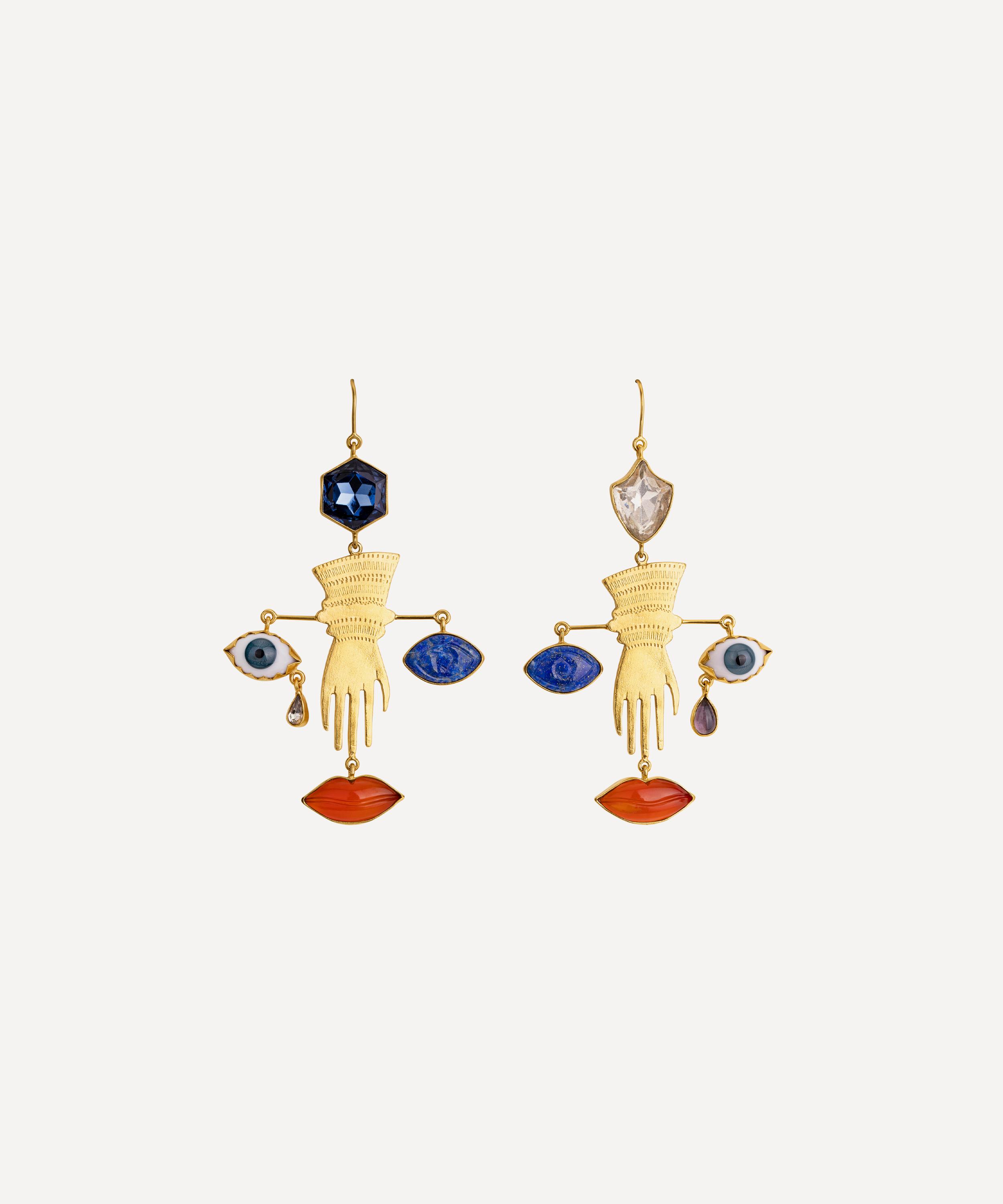 Handmade in Edinburgh from 18ct gold-plated silver, these statement earrings feature a chandelier-style design composed of a dropped glove-shaped charm falling from a sparkling rhinestone, and are complete with eyes and lips, creating a charming face design. Finished with a classic hook fastening, they boast an unexpected juxtaposition of vintage and contemporary styles – perfect for adding visual interest to everyday looks.