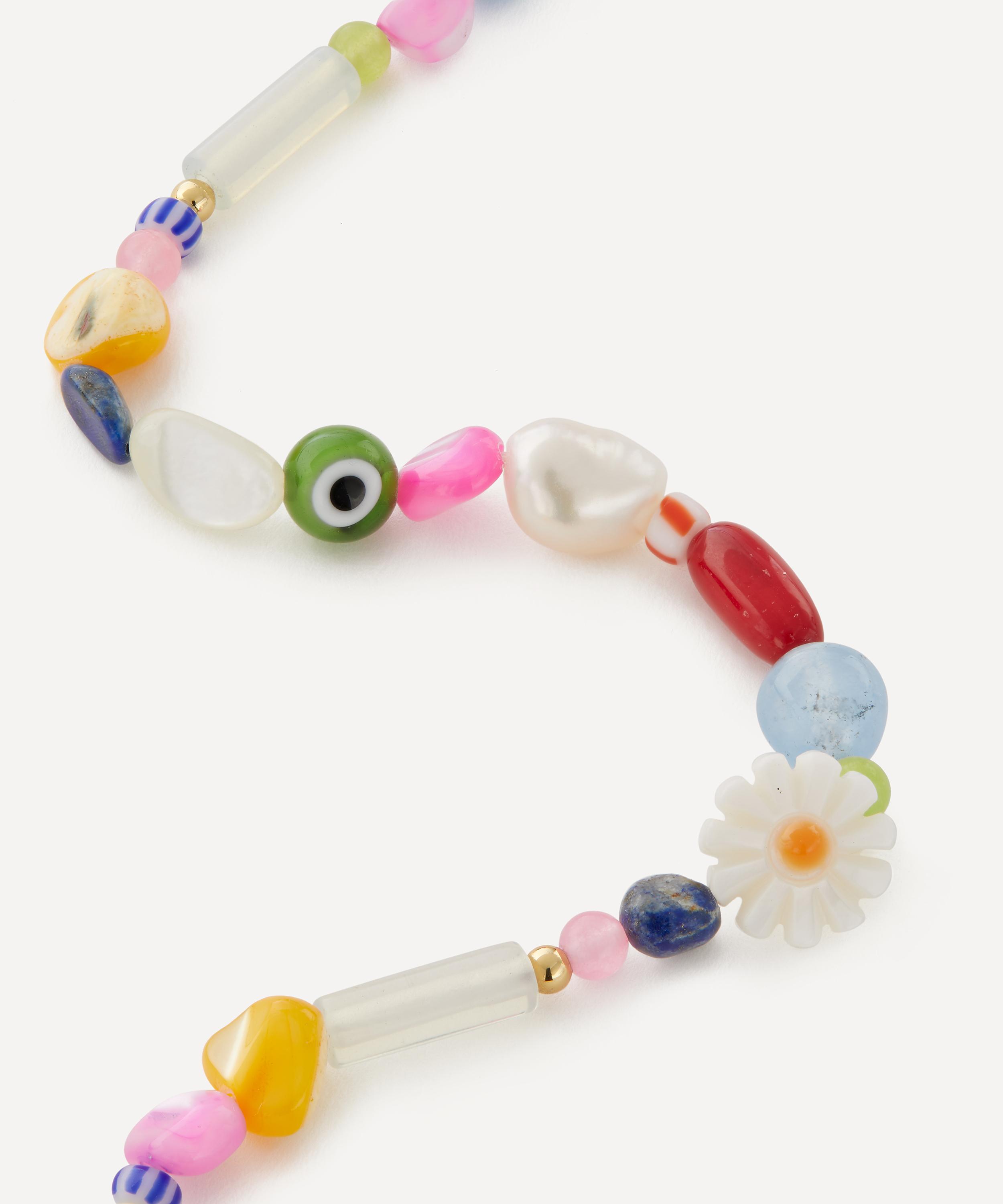 Add a touch of boho glamour to your look with the Happy bead necklace from Anni Lu. Handcrafted from 18ct gold-plated brass, it features a playful assortment of colourful glass and gemstone beads, interspersed with opulent mother of pearl – capturing the joy and carefree spirit of summer. Style it solo or stacked.